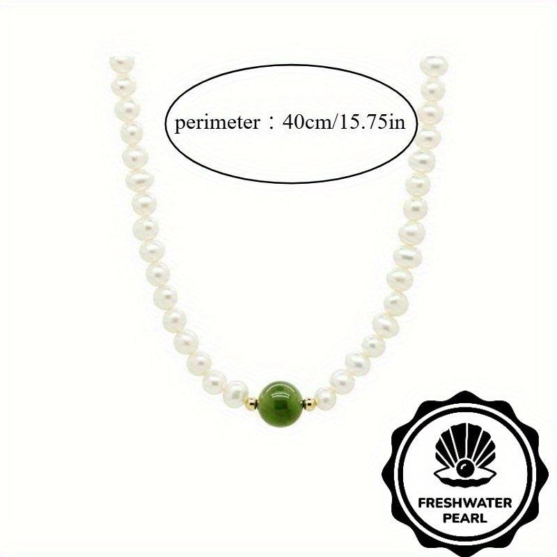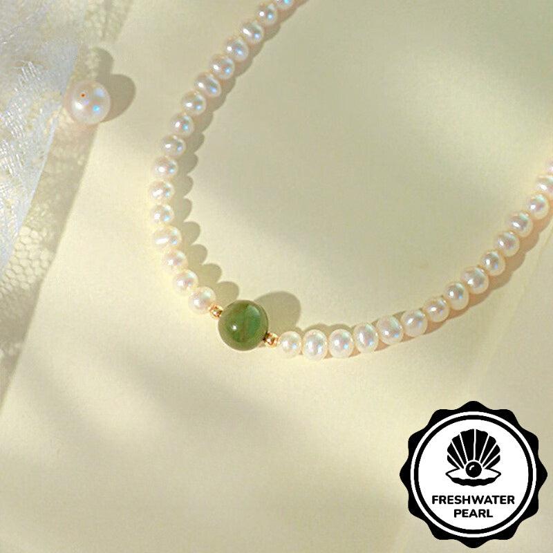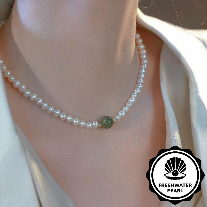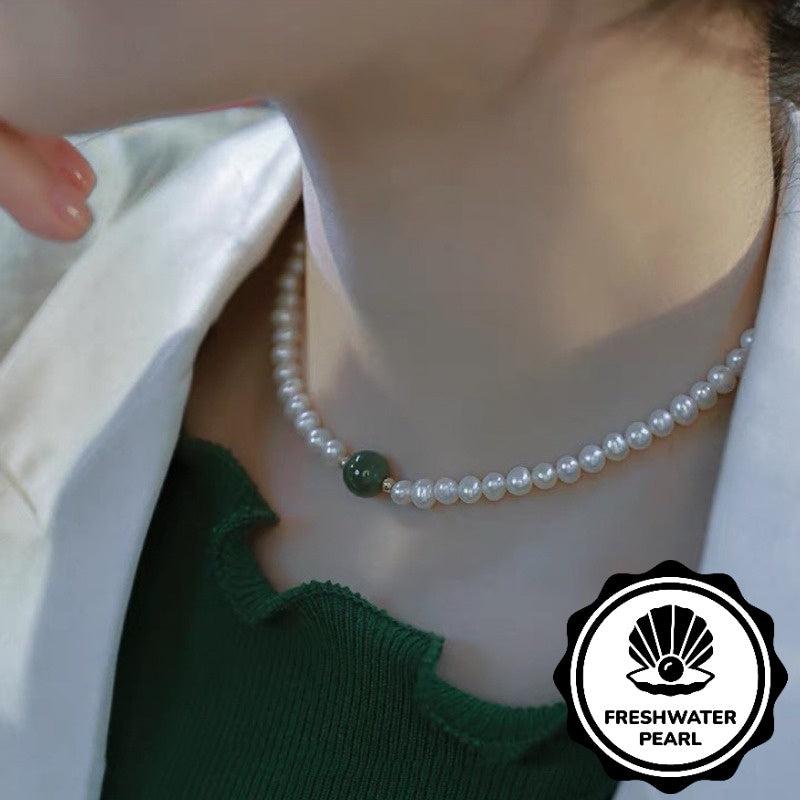 Elegant freshwater pearls necklace paired with green artificial jade to bring luck and happiness on 11 special occasions.