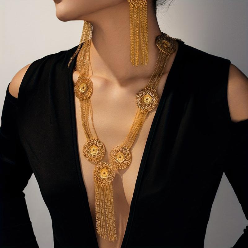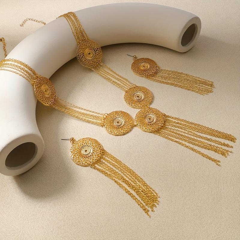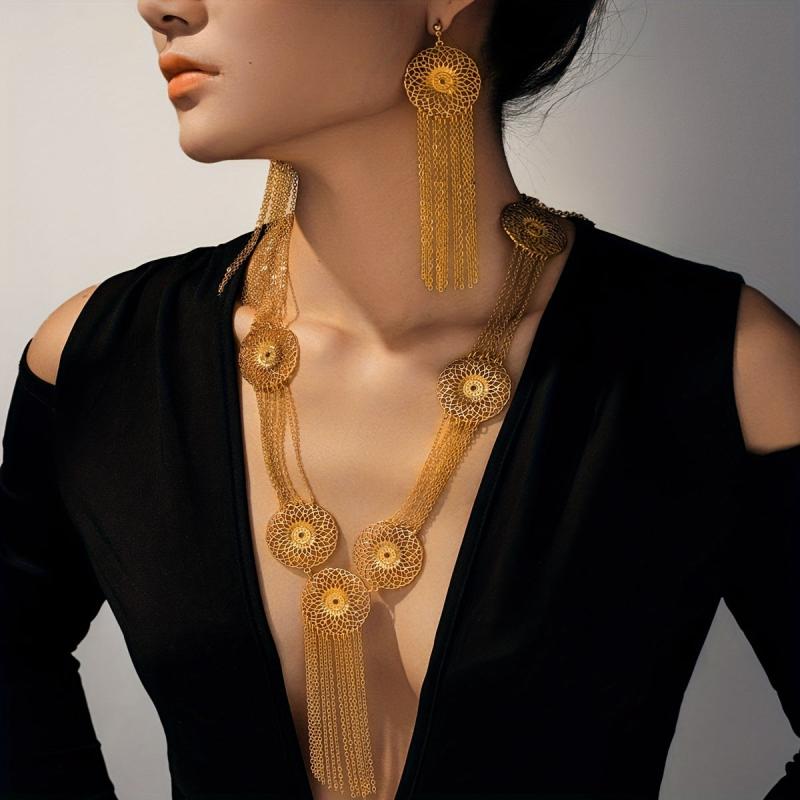 This two-piece jewelry set includes a geometric hollow pattern necklace and layered tassel earrings in a metallic disc style, perfect for adding a touch of elegance to your look.