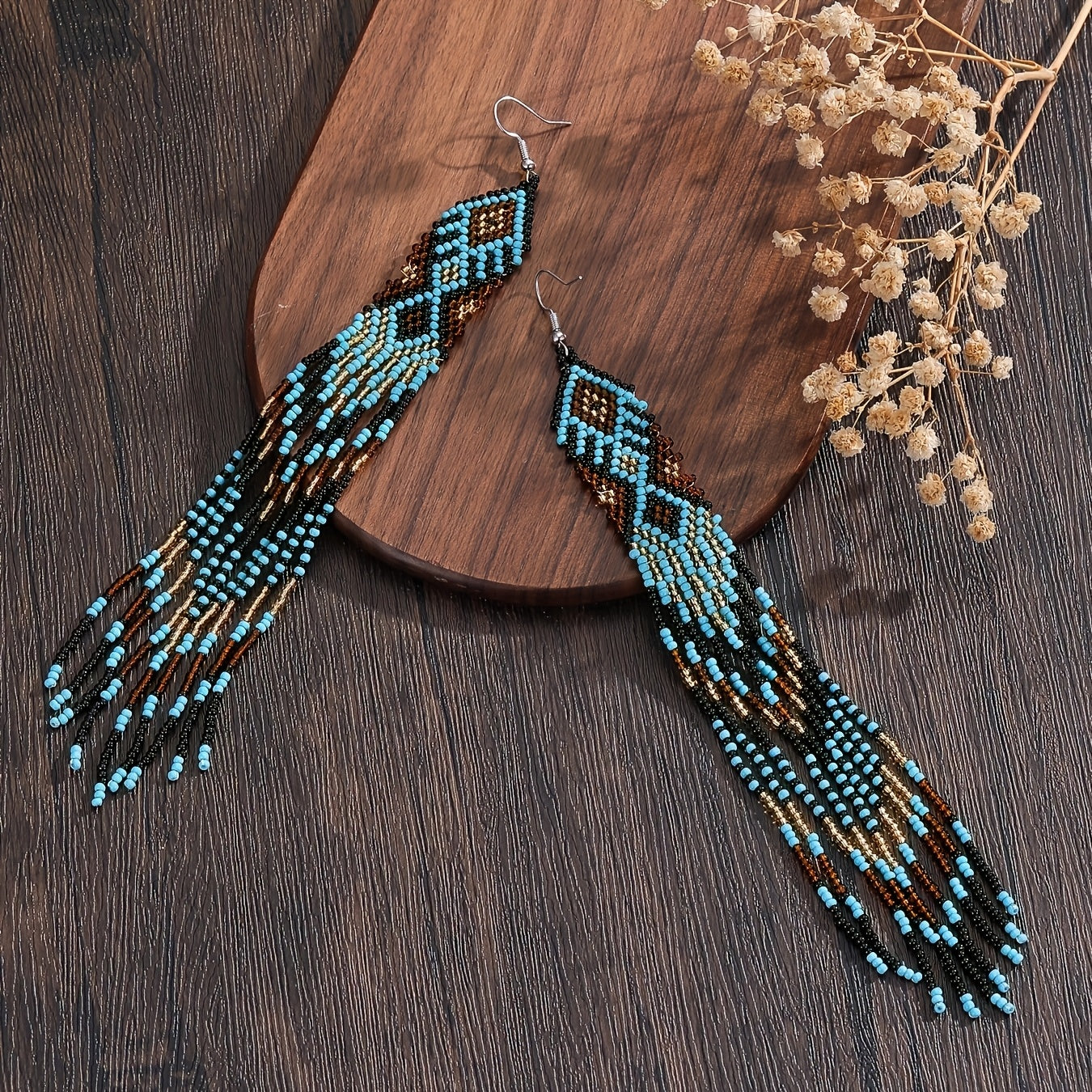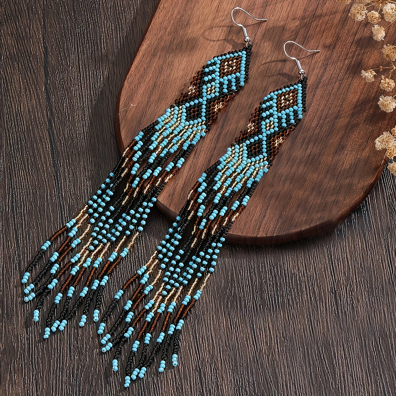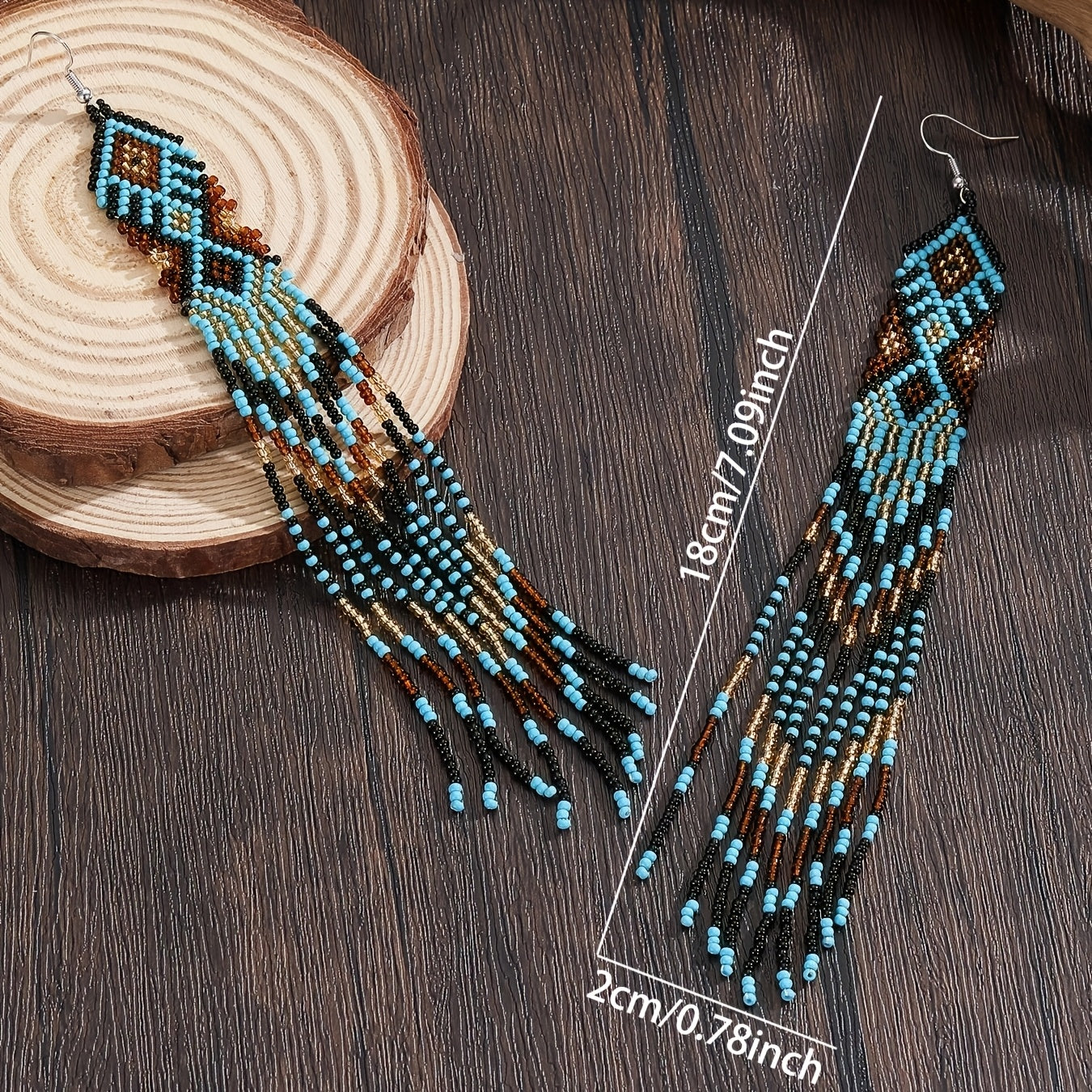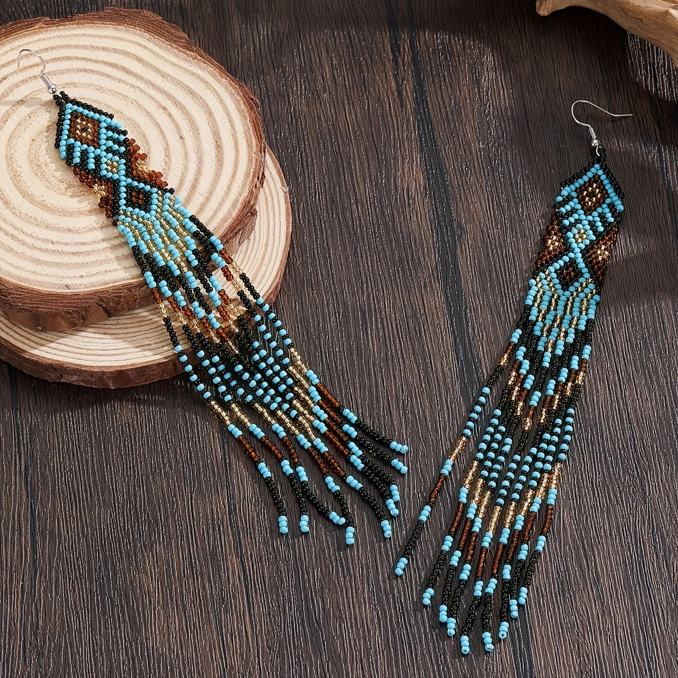 Elevate your style with these boho dangle earrings featuring rhombus and teardrop glass beads. Perfect for adding a touch of bohemian chic to any outfit.