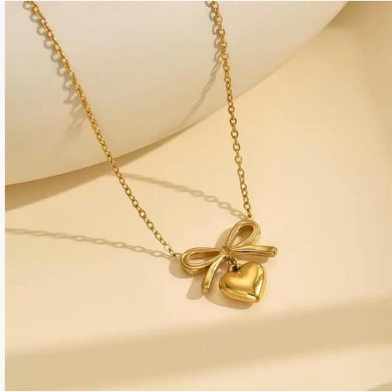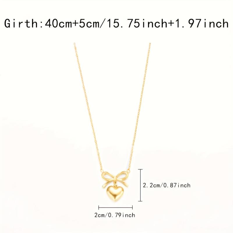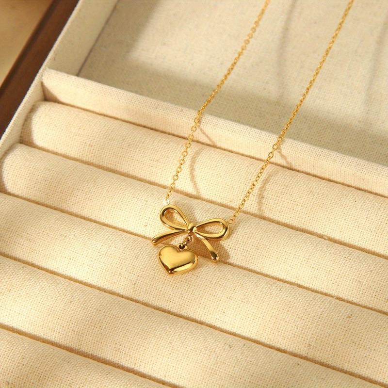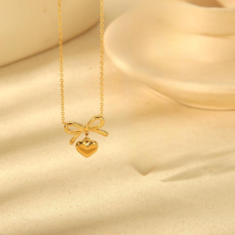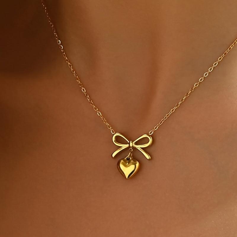 Elegant and stylish necklace featuring a golden bow and heart pendant, made of high-quality stainless steel. Perfect for adding a touch of charm to any outfit.