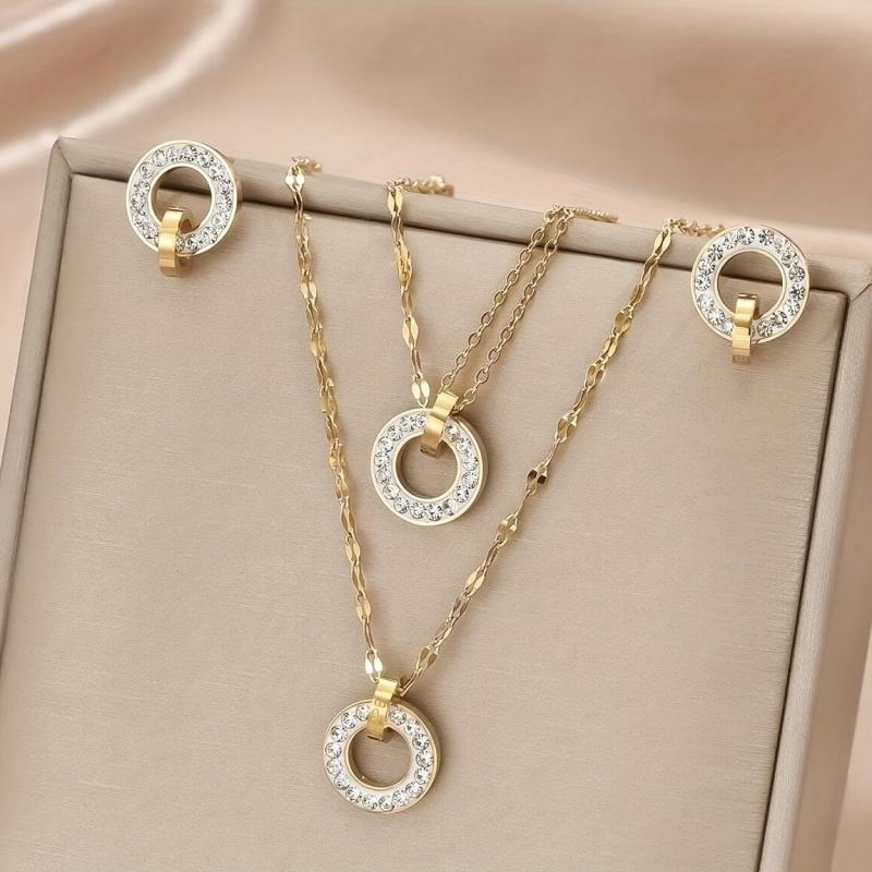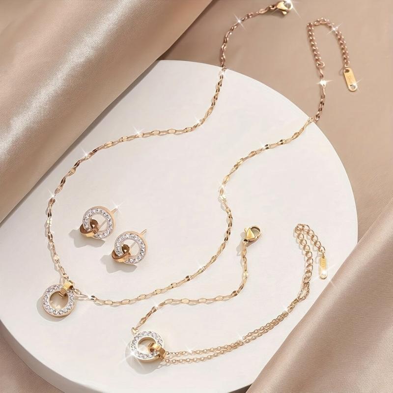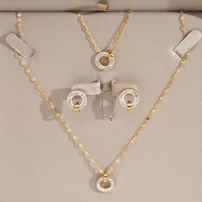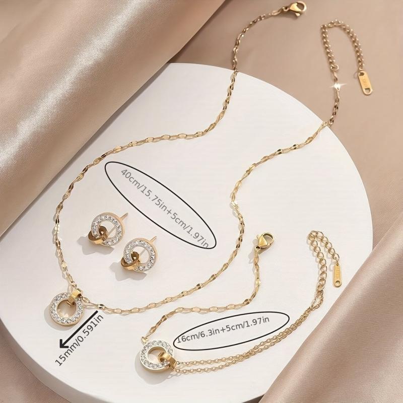 This elegant 4-piece set features a golden stainless steel plated design with cubic zirconia stones. Versatile and fashionable, perfect for any occasion.