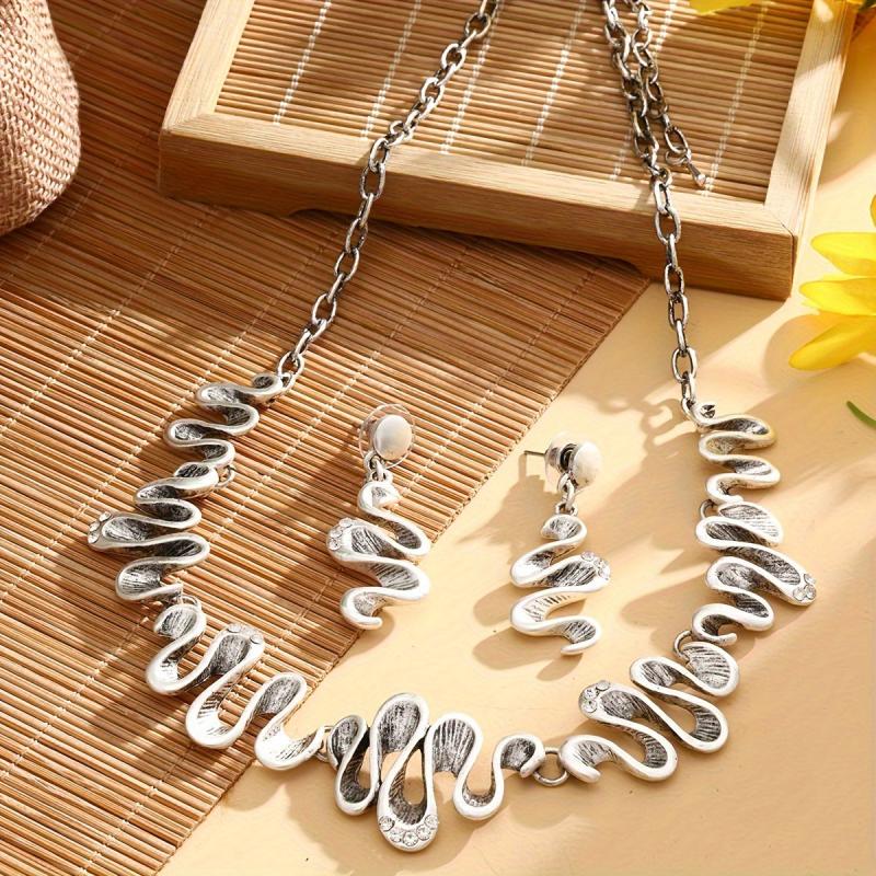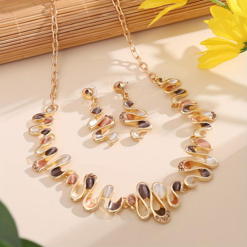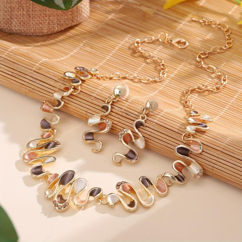 This elegant jewelry set includes 2 pairs of earrings and 1 necklace, made of zinc alloy with golden enamel inlaid with water drill in khaki and antique silvery retro geometric design.