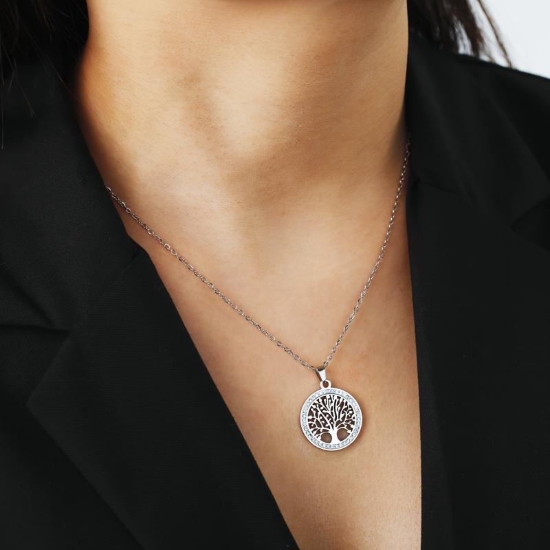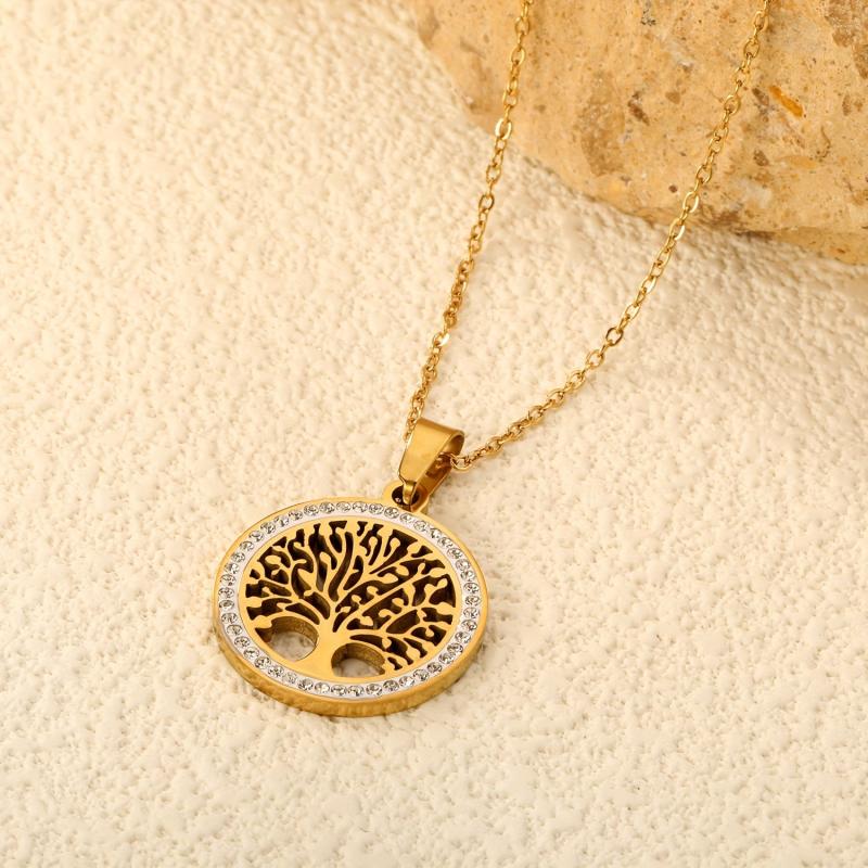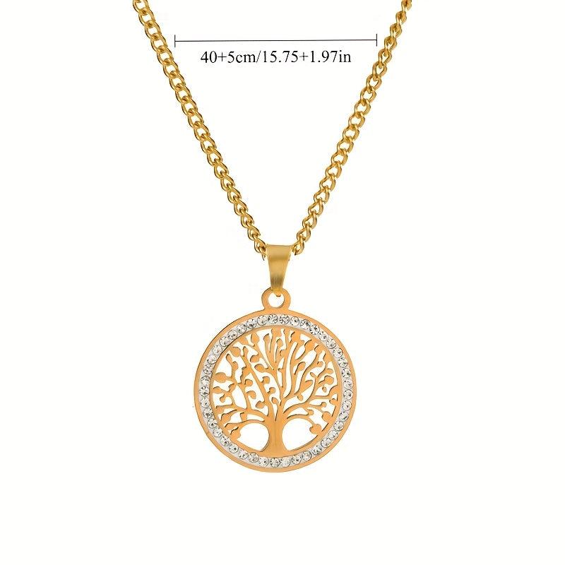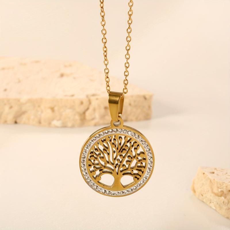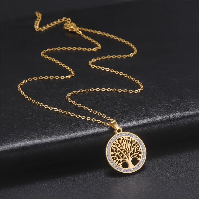 This necklace features a golden toned Tree of Life pendant on a sophisticated stainless steel clavicle chain. Ideal for casual attire and gifting accessory.