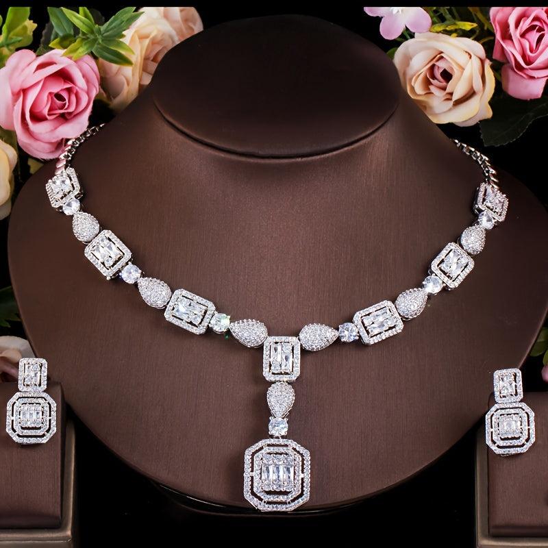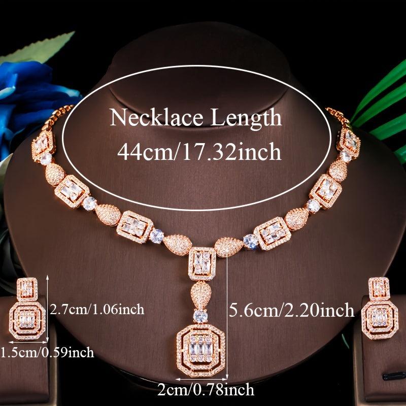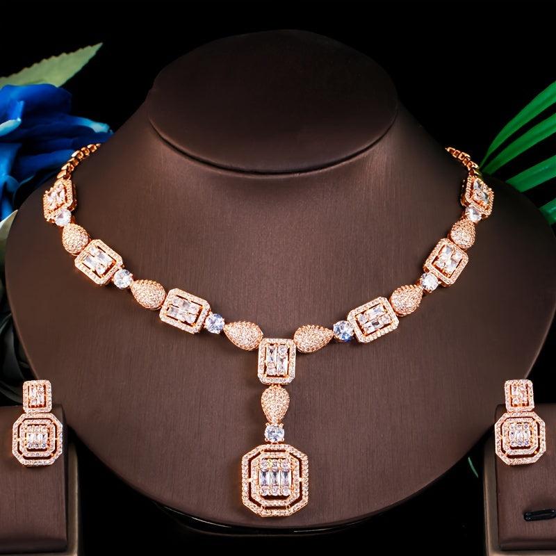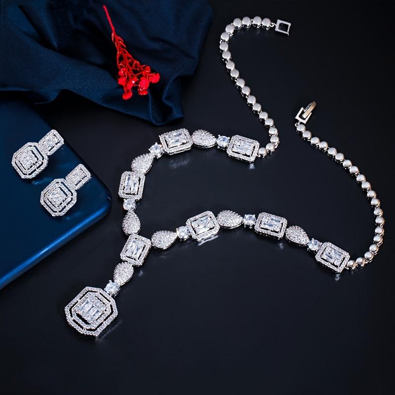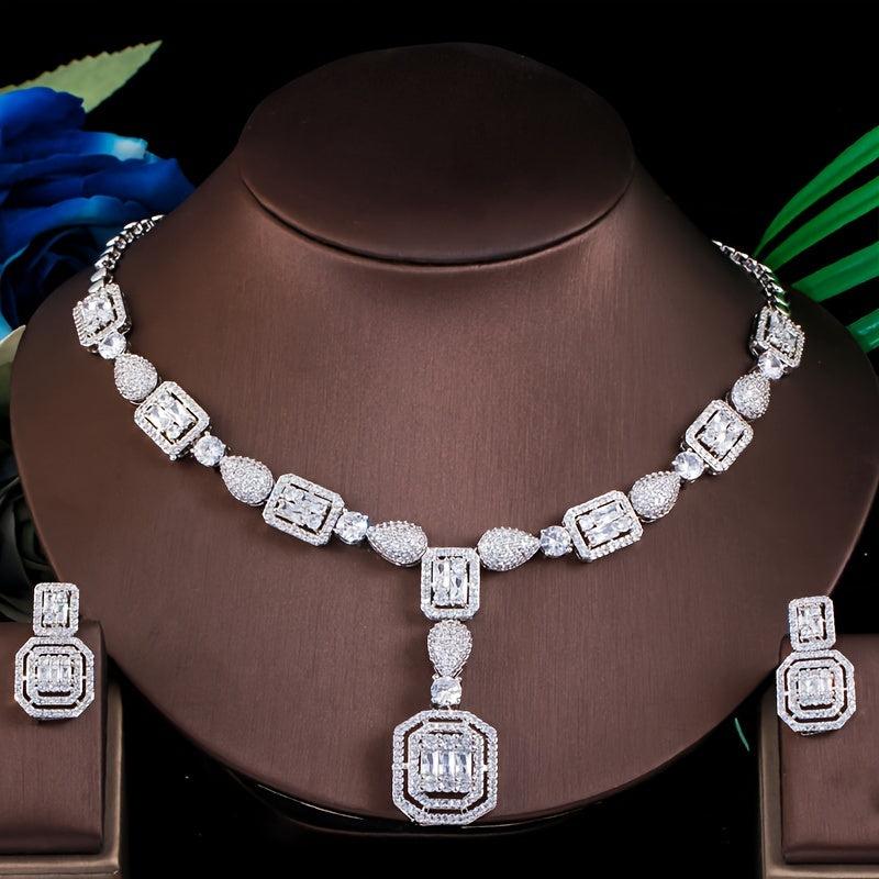 Elegant set with waterdrop & rectangle pendants, made with synthetic zirconia in a paved setting. Perfect for special occasions or daily wear.