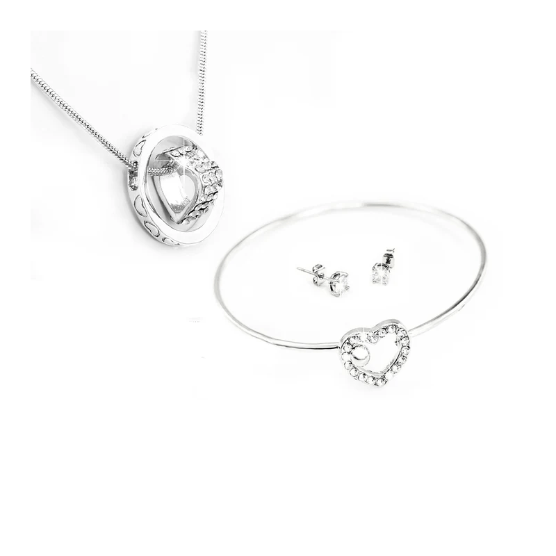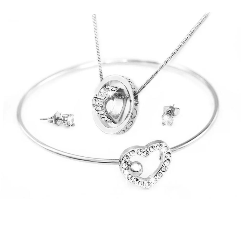 Complete your elegant look with this stunning silvery jewelry set featuring heart and crystal accents. Includes a necklace, bracelet, and earrings.