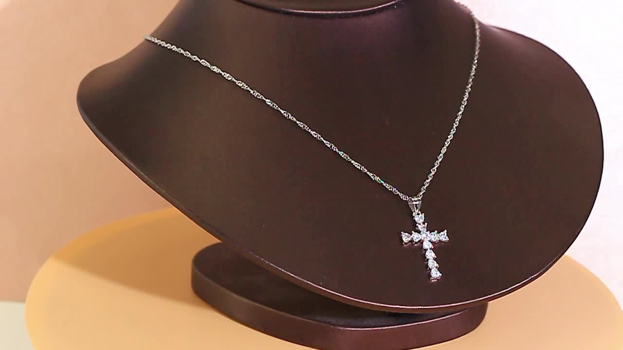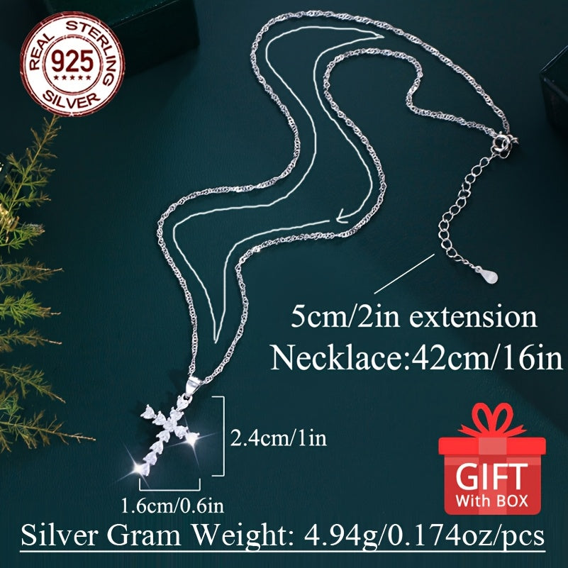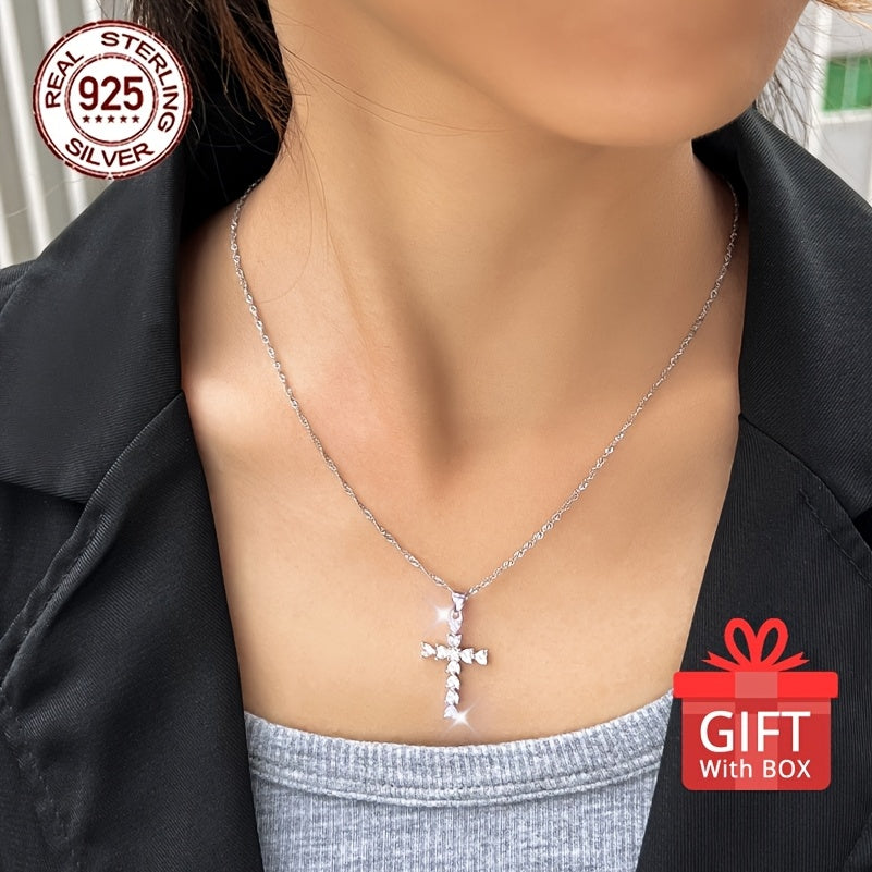 This elegant pendant necklace features a heart-shaped cubic zirconia inlaid cross design. Crafted from 925 sterling silver, it is hypoallergenic and perfect for women who love classic vintage religious accessories.