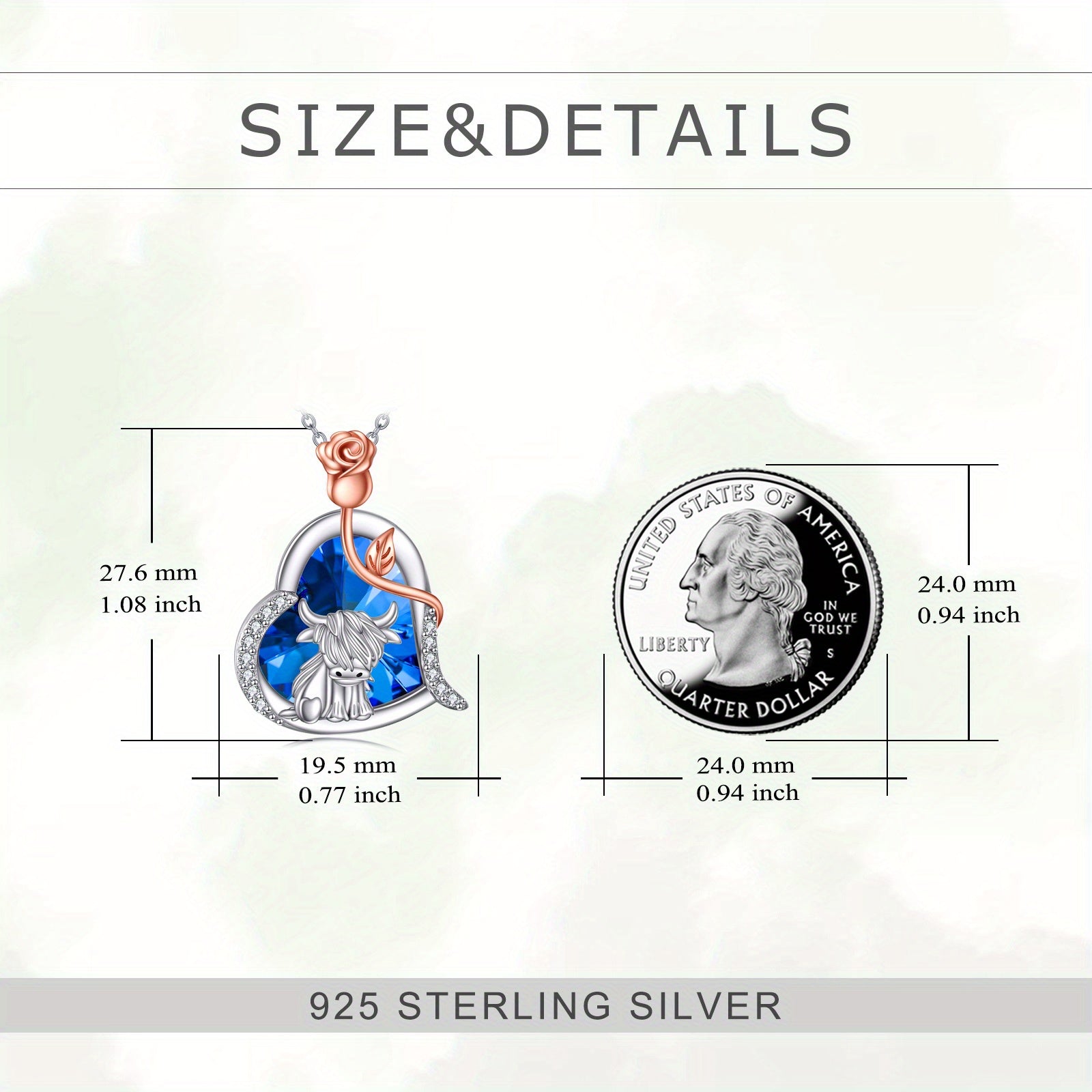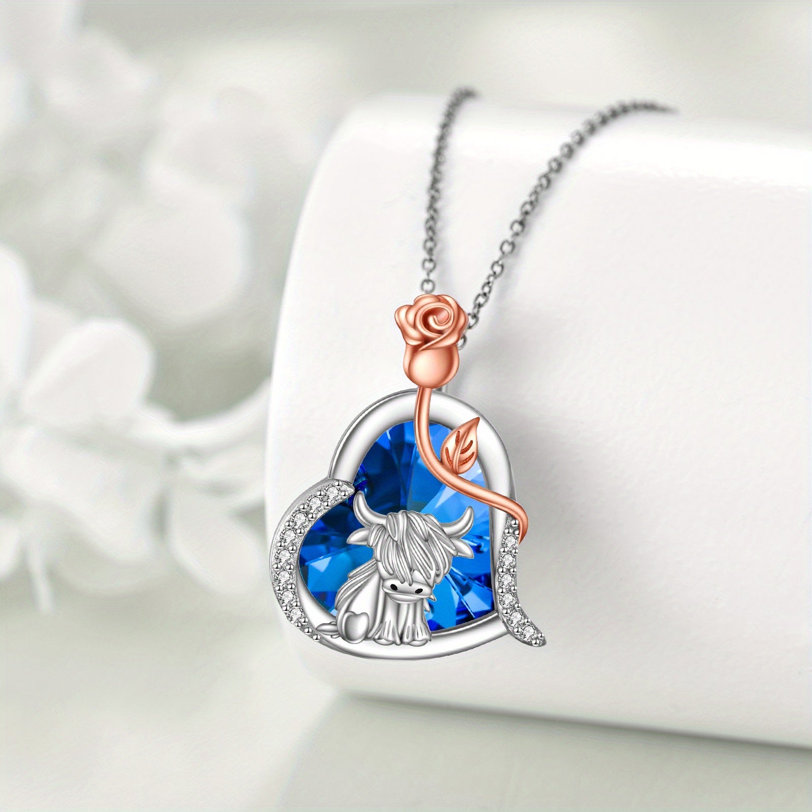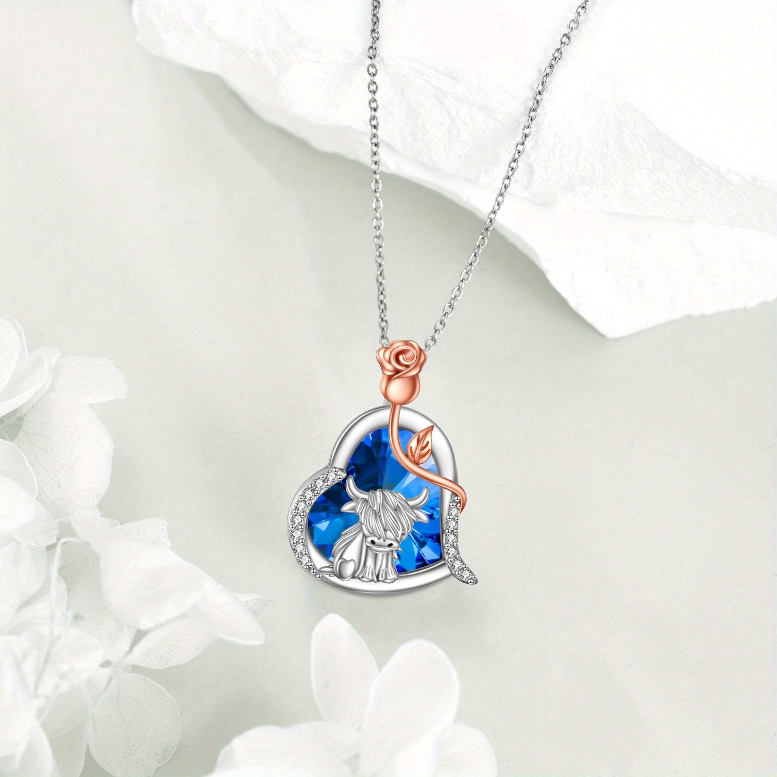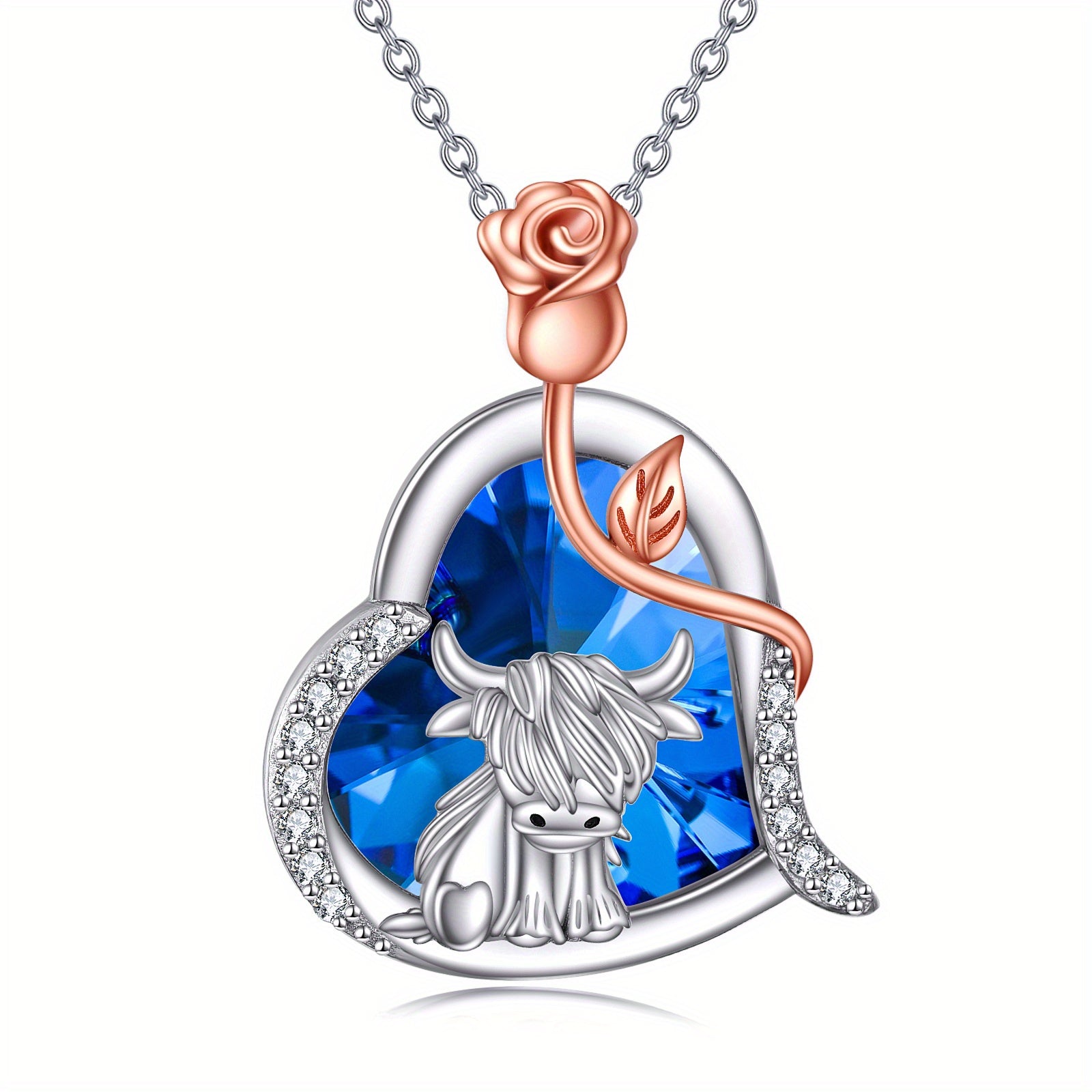 Elegant and charming Highland Cow Crystal Necklace made of sterling silver with a rose heart cow pendant. Perfect jewelry accessory for women who love animals.