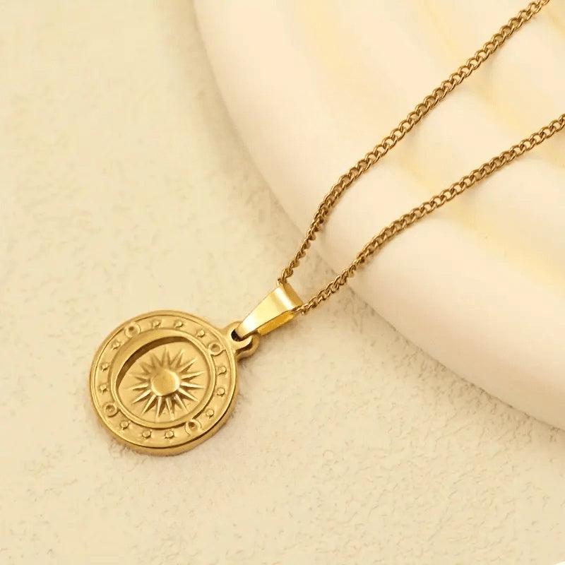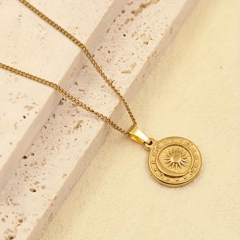 This pendant necklace is inspired by hip hop culture and features a sun, moon, and stars design. It is made of 316L stainless steel with an 18K golden plating, making it durable and versatile for all seasons. It is the perfect gift for hip hop enthusiasts.