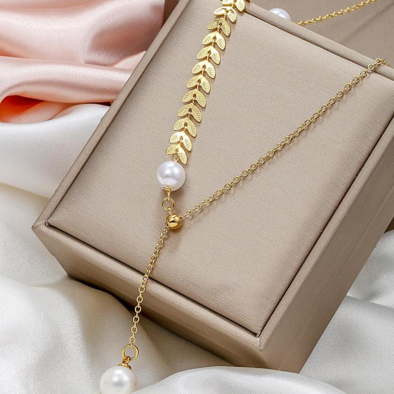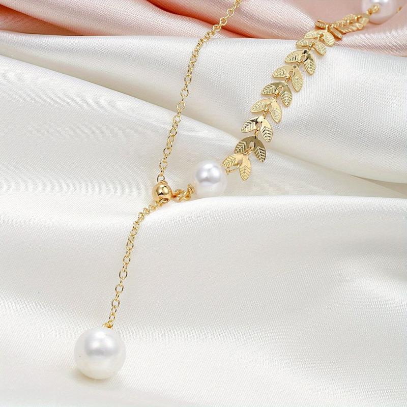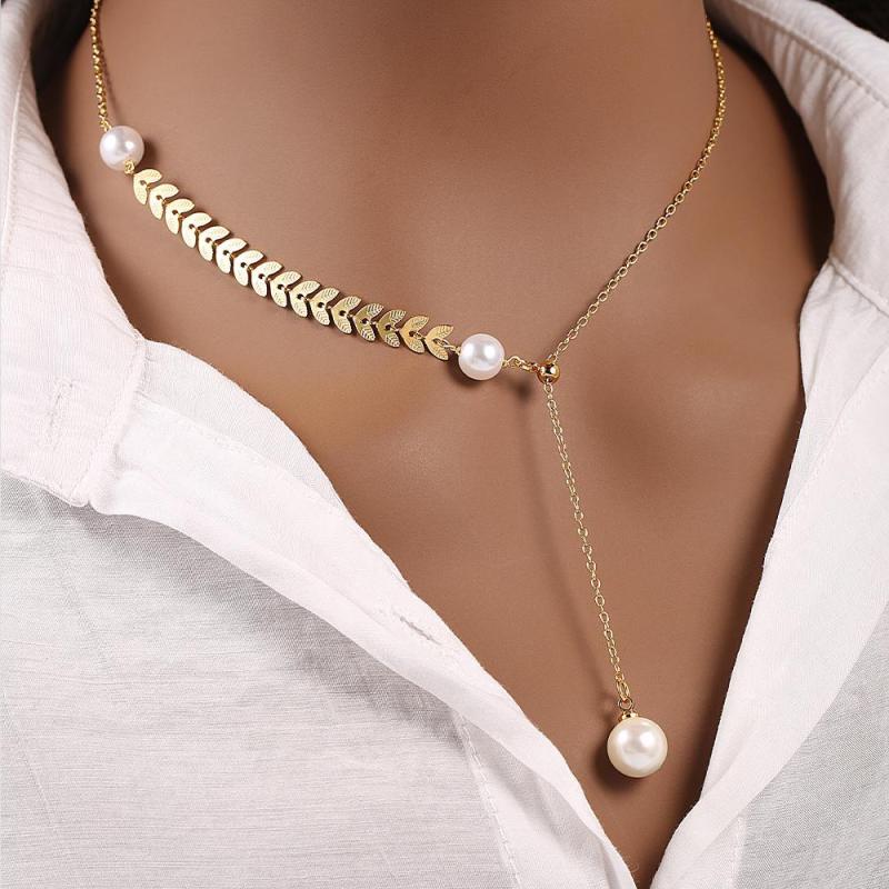 Elevate your style with this sexy and versatile leaf chain necklace. Crafted with 18K golden plated copper and adorned with a plastic mosaic pearl pendant, this necklace is perfect for daily wear in any season.