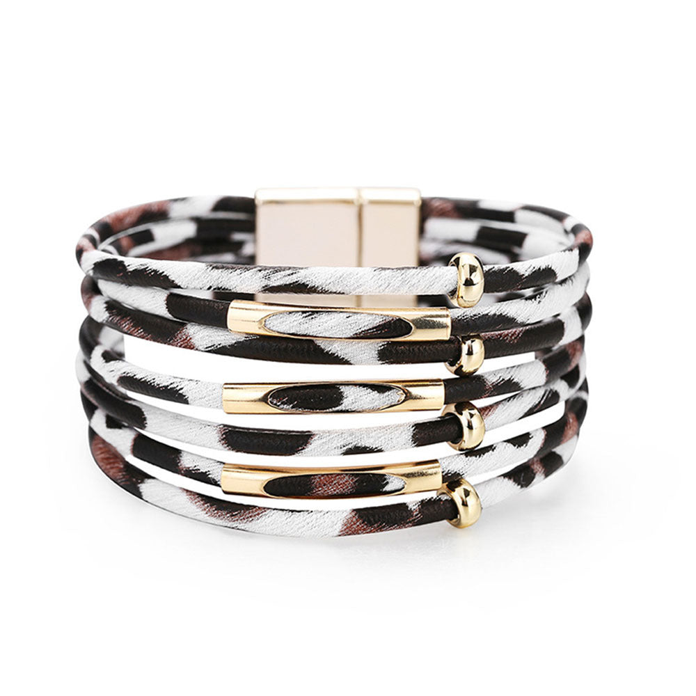 Add a touch of wild style with this leopard print PU leather wrap bracelet. Features a magnetic buckle for easy wear and a bohemian stackable design. Makes a great gift for jewelry lovers!