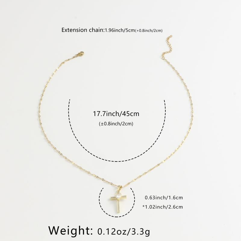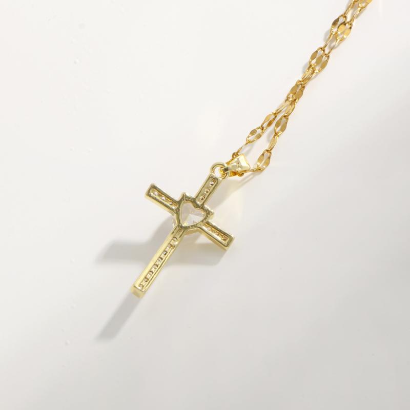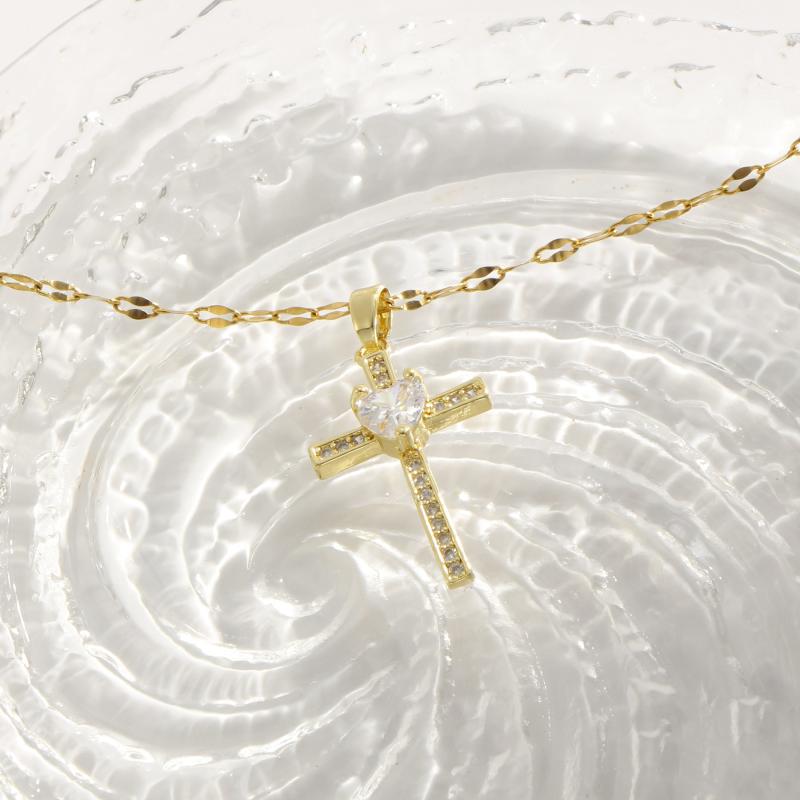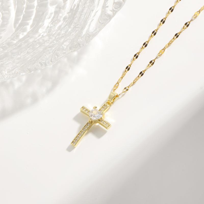 Elegant and minimalist cross pendant necklace featuring heart accents and synthetic zirconia. Made of hypoallergenic stainless steel with a golden tone coating.