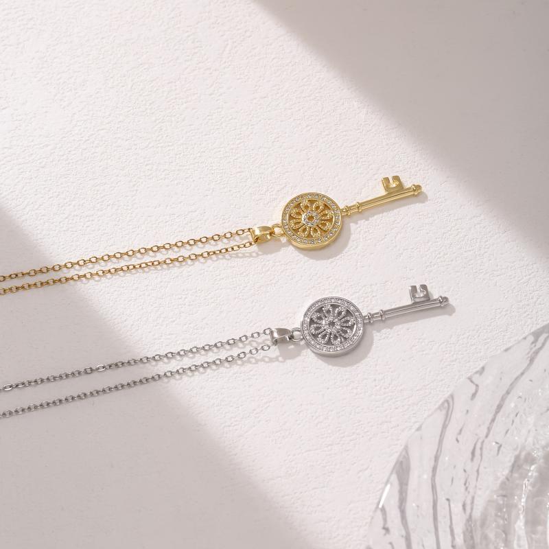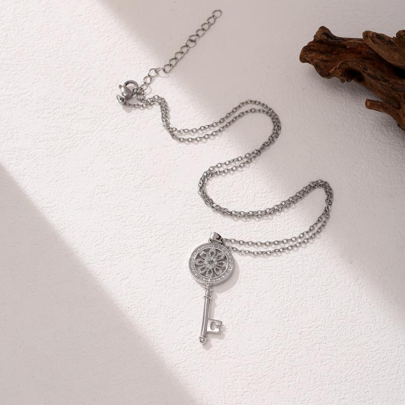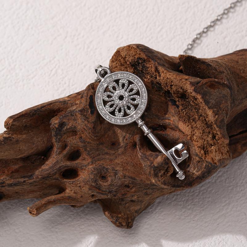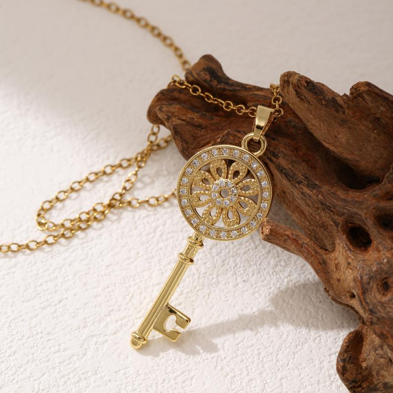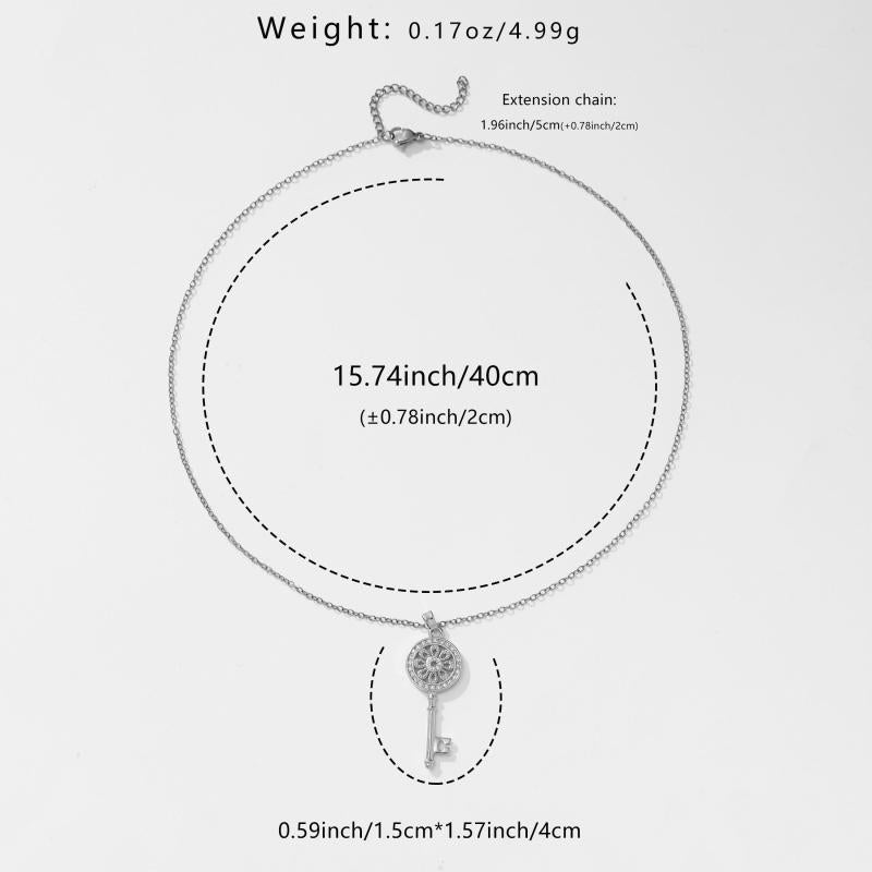 This necklace features a key pendant adorned with a synthetic stone, made of hypoallergenic copper alloy.