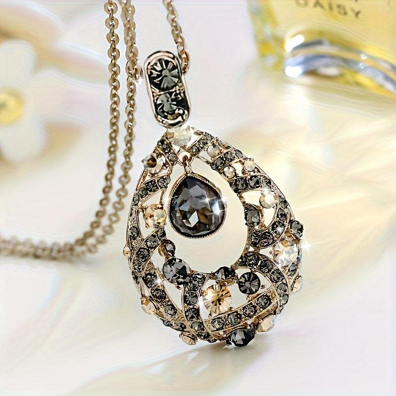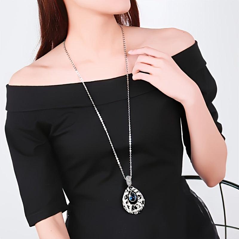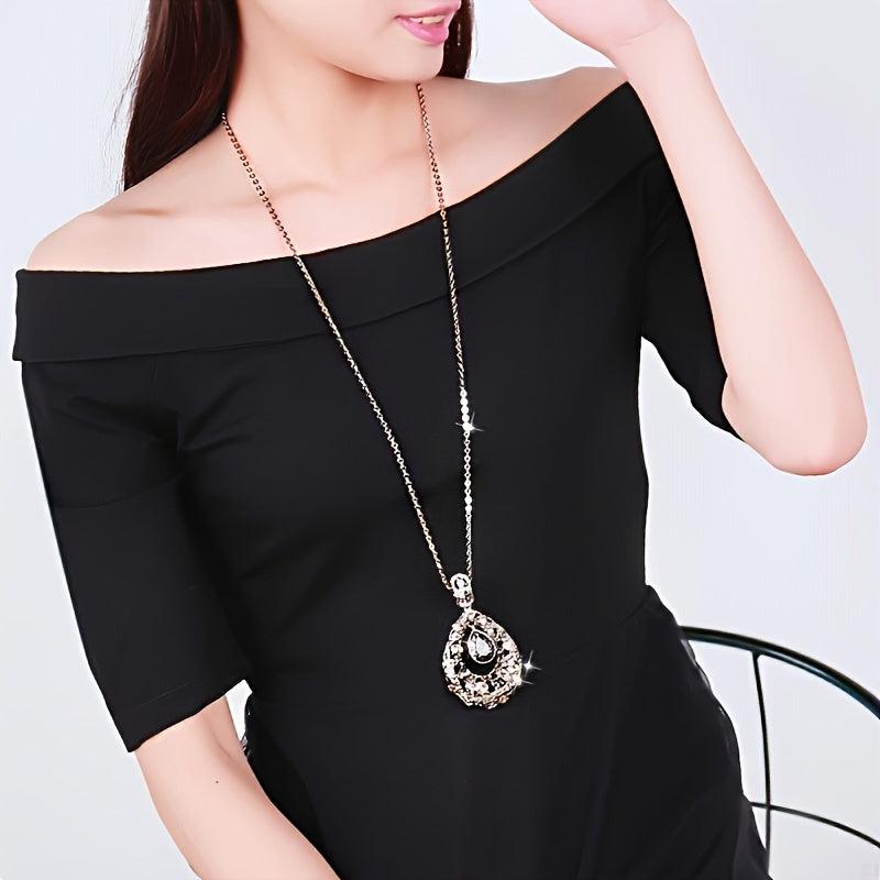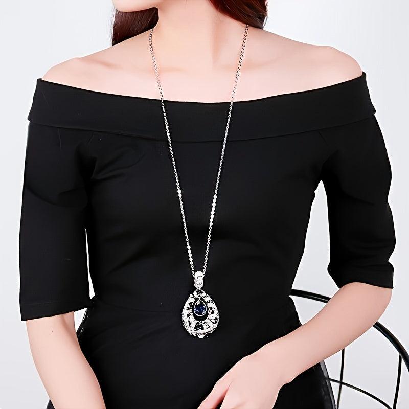 Elegant accessory to elevate your look. Features a long chain with water drop pendant.