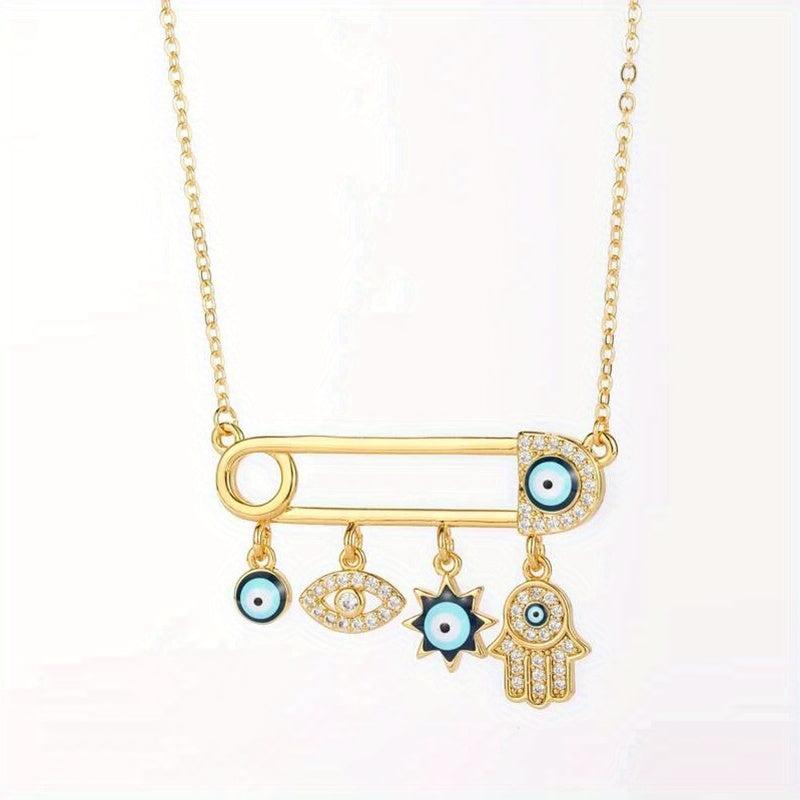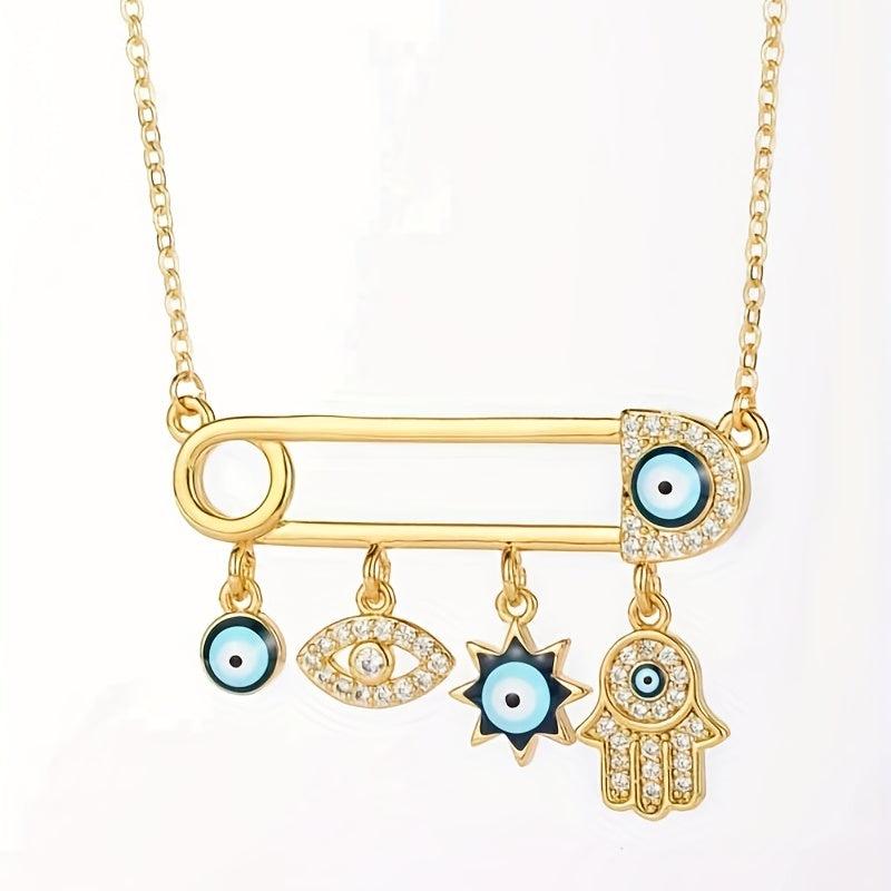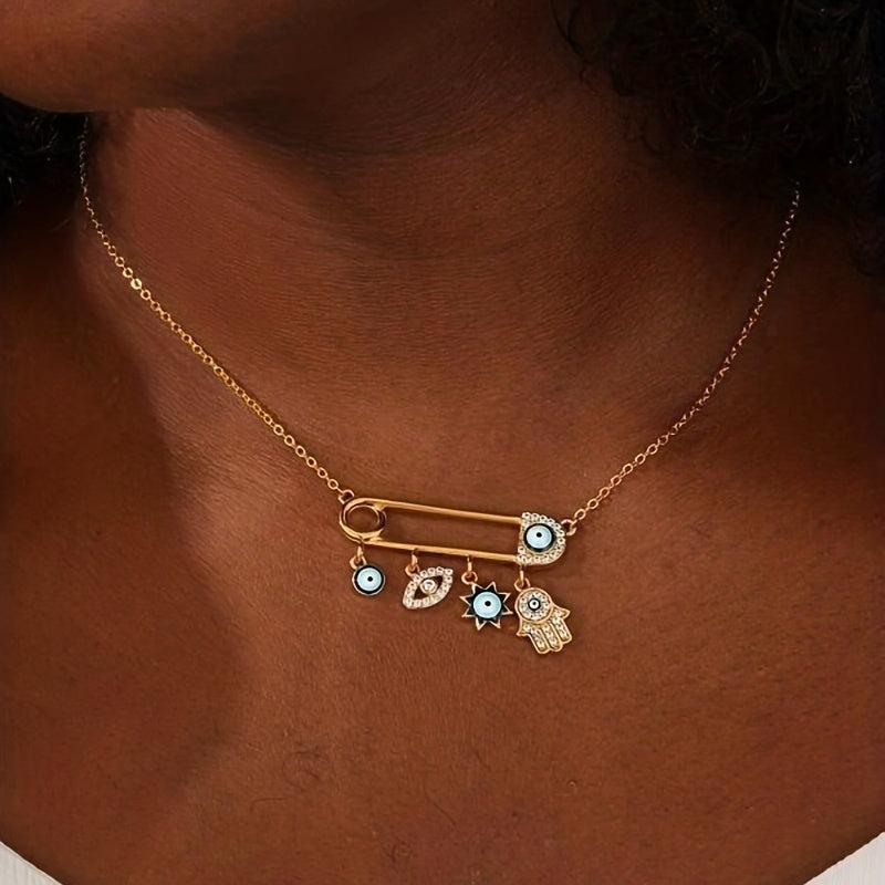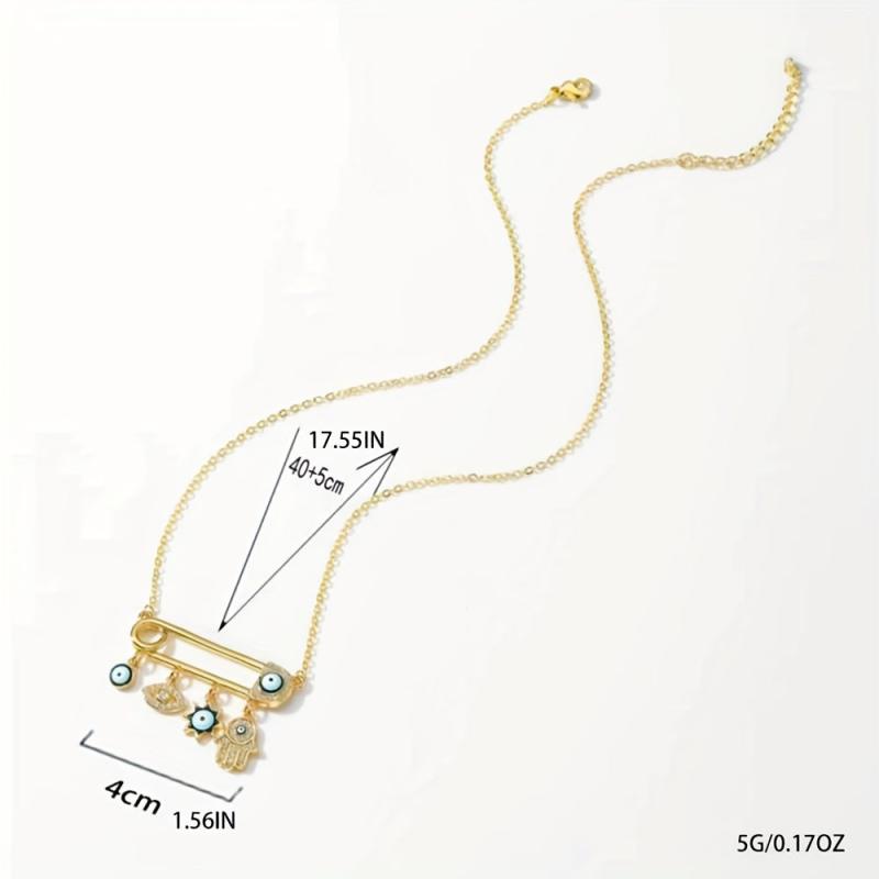 Elevate your style with this fashionable and delicate lucky choker featuring an evil's eye hamsa hand and safety pin charm. Perfect for women and girls.