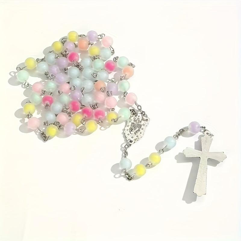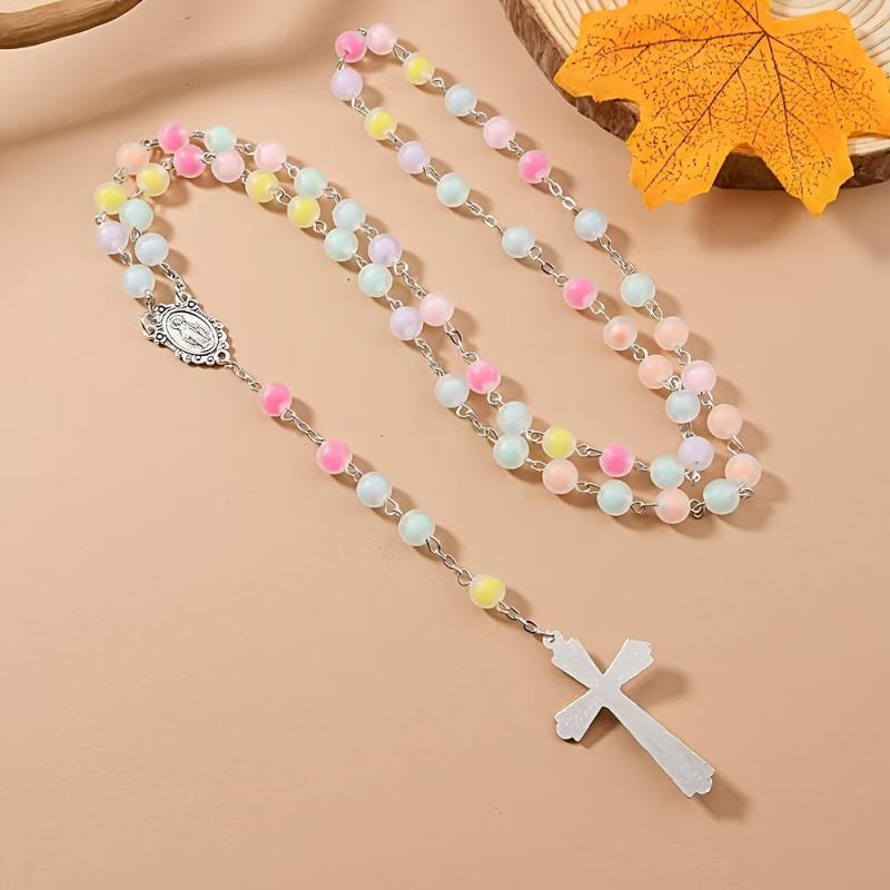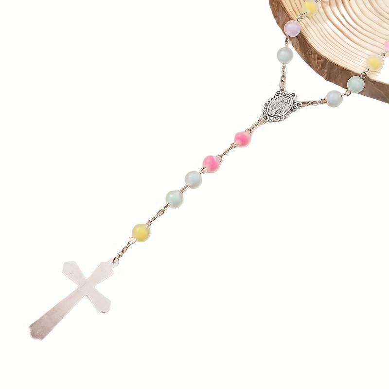 Bohemian religious necklace featuring a candy-colored Jesus cross pendant adorned with pastel beads. Perfect for women to wear during baptism, prayer, or on vacation.