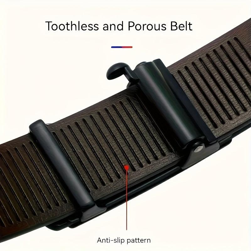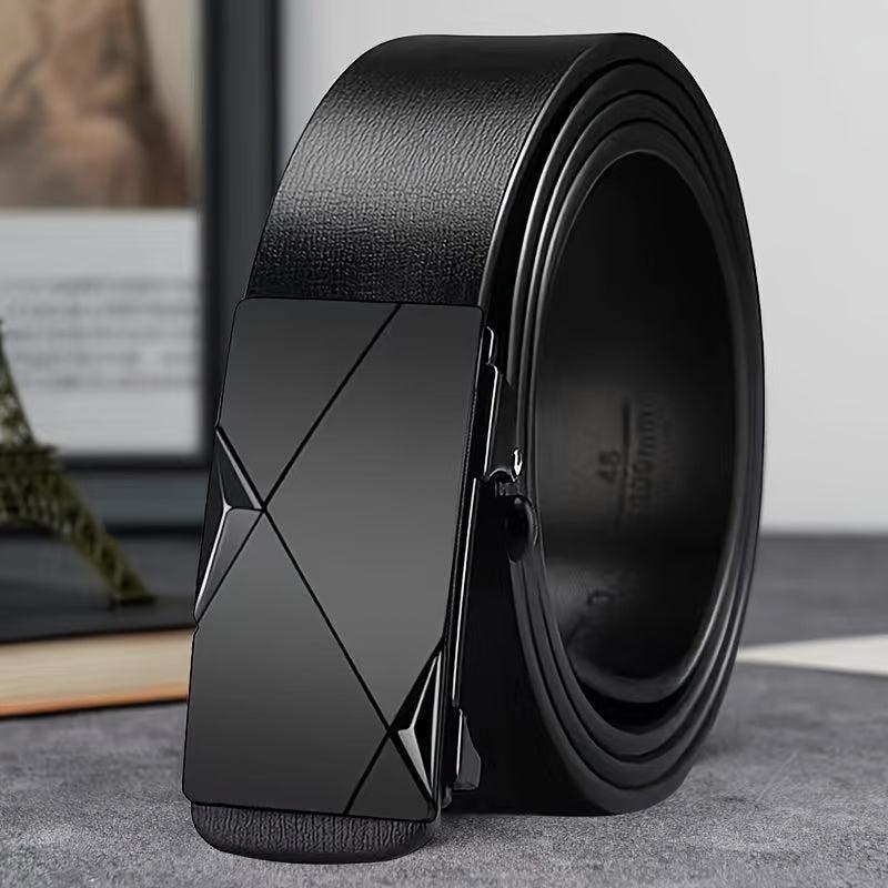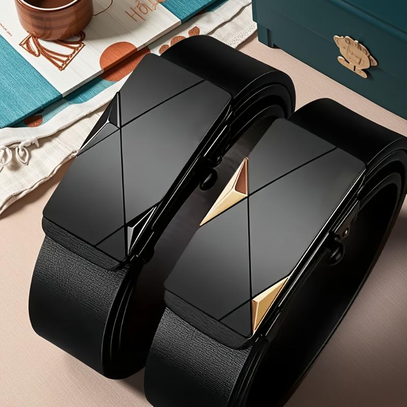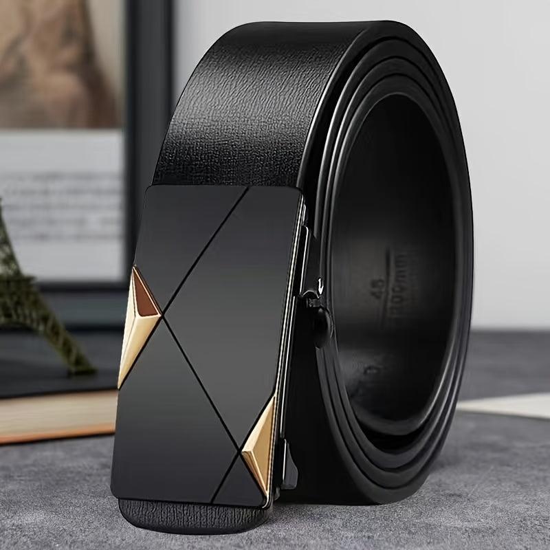 Elevate your style with this faux leather belt featuring a golden geometric embossed automatic iron buckle. Suitable for casual to business wear, it's ideal for Valentine's and Father's everyday.