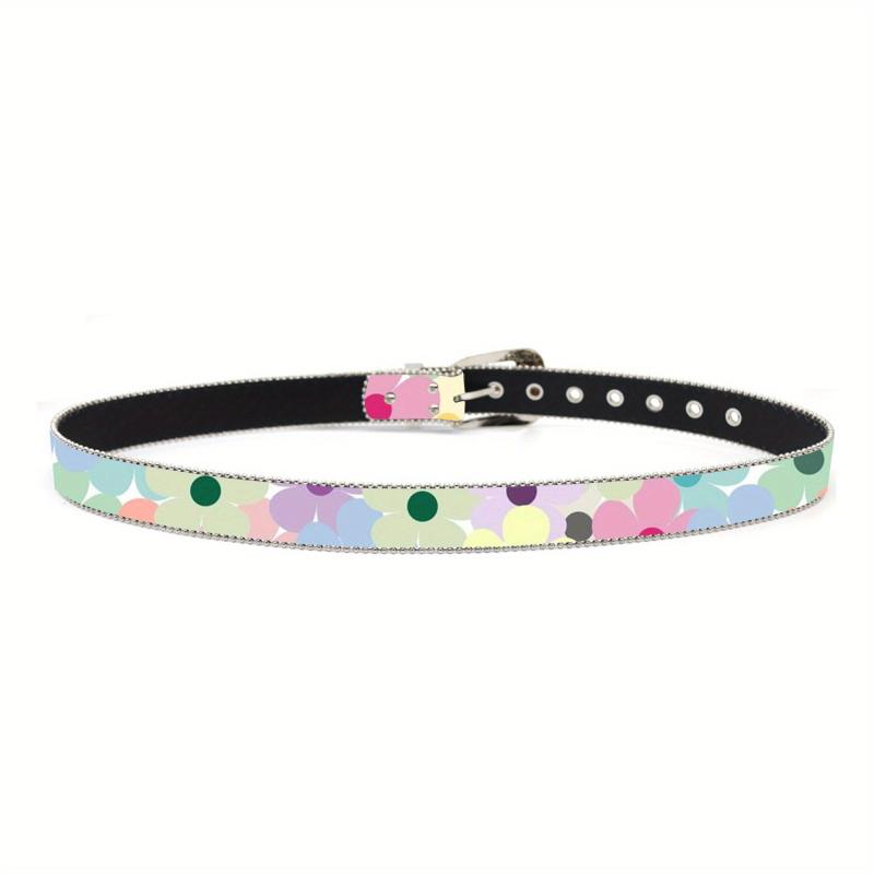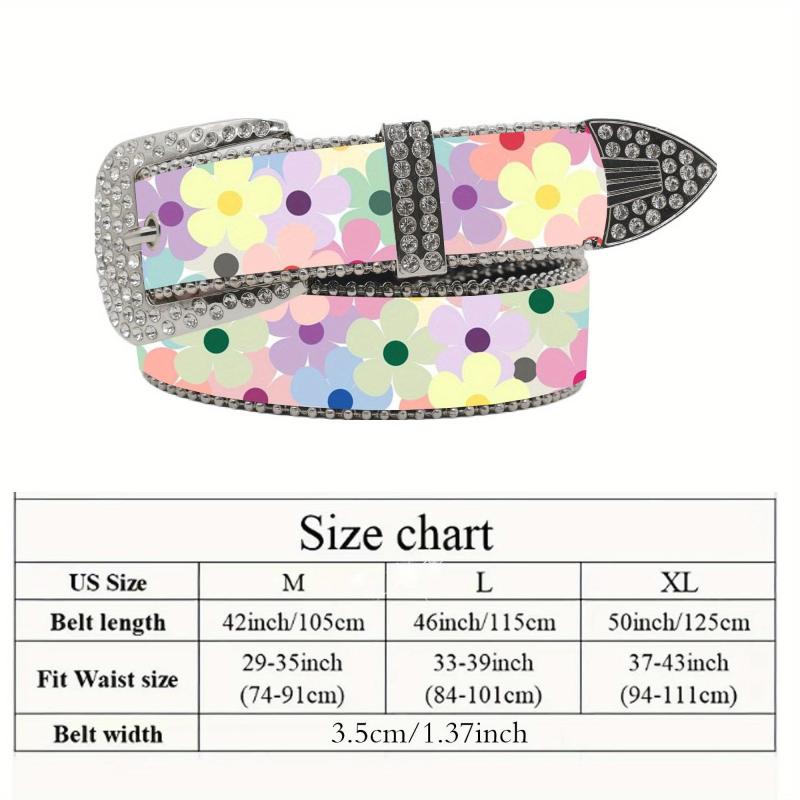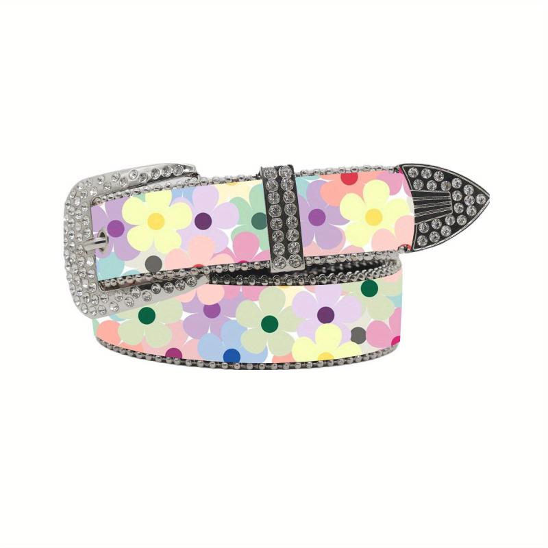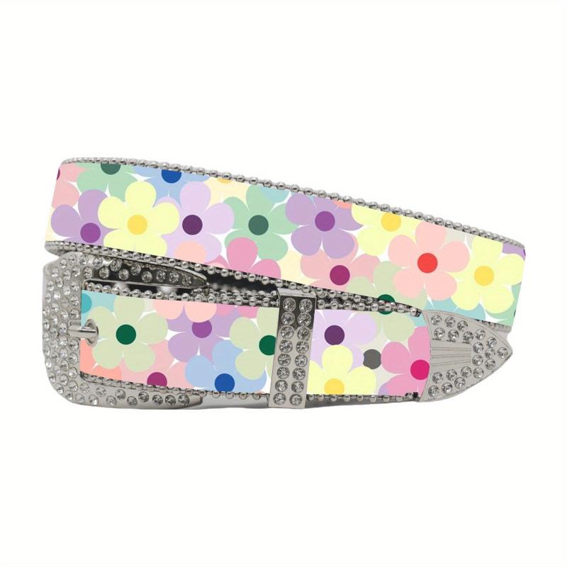 Elevate your summer style with this colorful floral print belt featuring rhinestones and a western buckle. Perfect accessory for casual outfits.