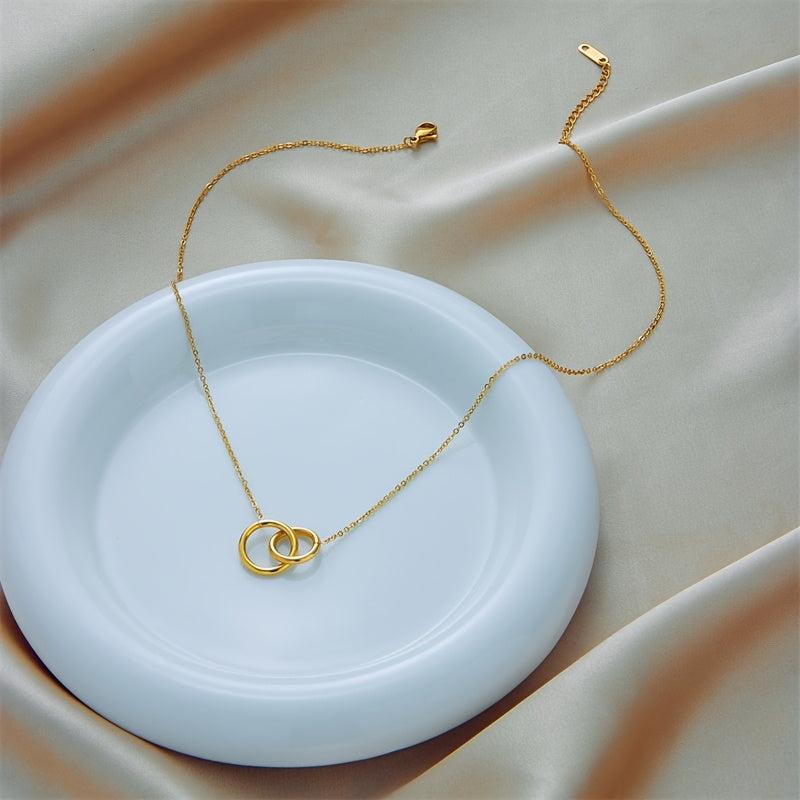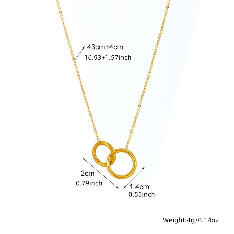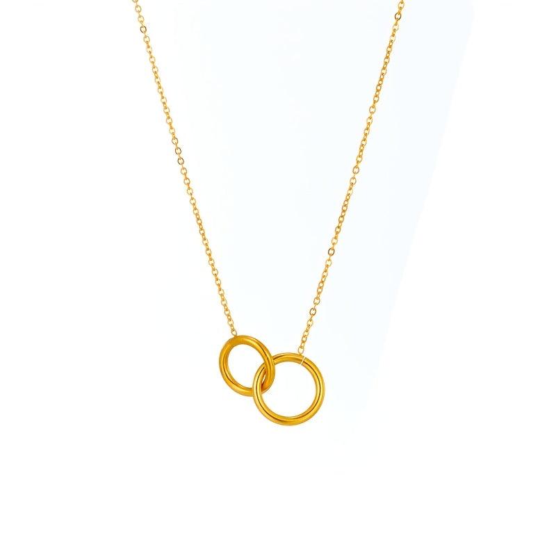 This stainless steel necklace features interlocking double rings in a golden tone, perfect for both men and women to wear daily.