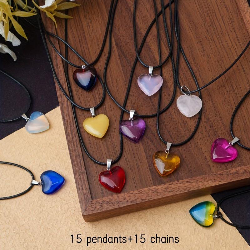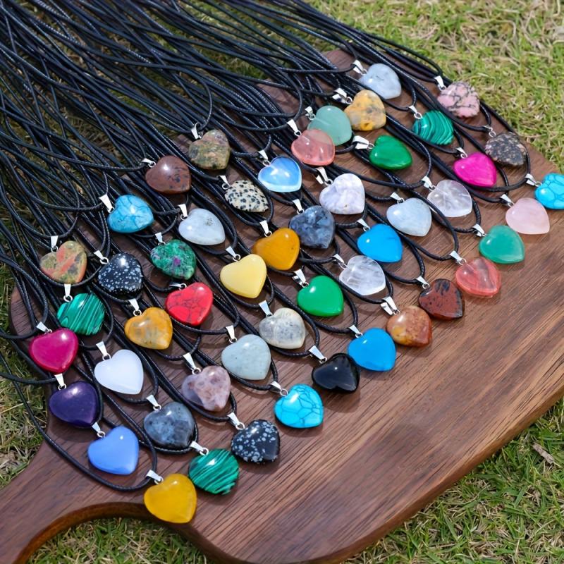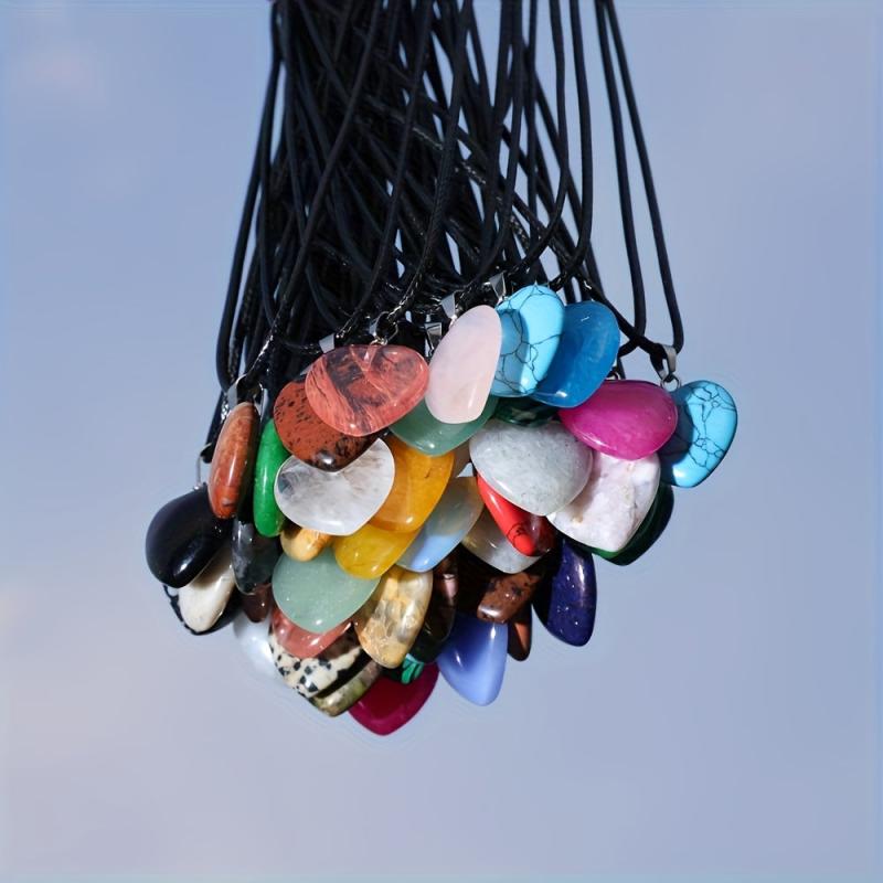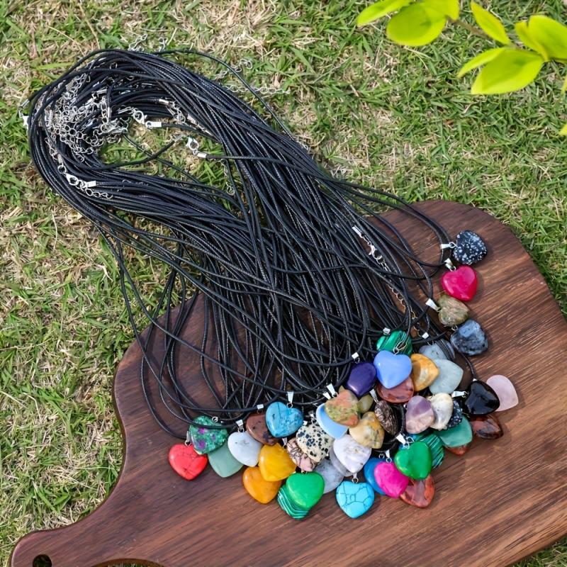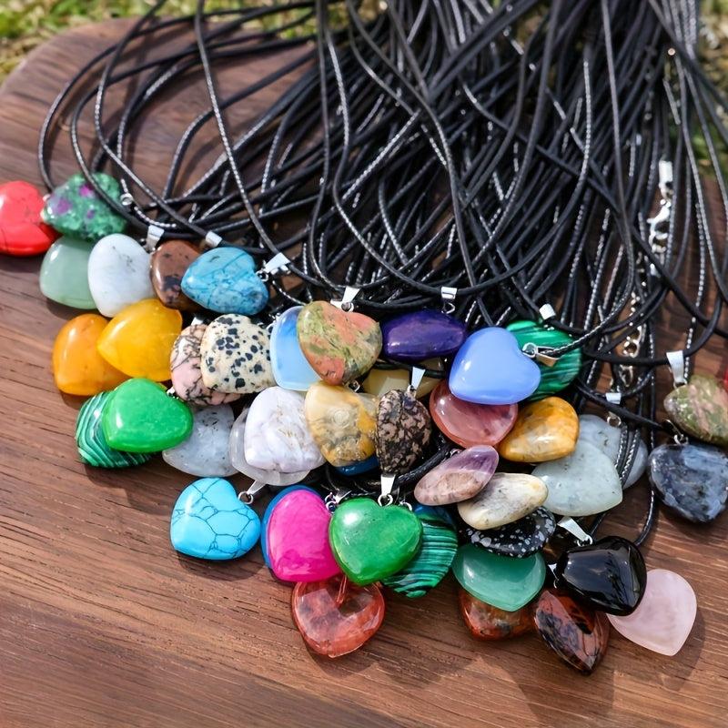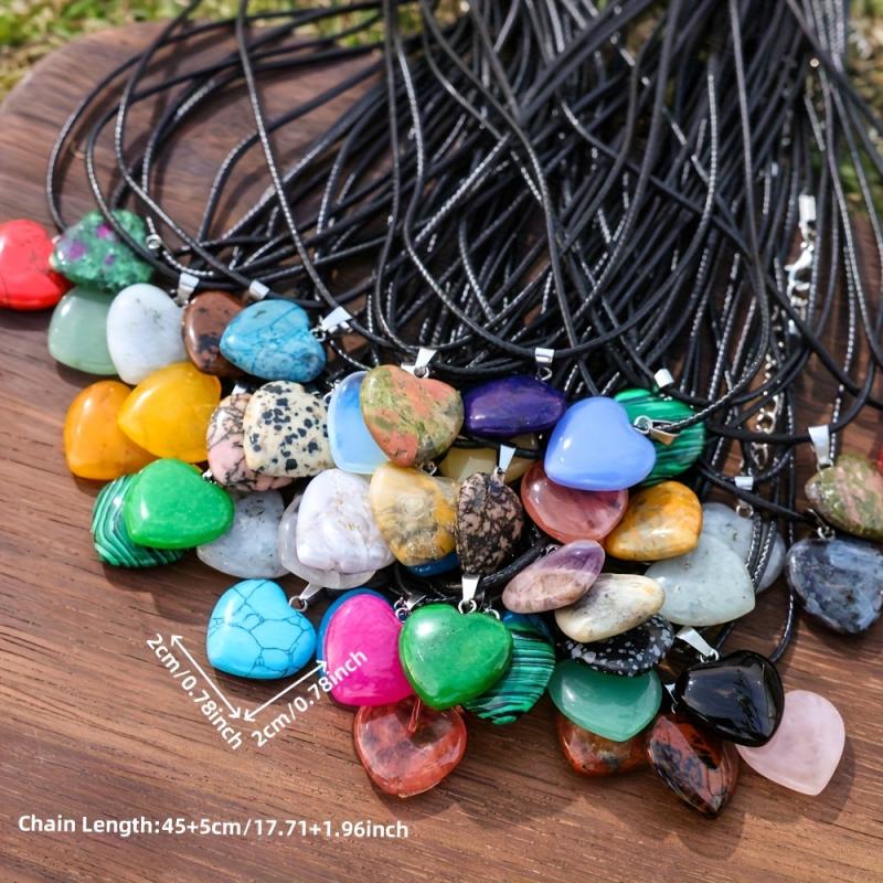 30-piece set of natural stone and synthetic heart pendants with adjustable leather cord in random colors. Perfect for creating DIY necklaces.