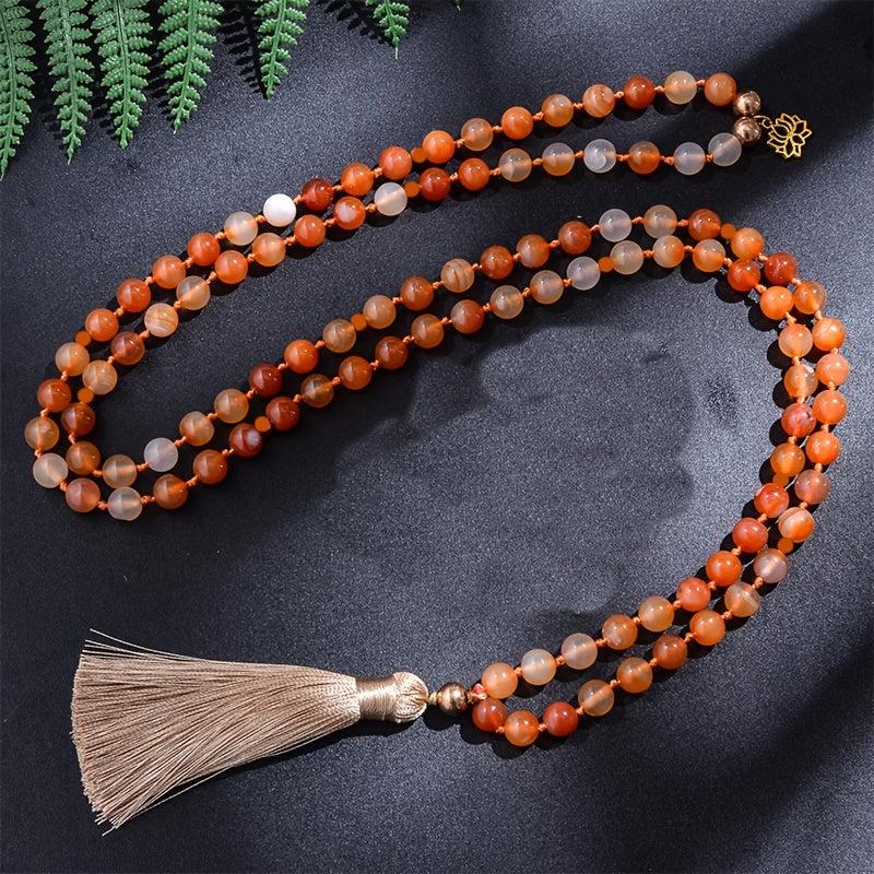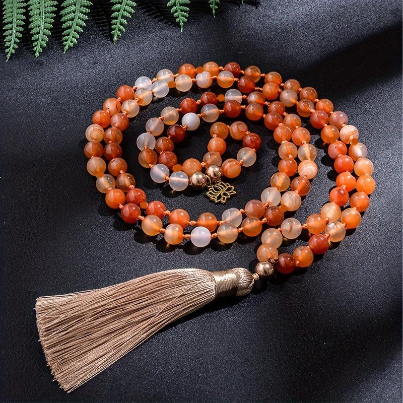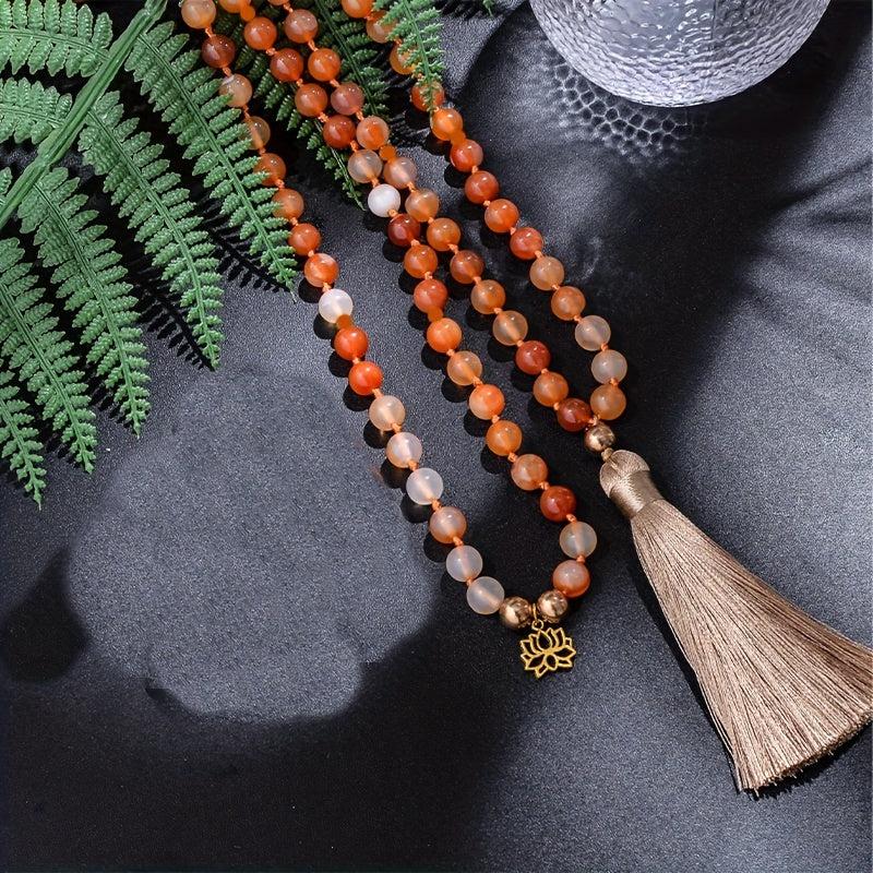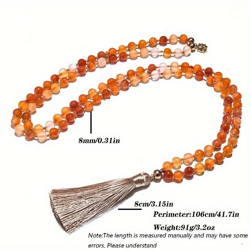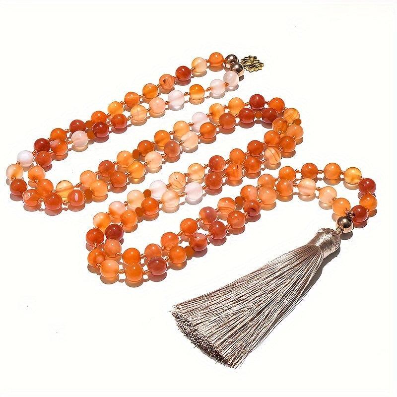 Enhance your casual attire with this bohemian style necklace featuring 108pcs of 8mm orange red agate beads with golden accents and a tassel. Made of durable natural stone, this necklace is perfect for women.