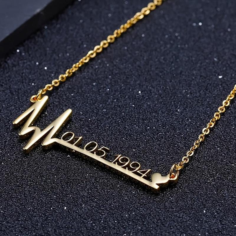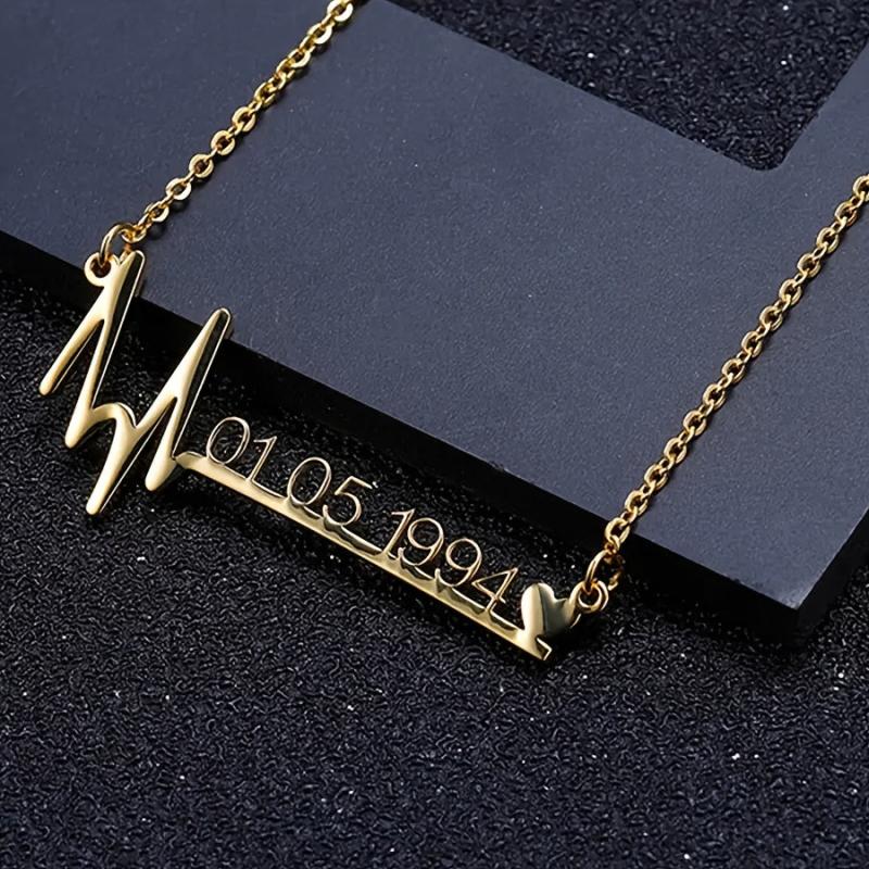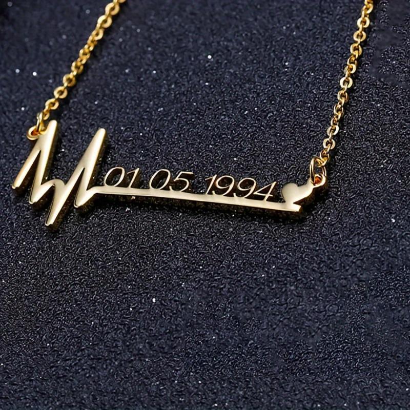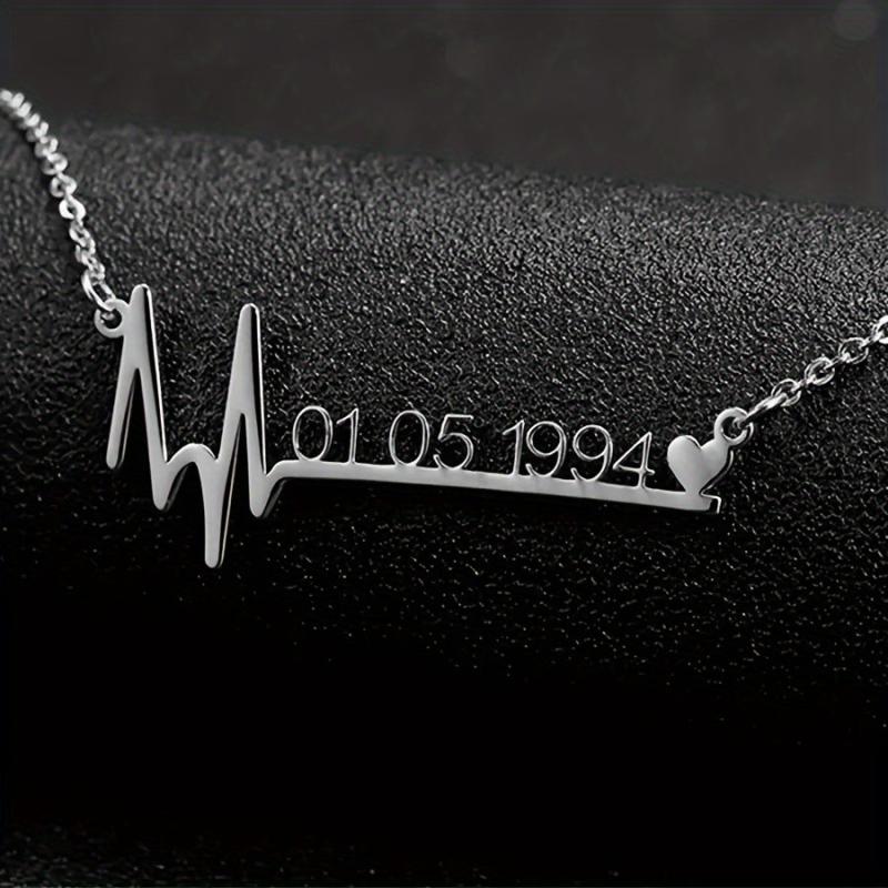 This custom stainless steel necklace features a unique heartbeat design with a personalized date and name. A perfect gift for your loved one.