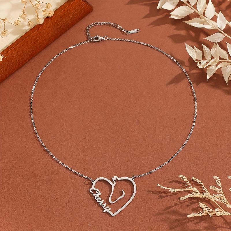 Show your love for horses with this custom heart-shaped name pendant necklace. Crafted from stainless steel, this piece of equestrian jewelry is a perfect gift for any horse enthusiast.