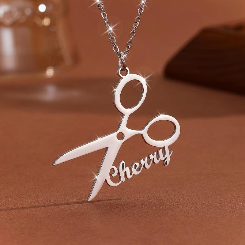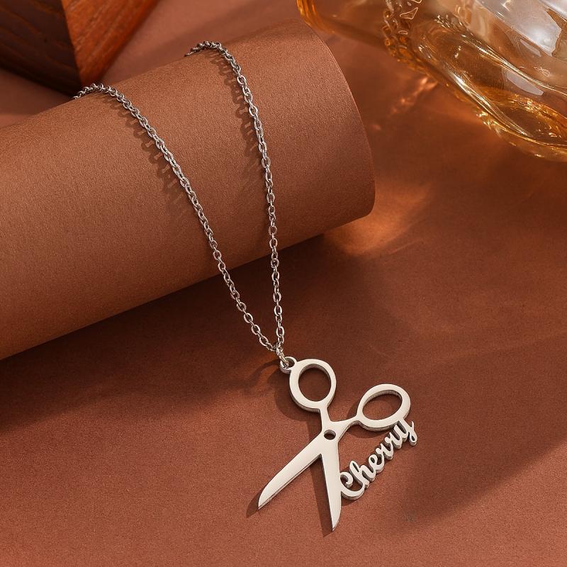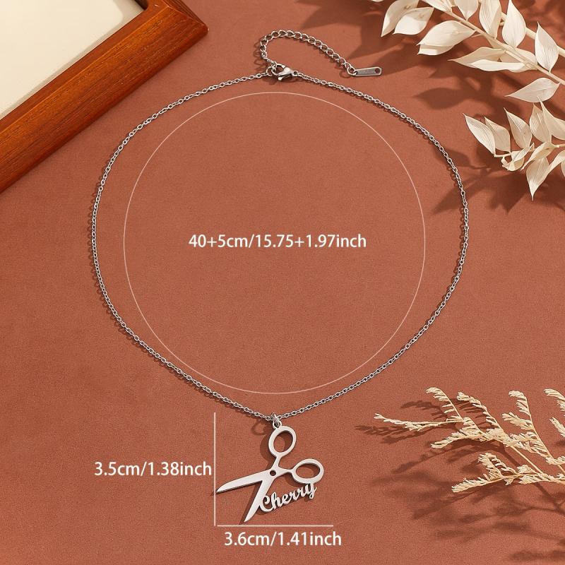 This necklace is the perfect accessory for hairstylists, featuring a scissor pendant with custom engraving. Made of stainless steel, it is durable and stylish for daily wear.