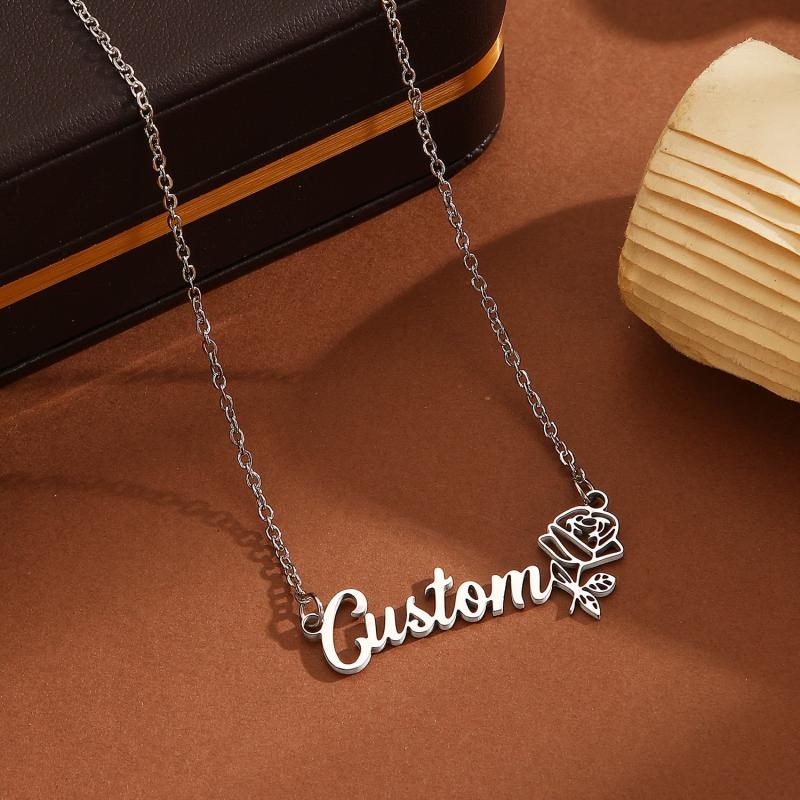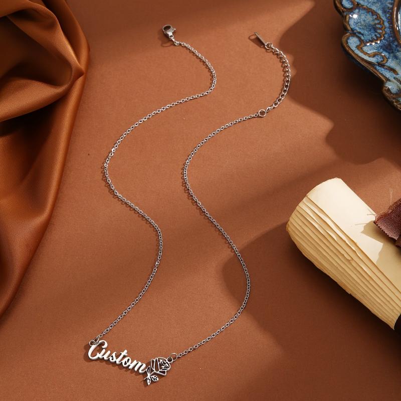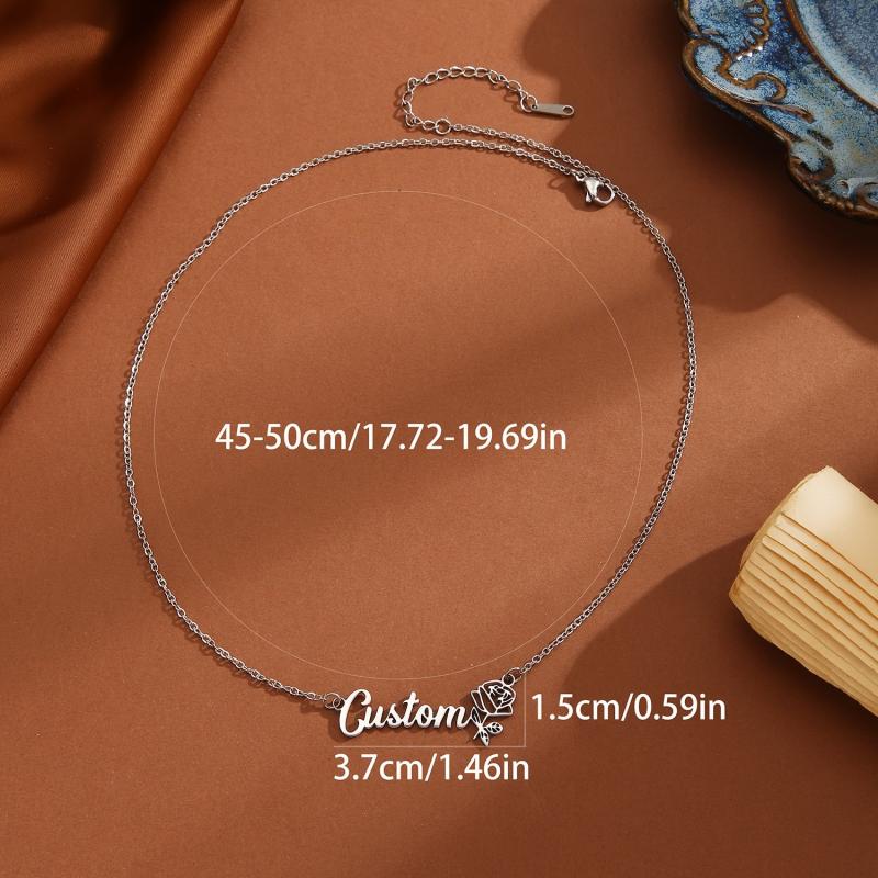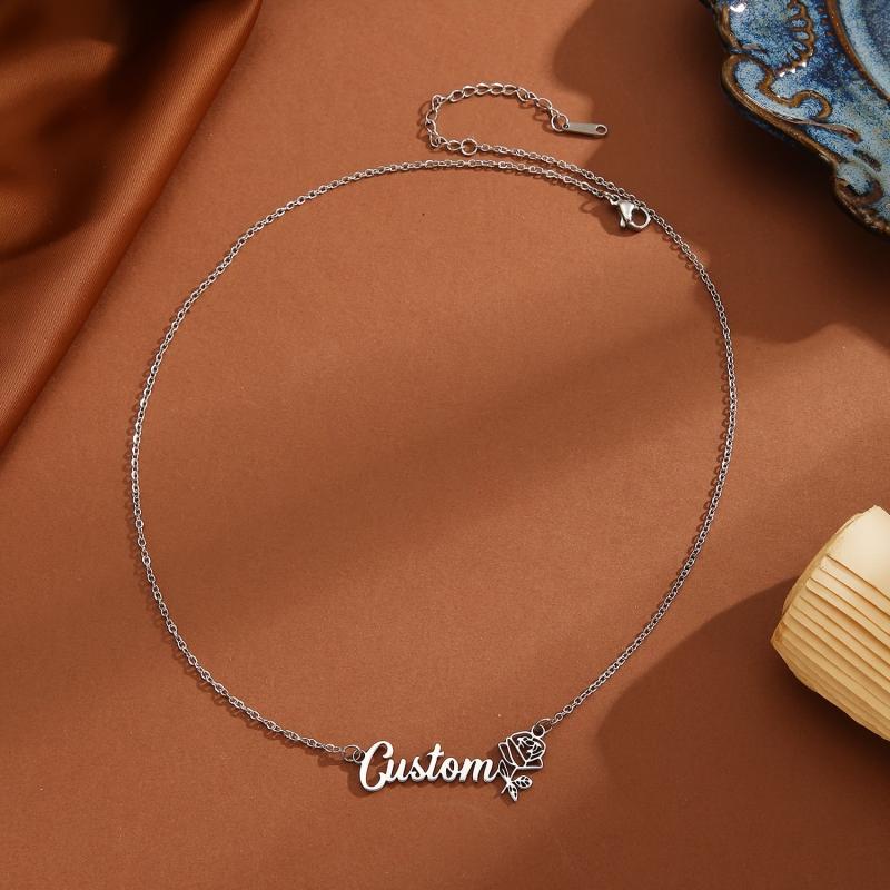 Custom name engraved 304 stainless steel pendant necklace featuring a minimalist rose flower design. Perfect for casual attire and durable wear.