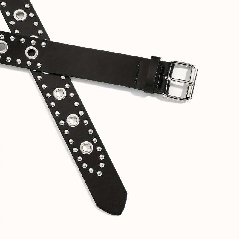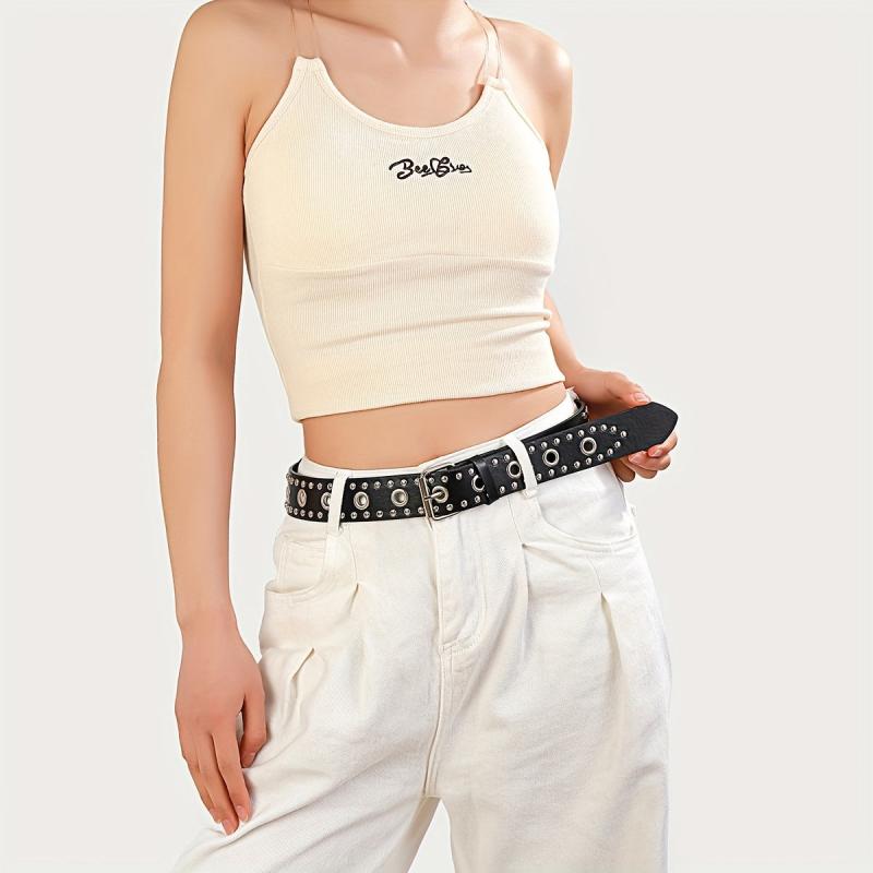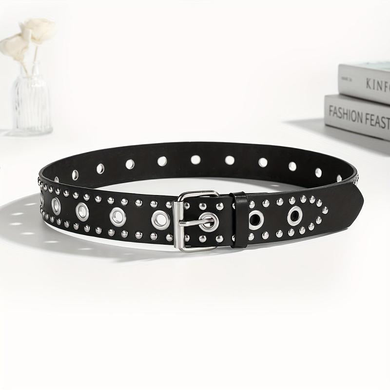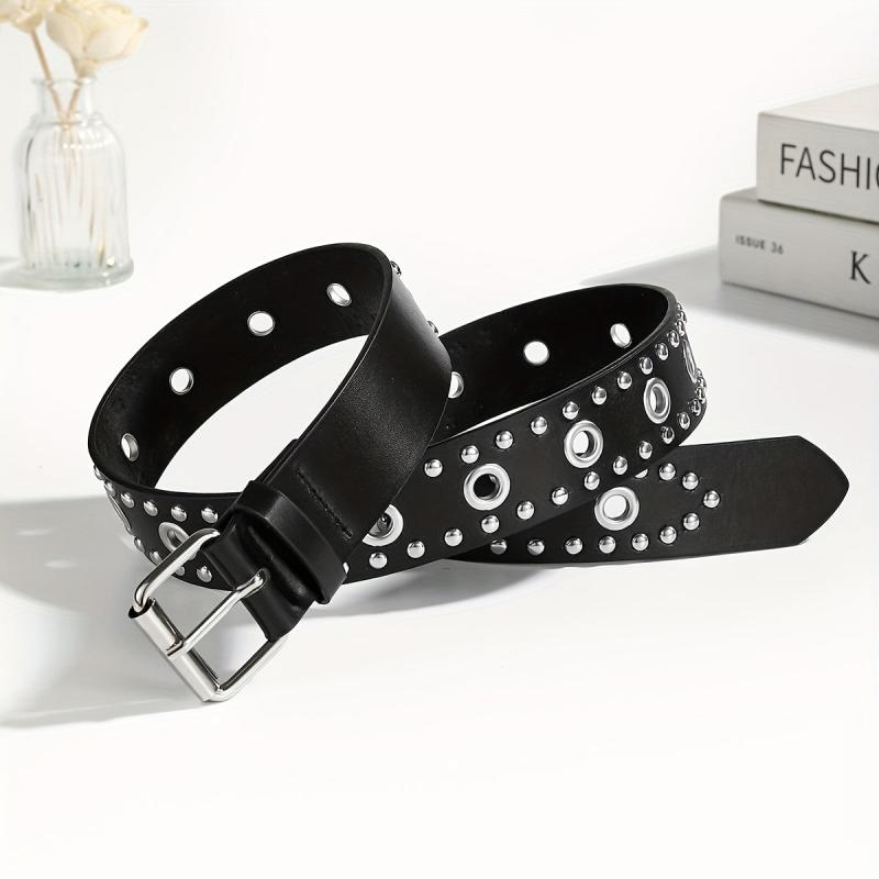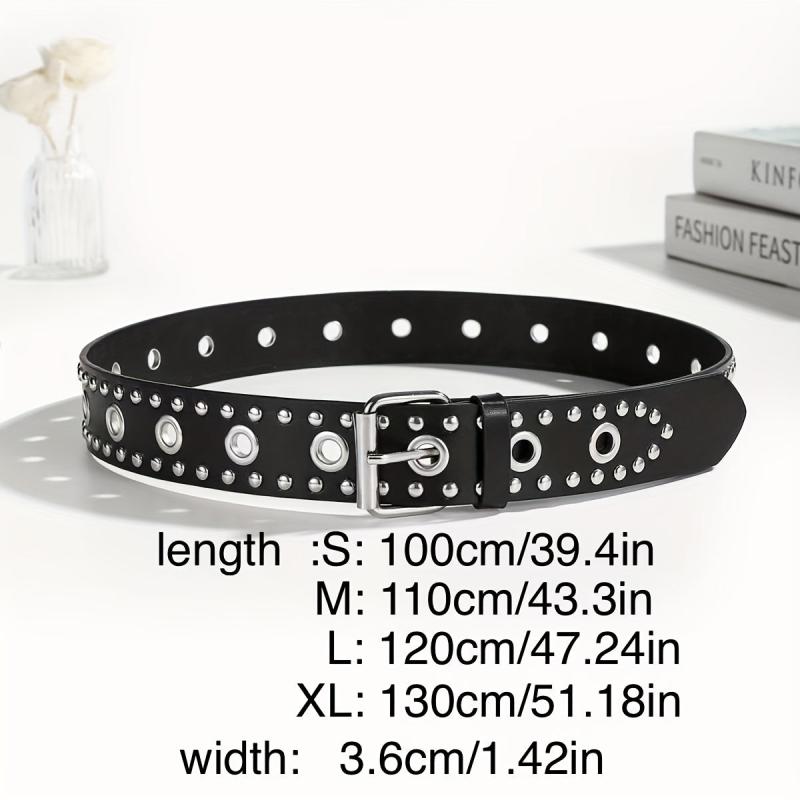 Accessorize your party or casual attire with this unisex PU leather belt featuring rivet details and an adjustable square pin buckle.