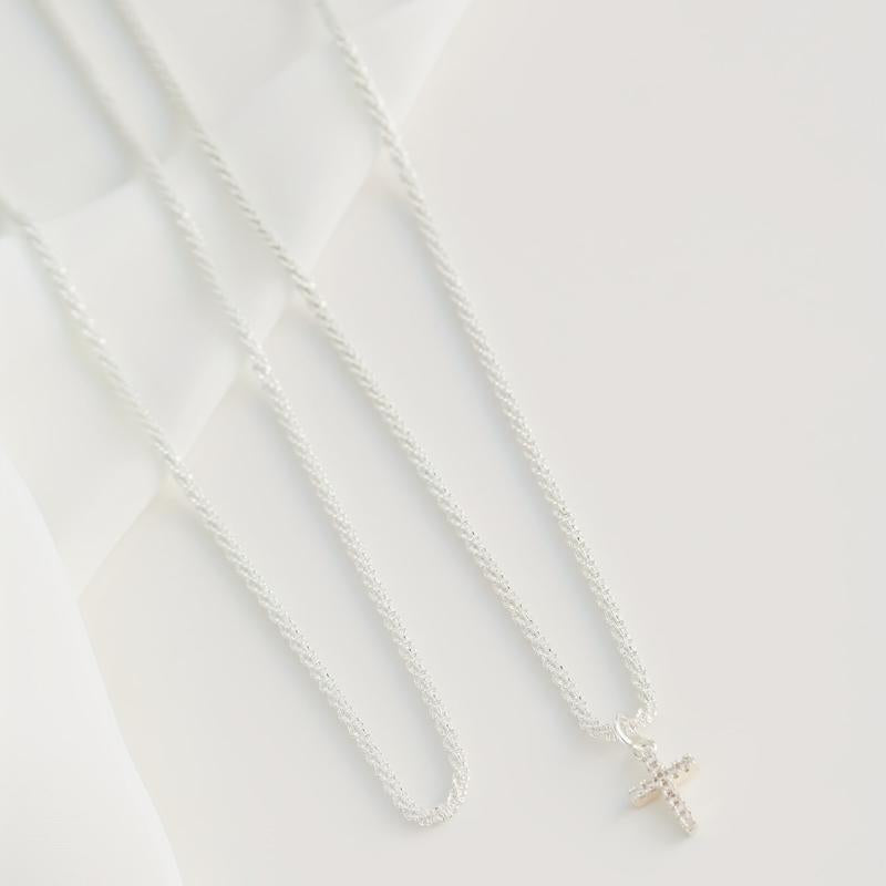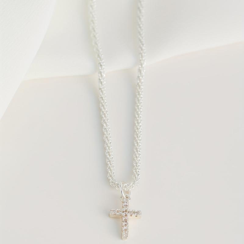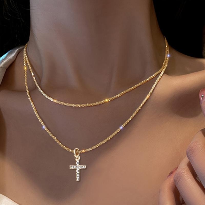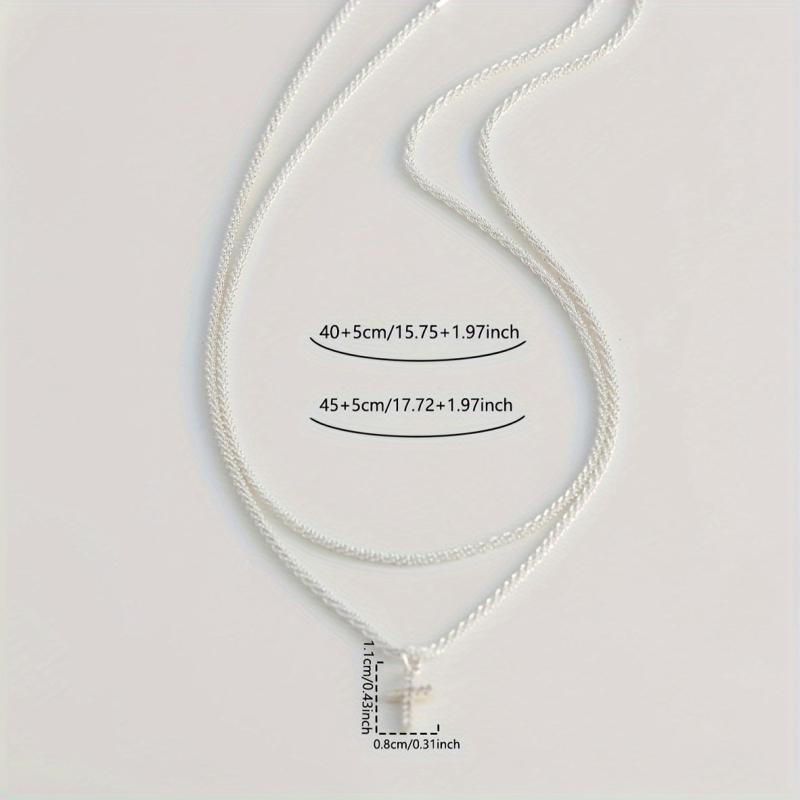 Elegant double layered cross pendant necklace featuring sparkling cubic zirconia and a silvery plated finish. Ideal for everyday wear and vacation outfits.