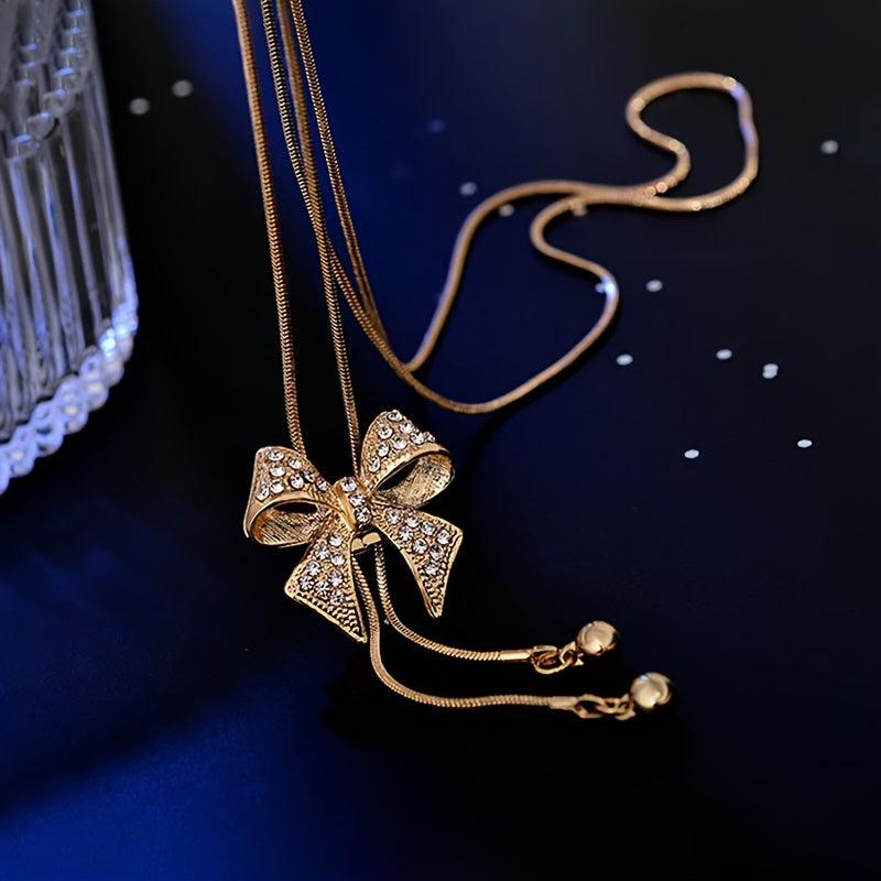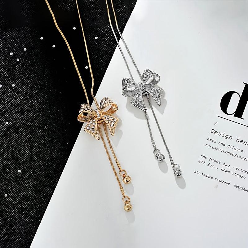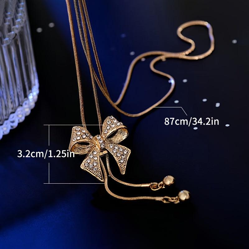 Elegant and versatile long necklace featuring a rhinestone bow with a sparkling butterfly pendant on a golden tone chain. Perfect for daily wear with casual or formal outfits.