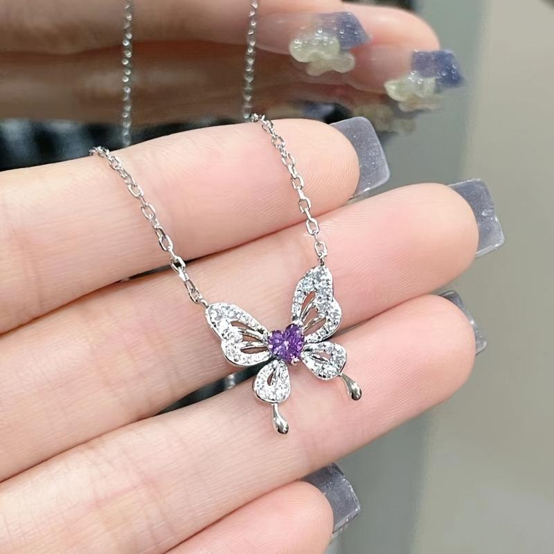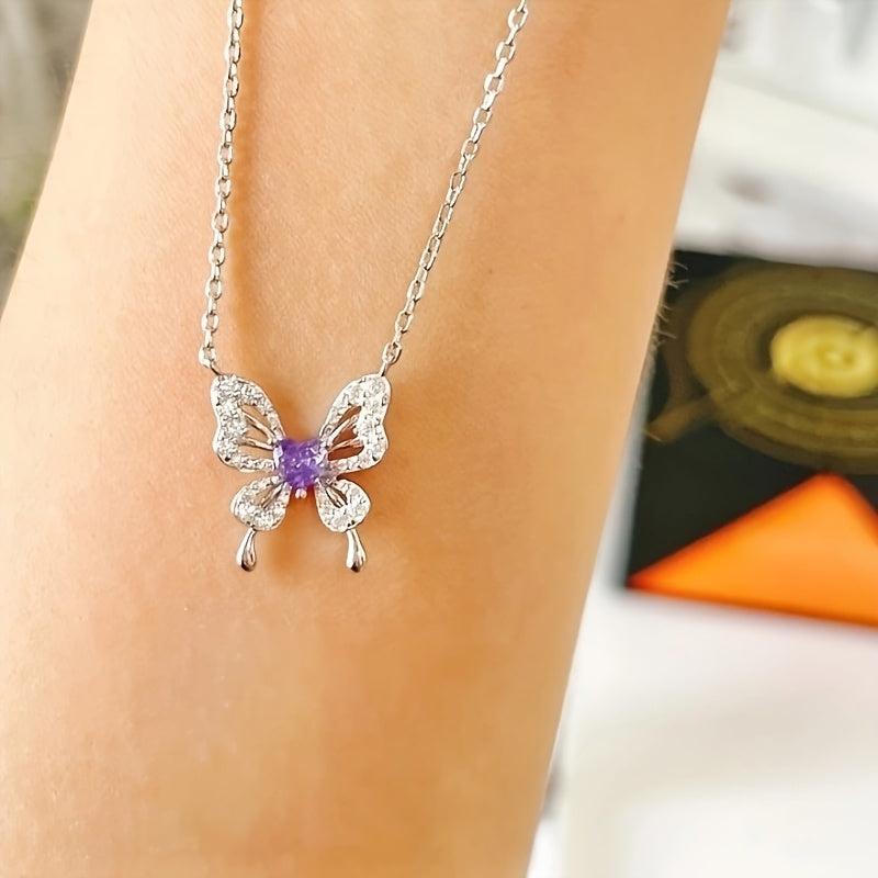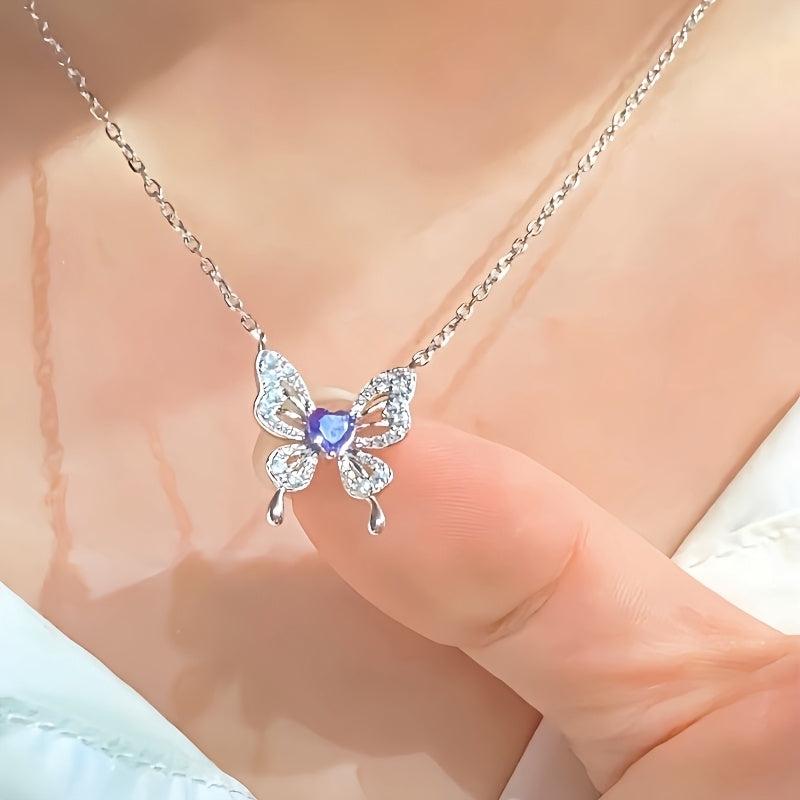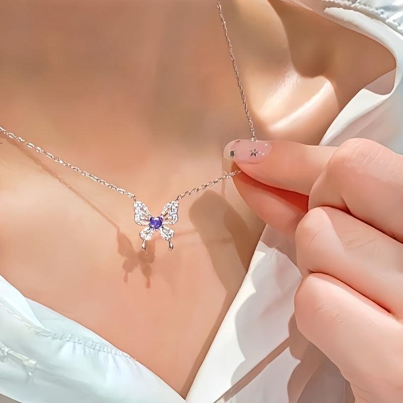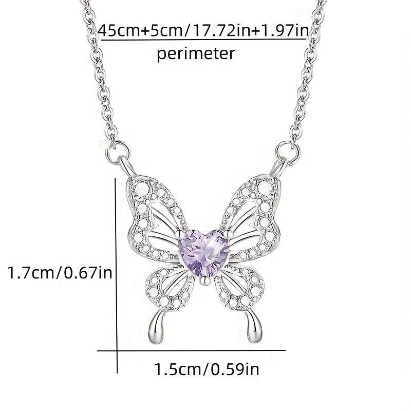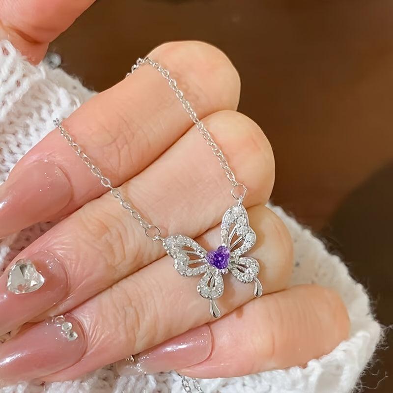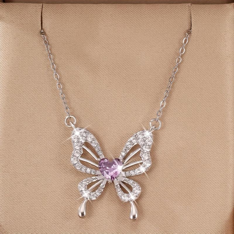 Add a touch of sparkle to your outfit with this gorgeous rhinestone butterfly pendant necklace. The necklace features a heart-shaped crystal and comes on a silvery chain, making it perfect for daily wear or as a gift. This piece of everyday jewelry is both durable and stylish.