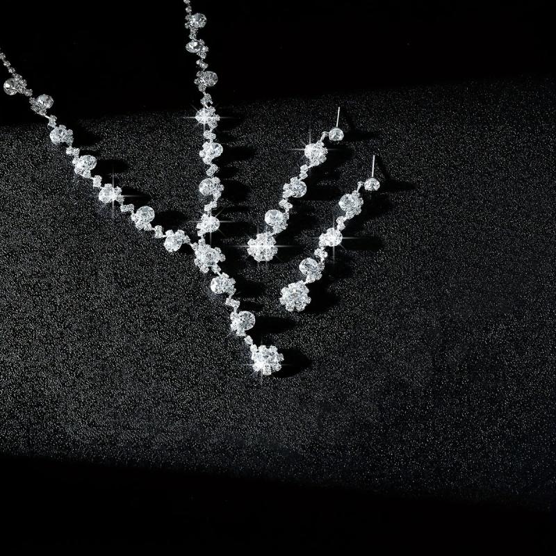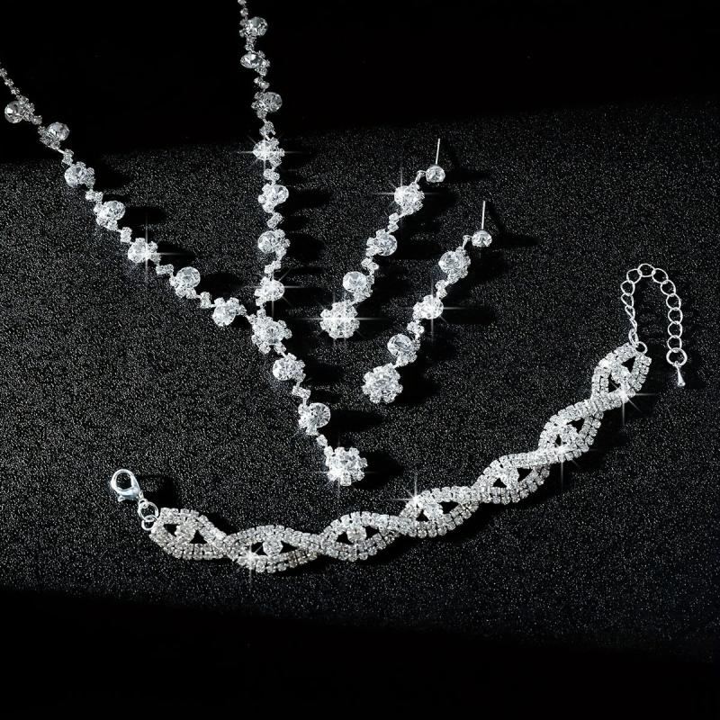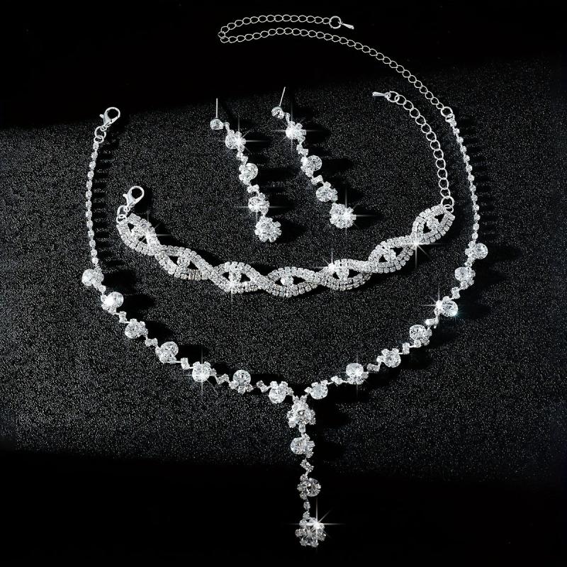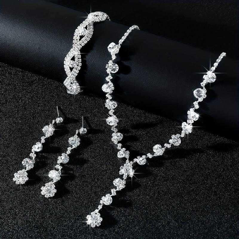 Elegant three-piece jewelry set featuring a full rhinestone flower design. Perfect for weddings and banquets, this set includes a Y-shaped necklace, earrings, and a bracelet.