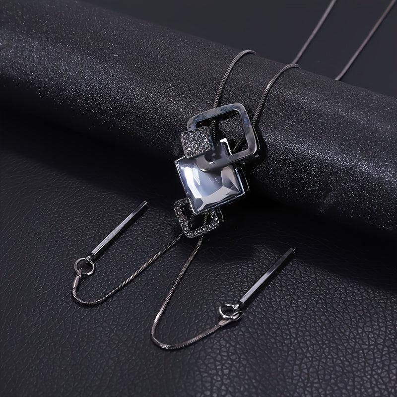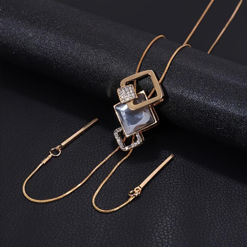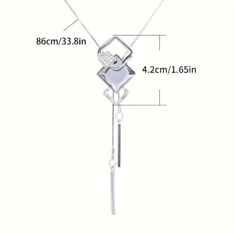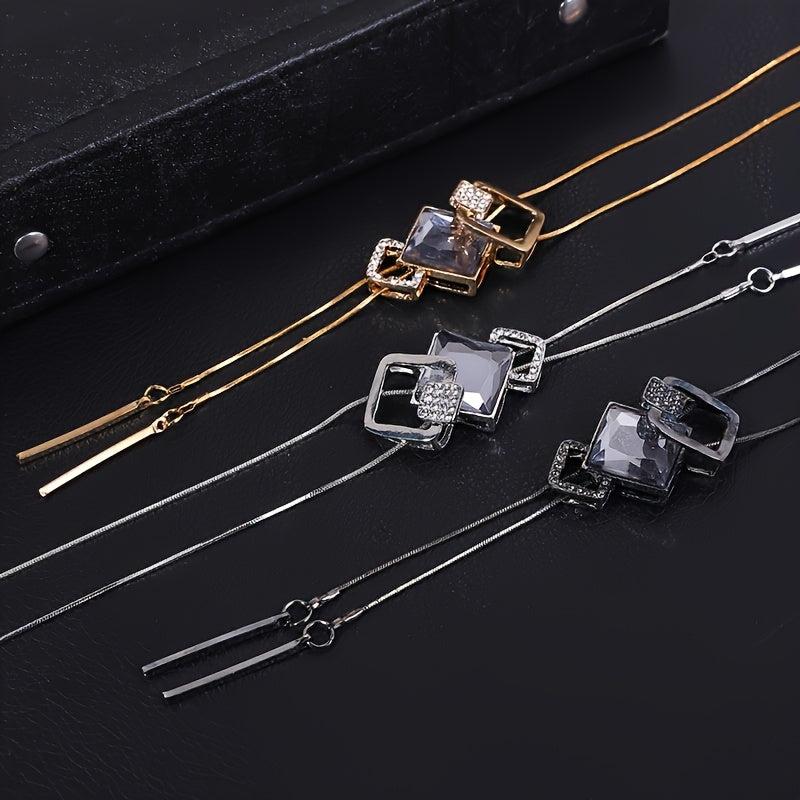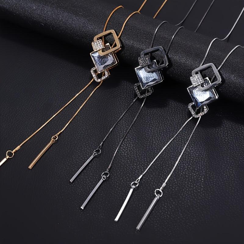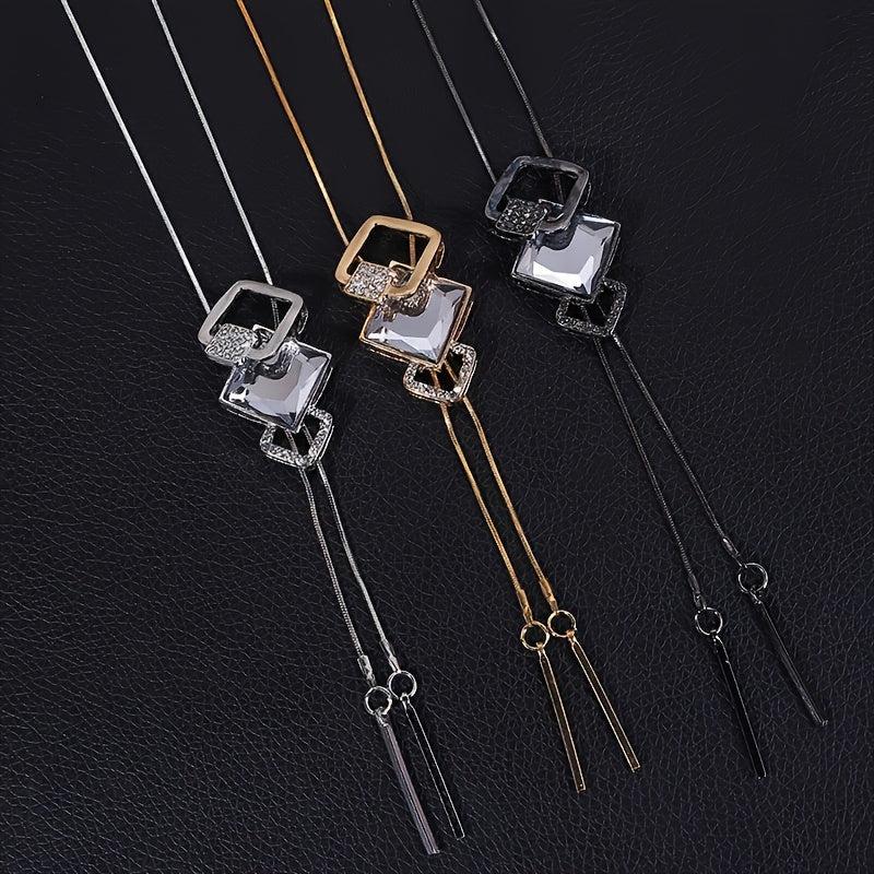 Elevate your style with this fashionable long sweater chain featuring a sparkling rhinestone square pendant. Perfect for adding a touch of glam to your outfits.