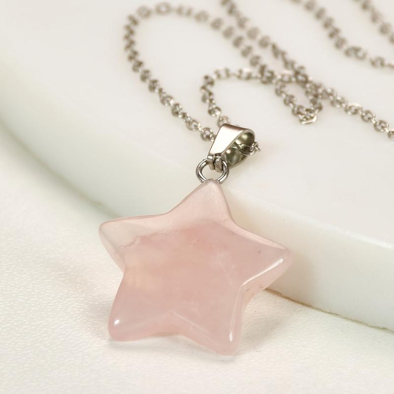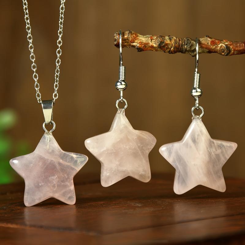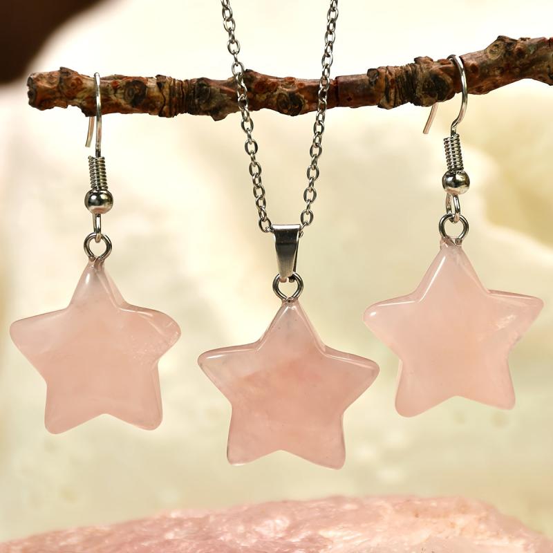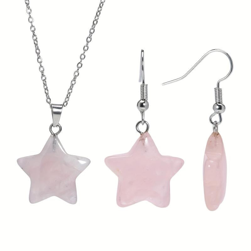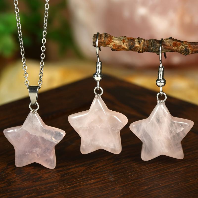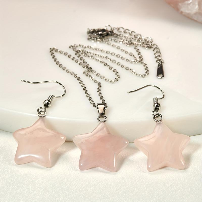 Elevate your summer look with this 3pcs set featuring rose quartz star necklace and earrings. The natural stone jewelry comes in random light to dark colors, perfect for women who love bohemian style accessories.