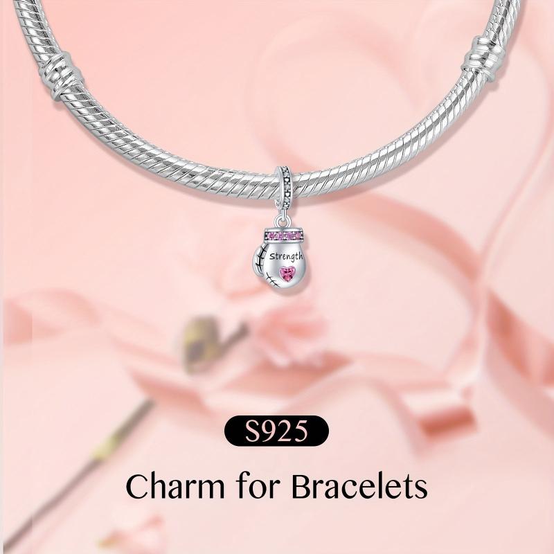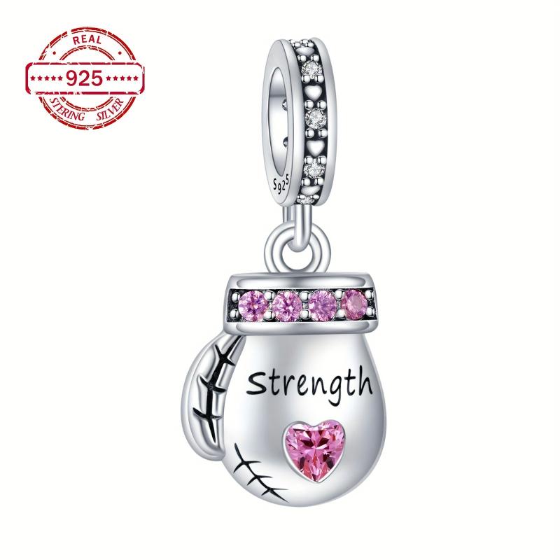 This S925 sterling silver charm pendant features a boxing glove design with pink zirconia and heart detail. It is engraved with the word "Strength" and is perfect for DIY bracelets and necklaces. Makes a great gift for women.