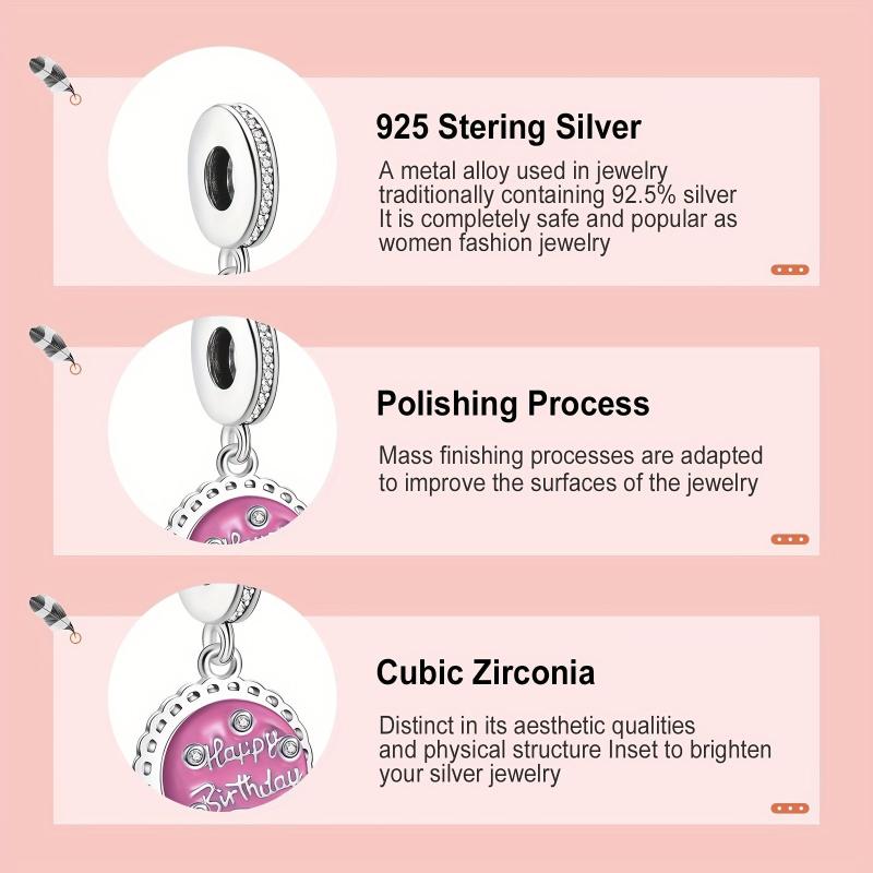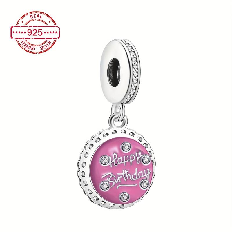 This sterling silver charm features a pink birthday cake design, perfect for DIY jewellery making. Compatible with women's European moment bracelets and necklaces.