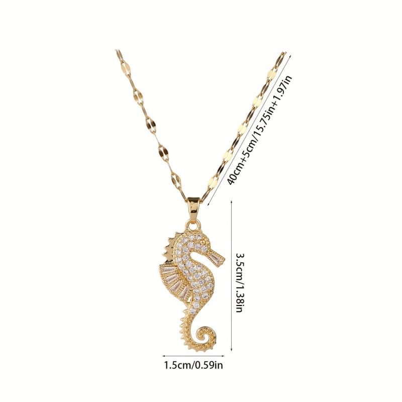 Elegant seahorse pendant necklace featuring sparkling cubic zirconia. Perfect for daily wear or parties, suitable for both women and men.