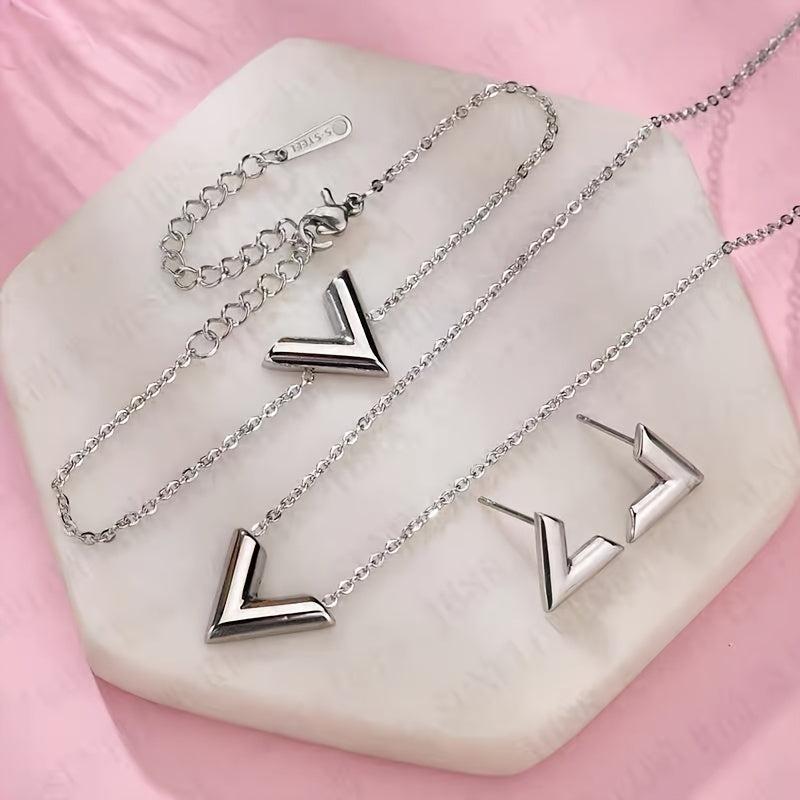 Elegant set featuring silvery stainless steel letter V pendant necklace, earrings, and bracelet. Perfect for parties, banquets, and dancing. Golden style with low allergy potential.