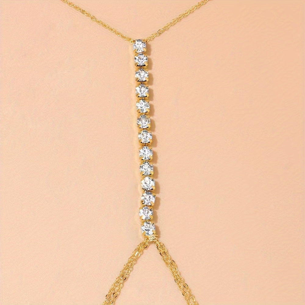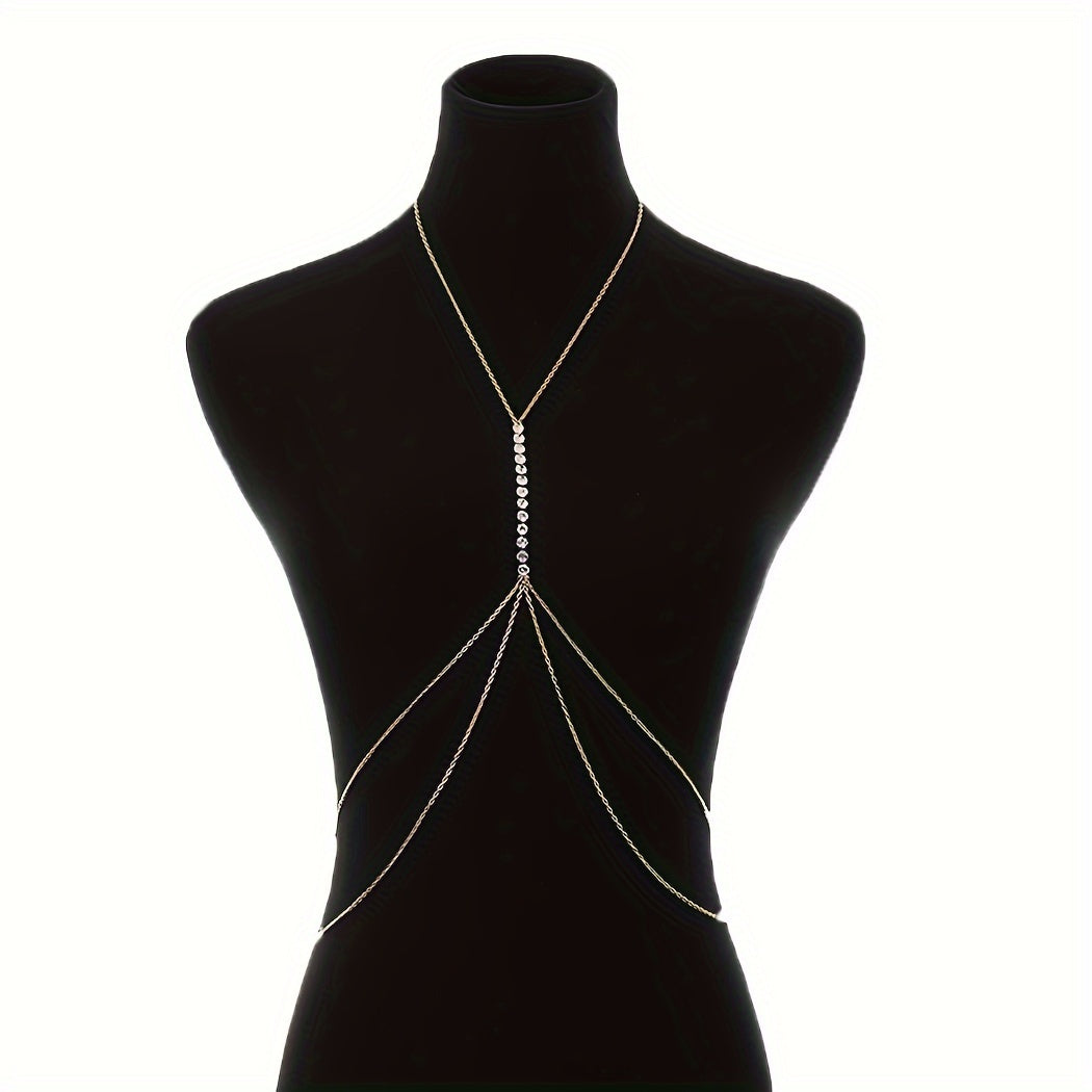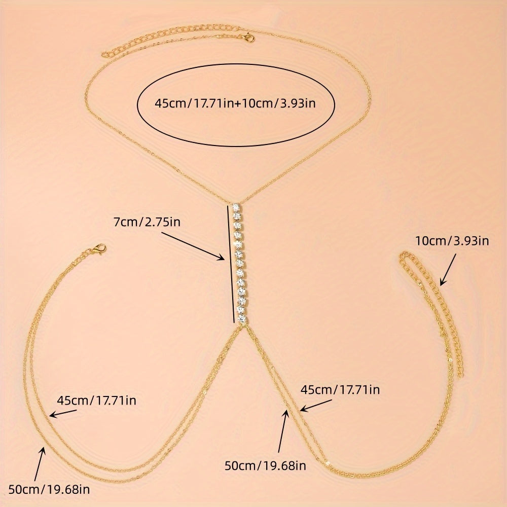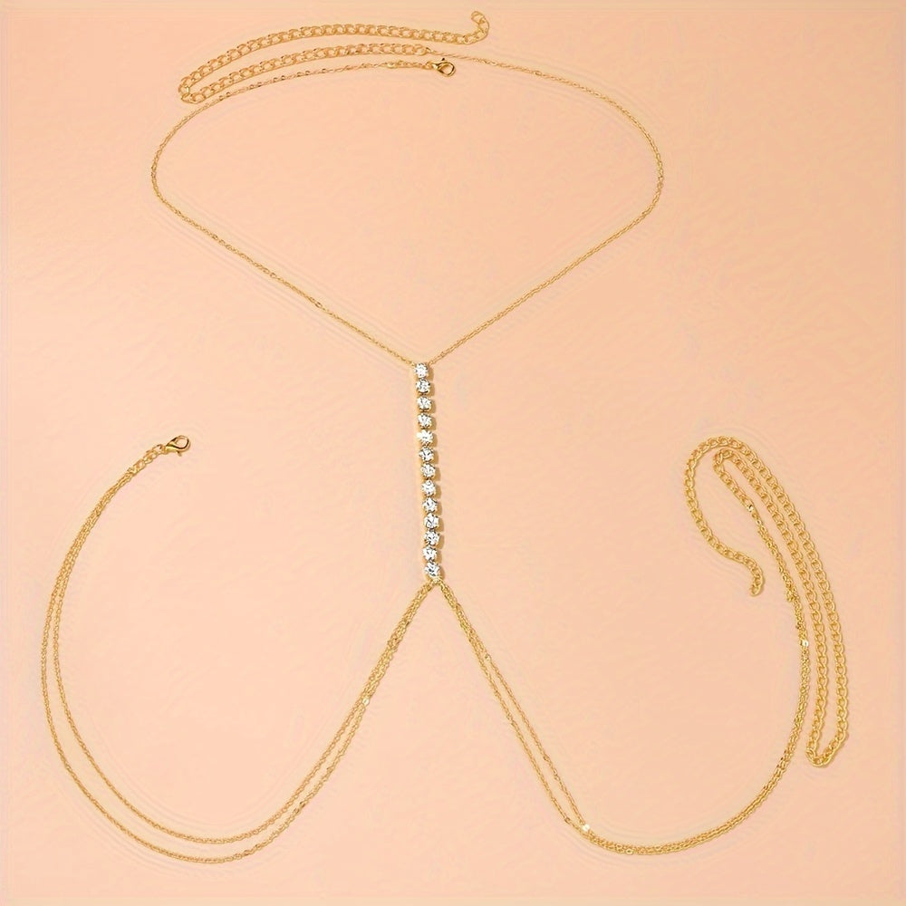 Add a touch of glamour to your beach or party outfit with this stunning golden tone body chain featuring sparkling glass bead accents. The adjustable design ensures a perfect fit for every body shape.