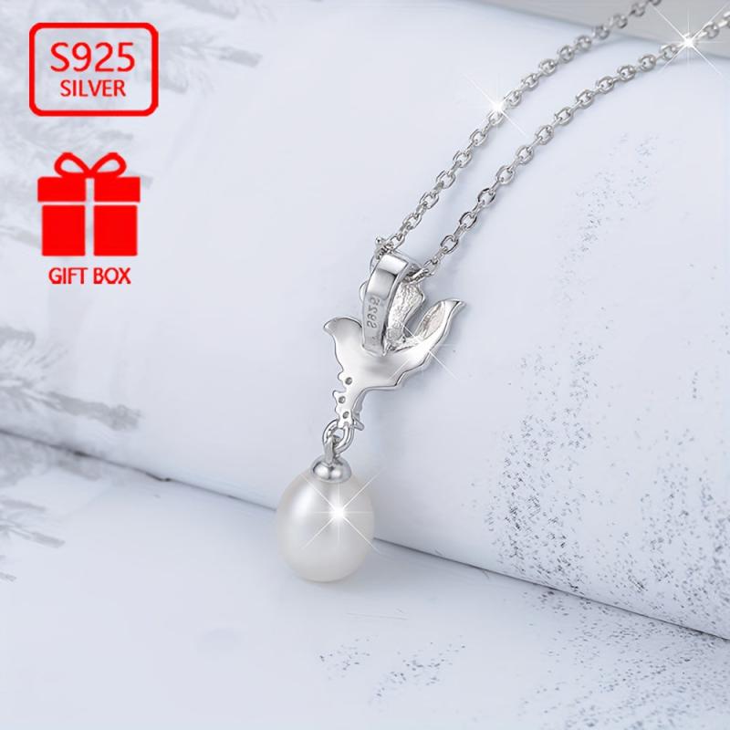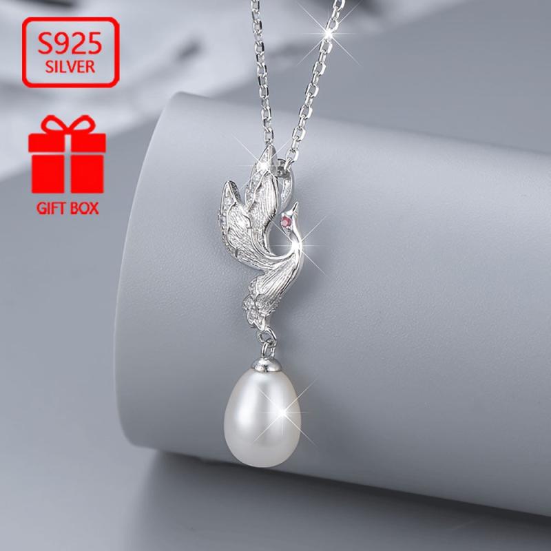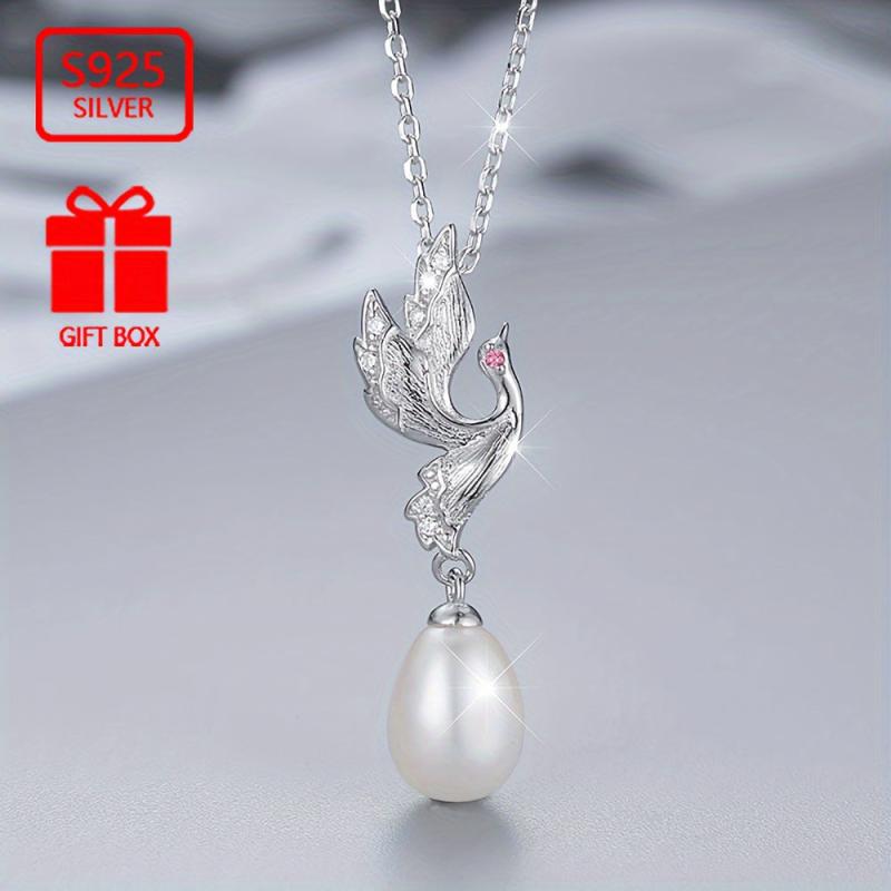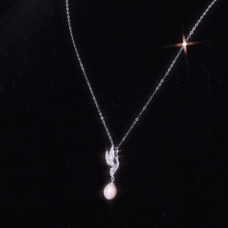 Elegant and sophisticated pearl pendant necklace with a silvery phoenix design.