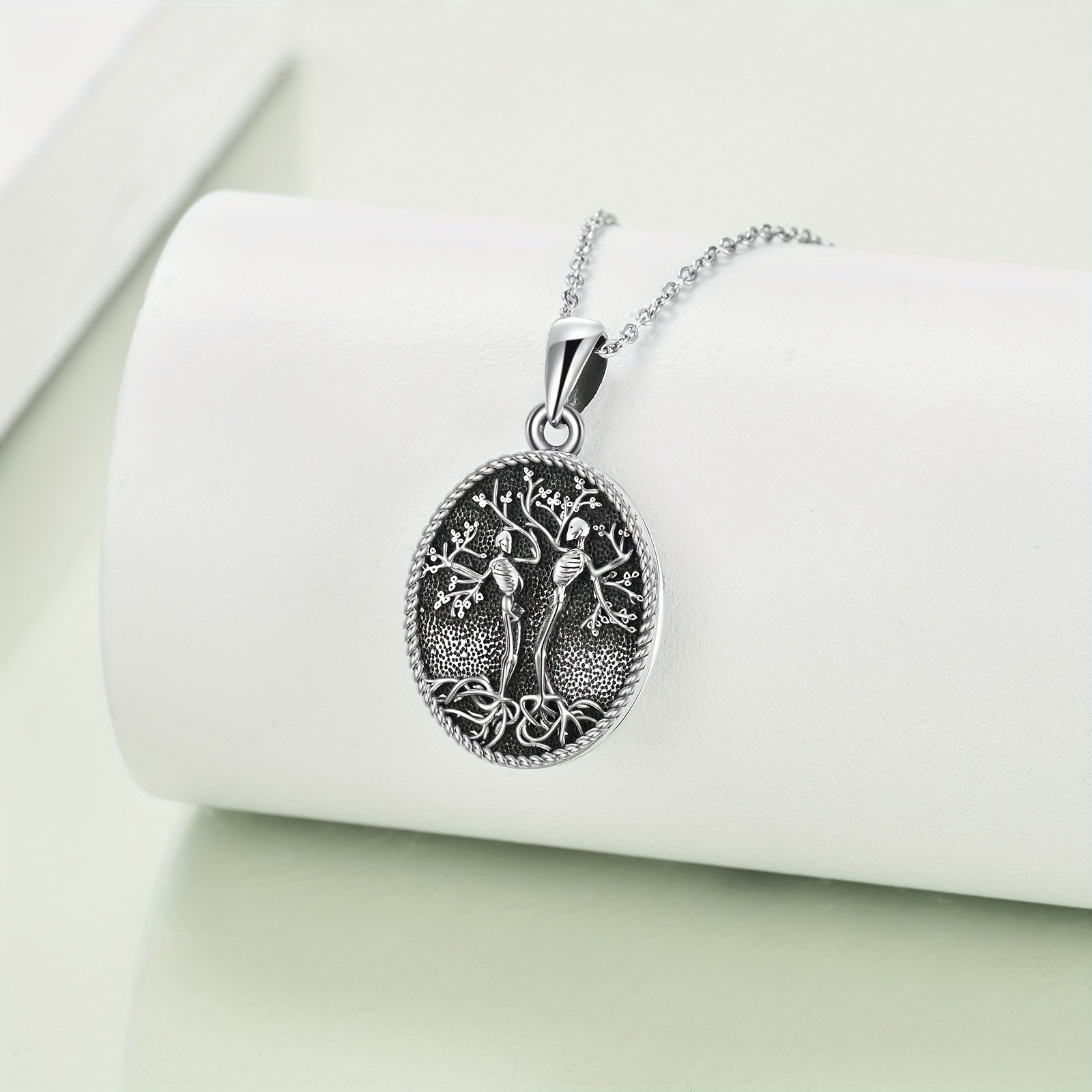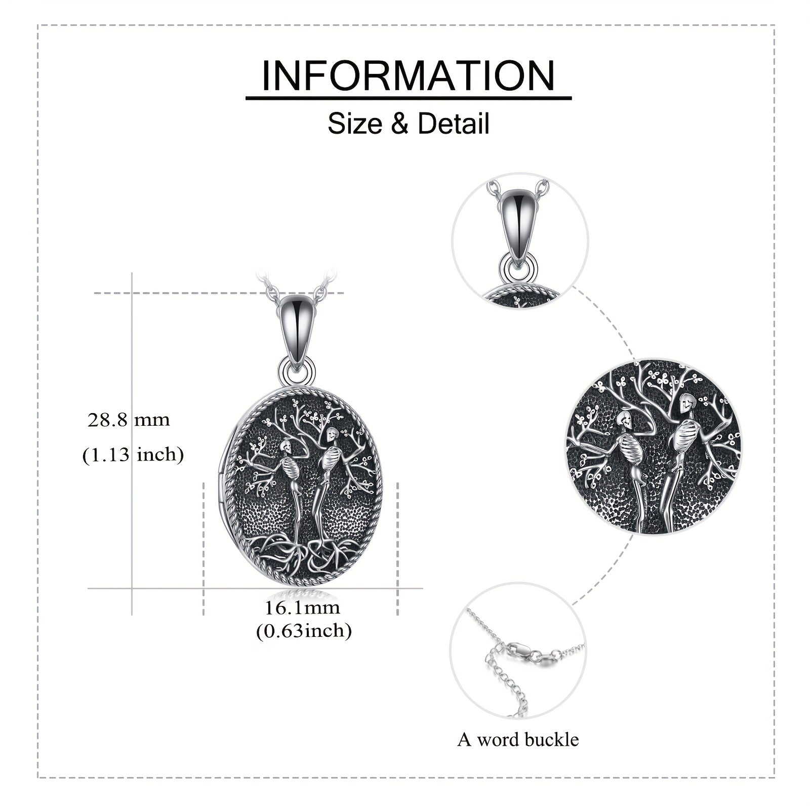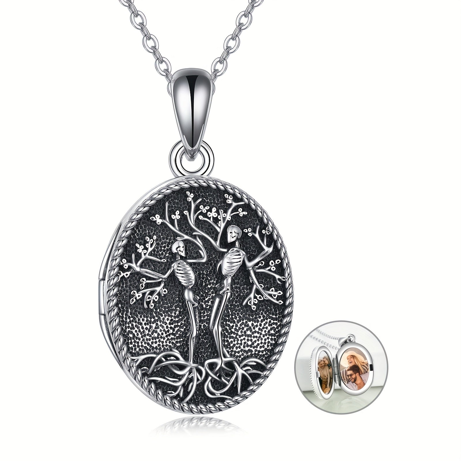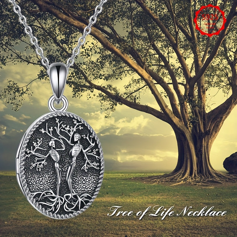 This sterling silver skull locket necklace features a unique Tree of Life design. It is perfect for Halloween or as a couple's pendant that holds pictures.