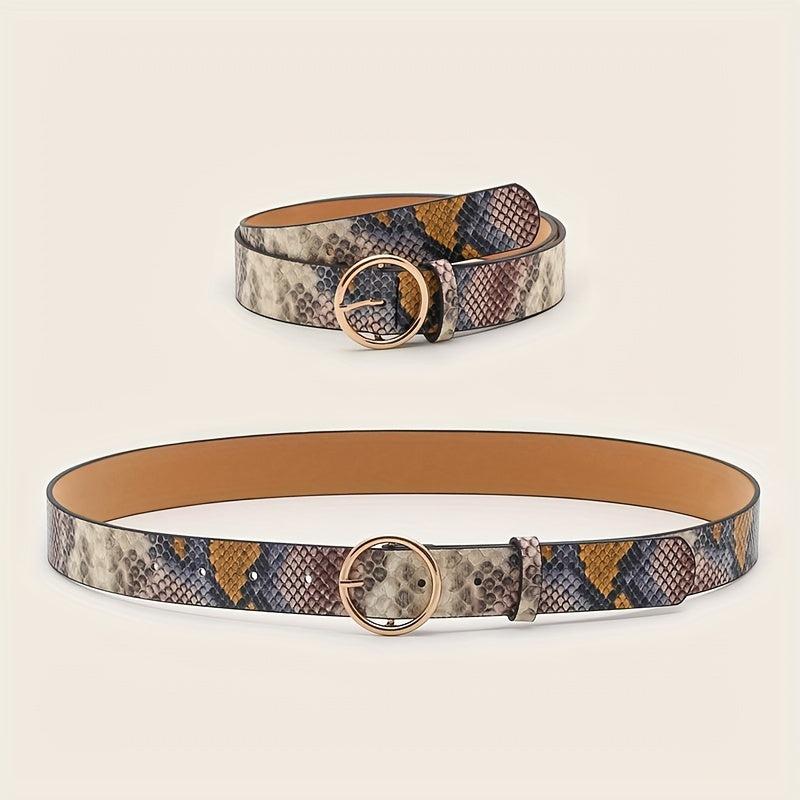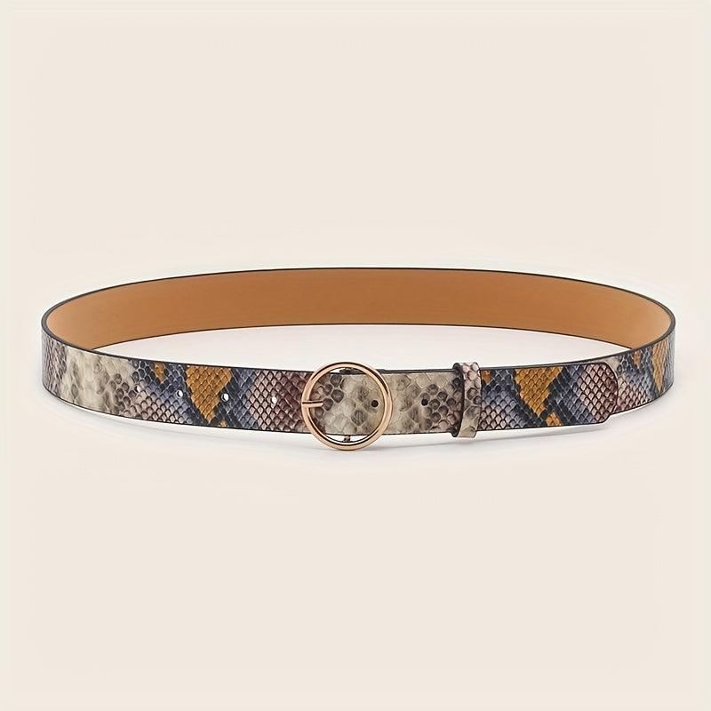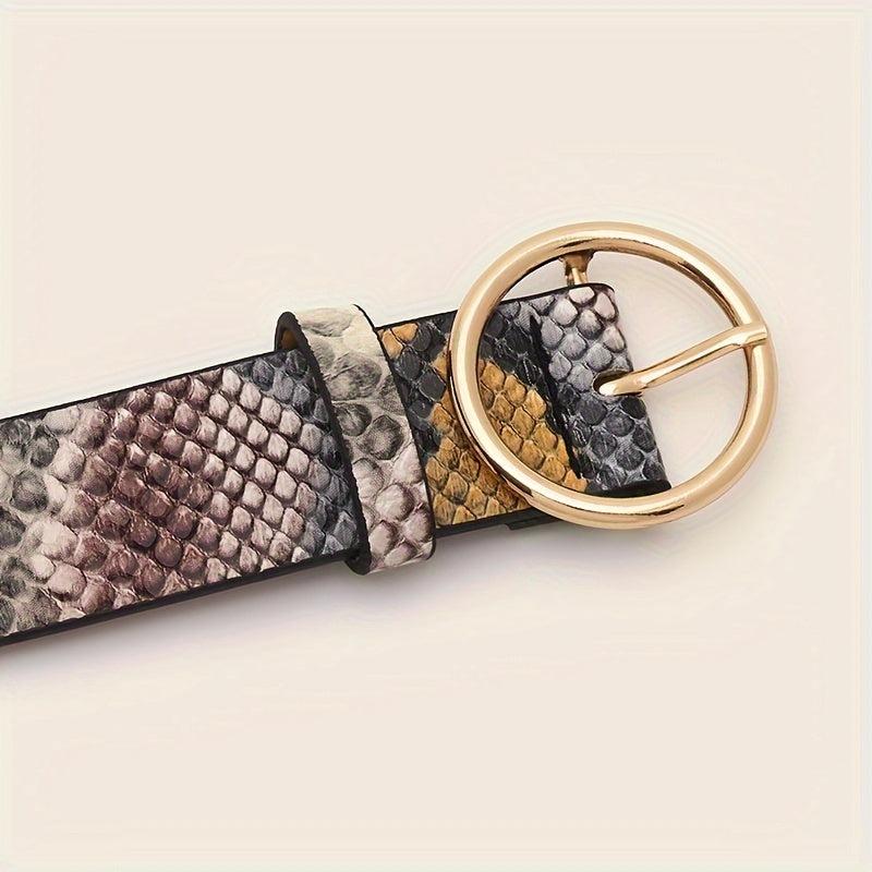 Add a touch of retro style to your outfits with this snake print belt featuring a metallic buckle. Perfect for pairing with jeans, dresses, or tops.