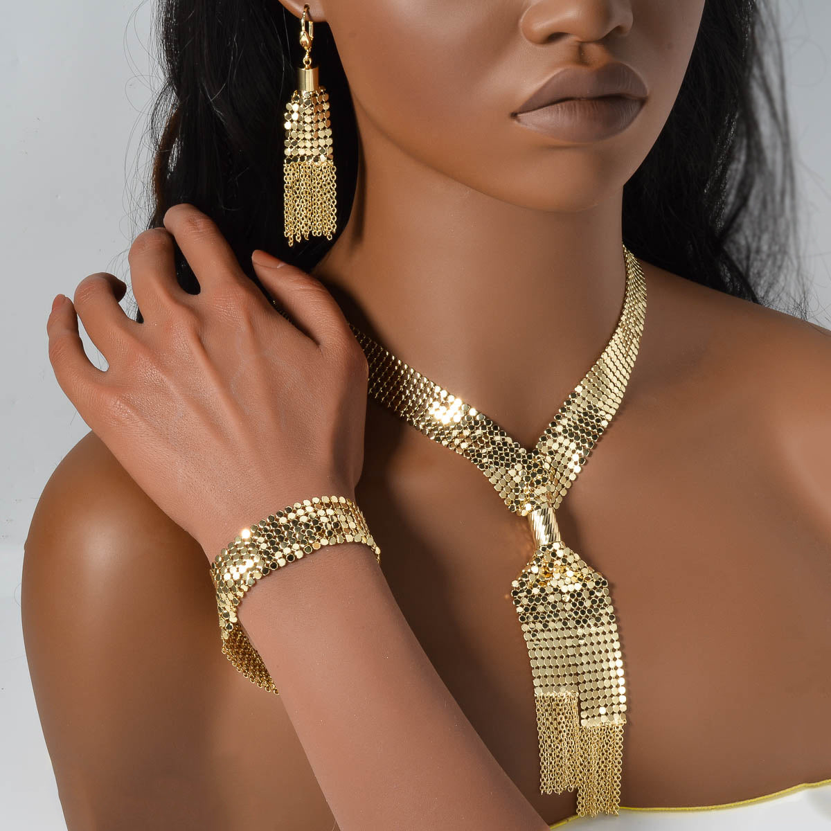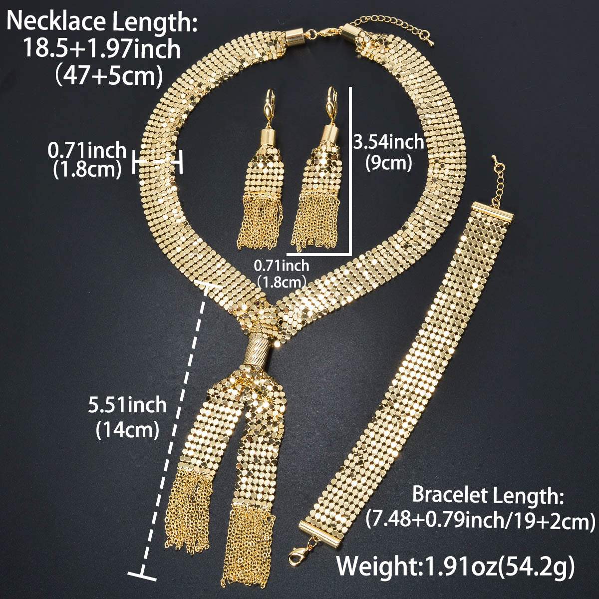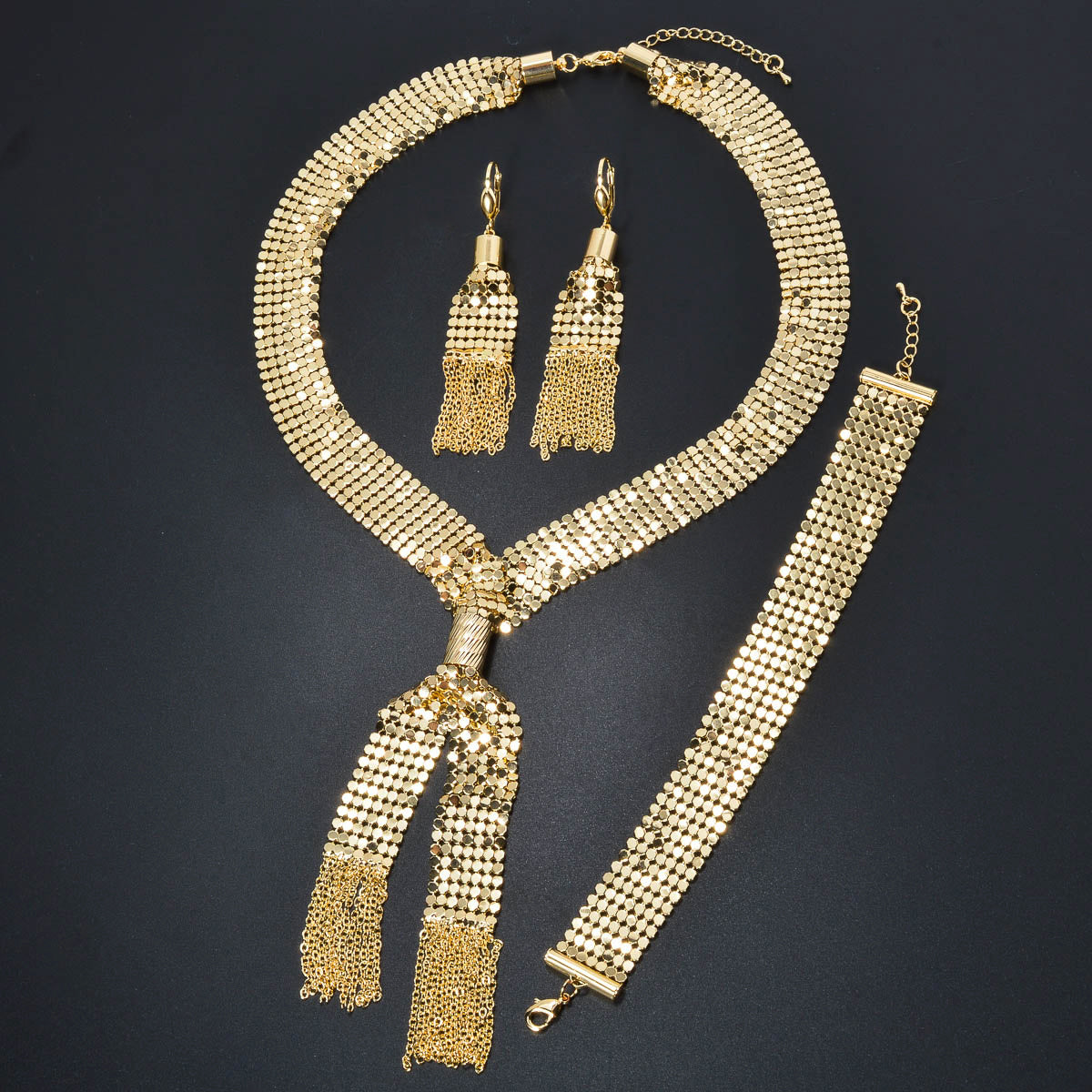 Add a touch of glamour with this blingbling three-piece set featuring a Y-shaped tassel necklace, bracelet, and earrings. The sparkling sequins will make you shine wherever you go.