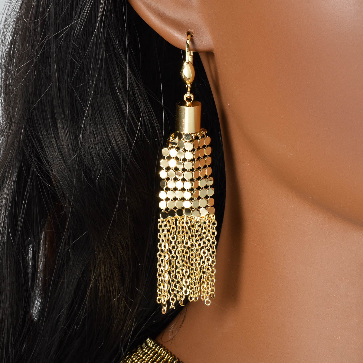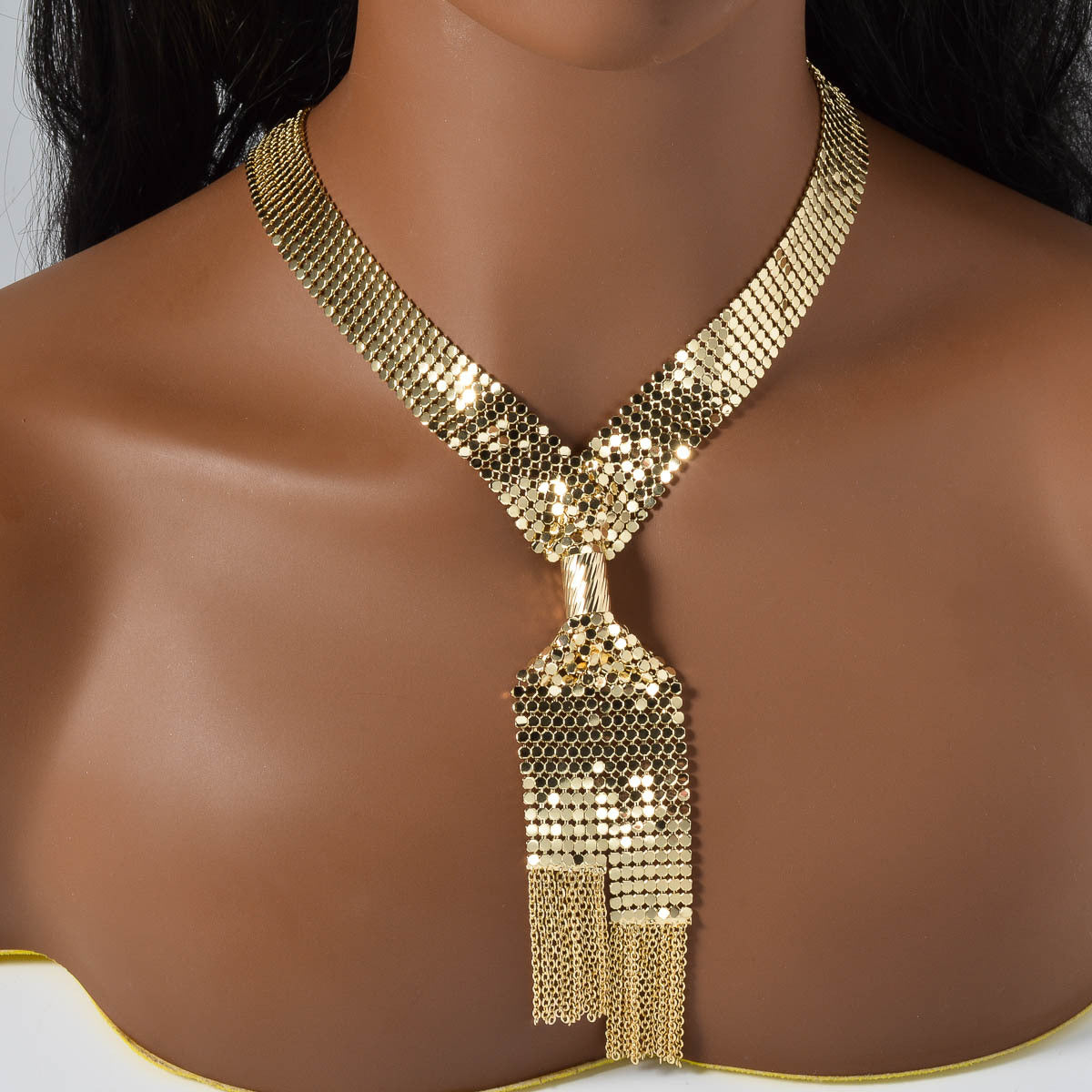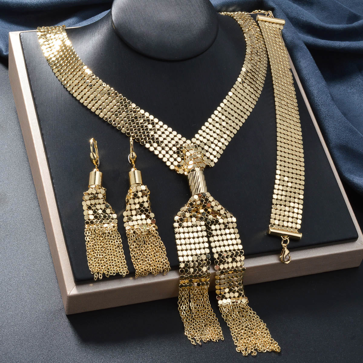 Add a touch of glamour with this blingbling three-piece set featuring a Y-shaped tassel necklace, bracelet, and earrings. The sparkling sequins will make you shine wherever you go.