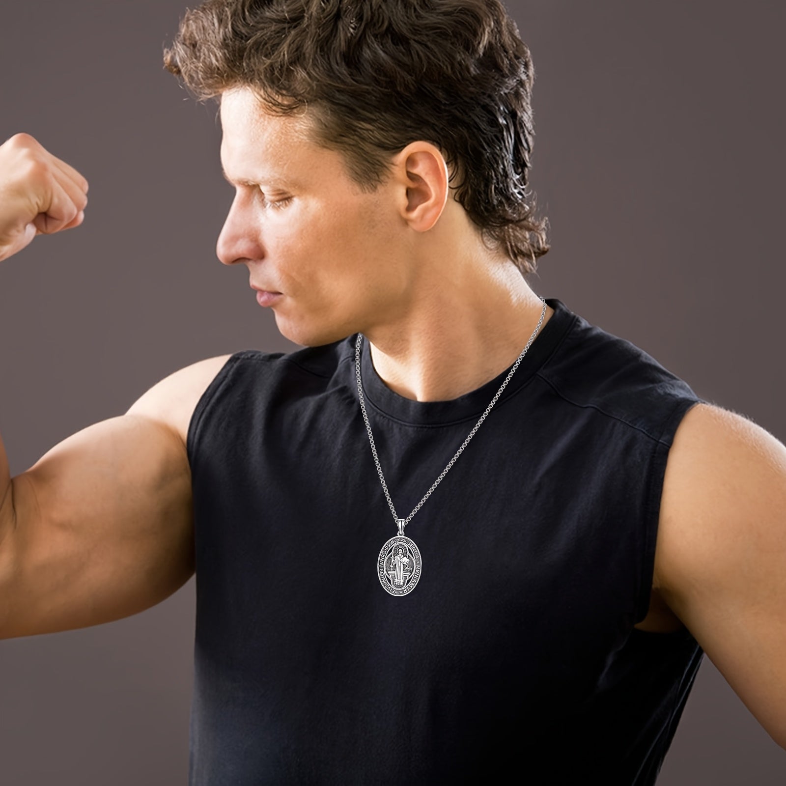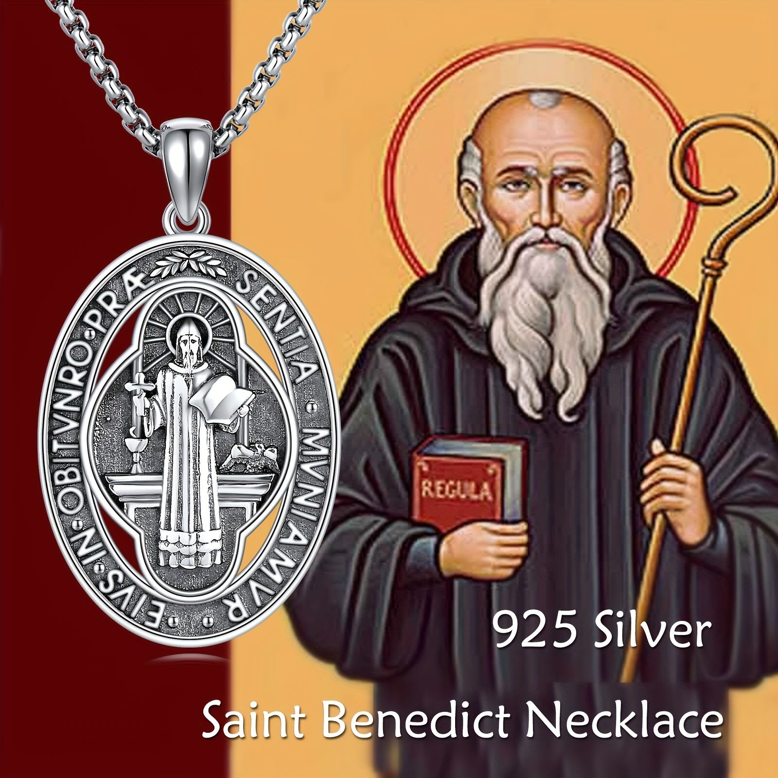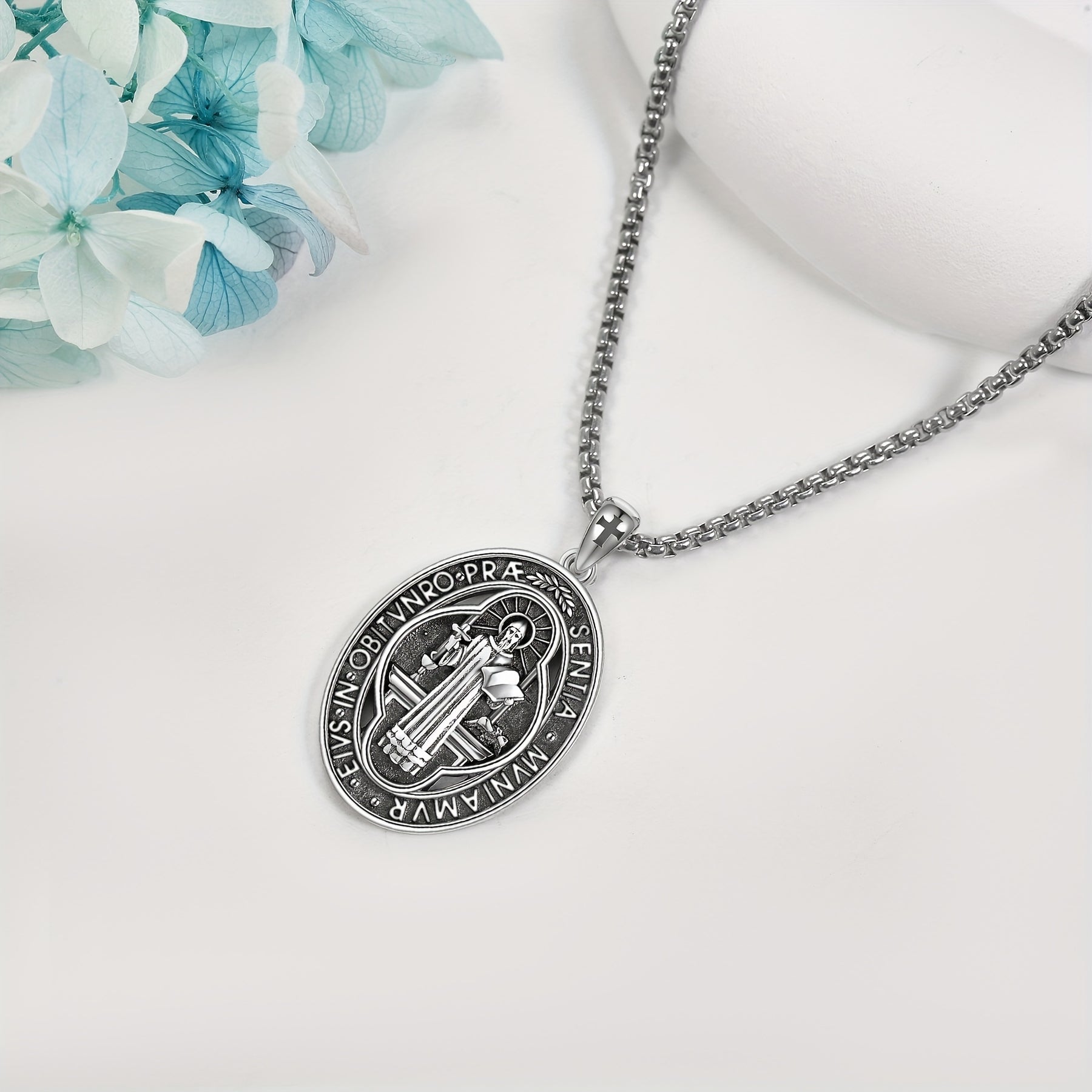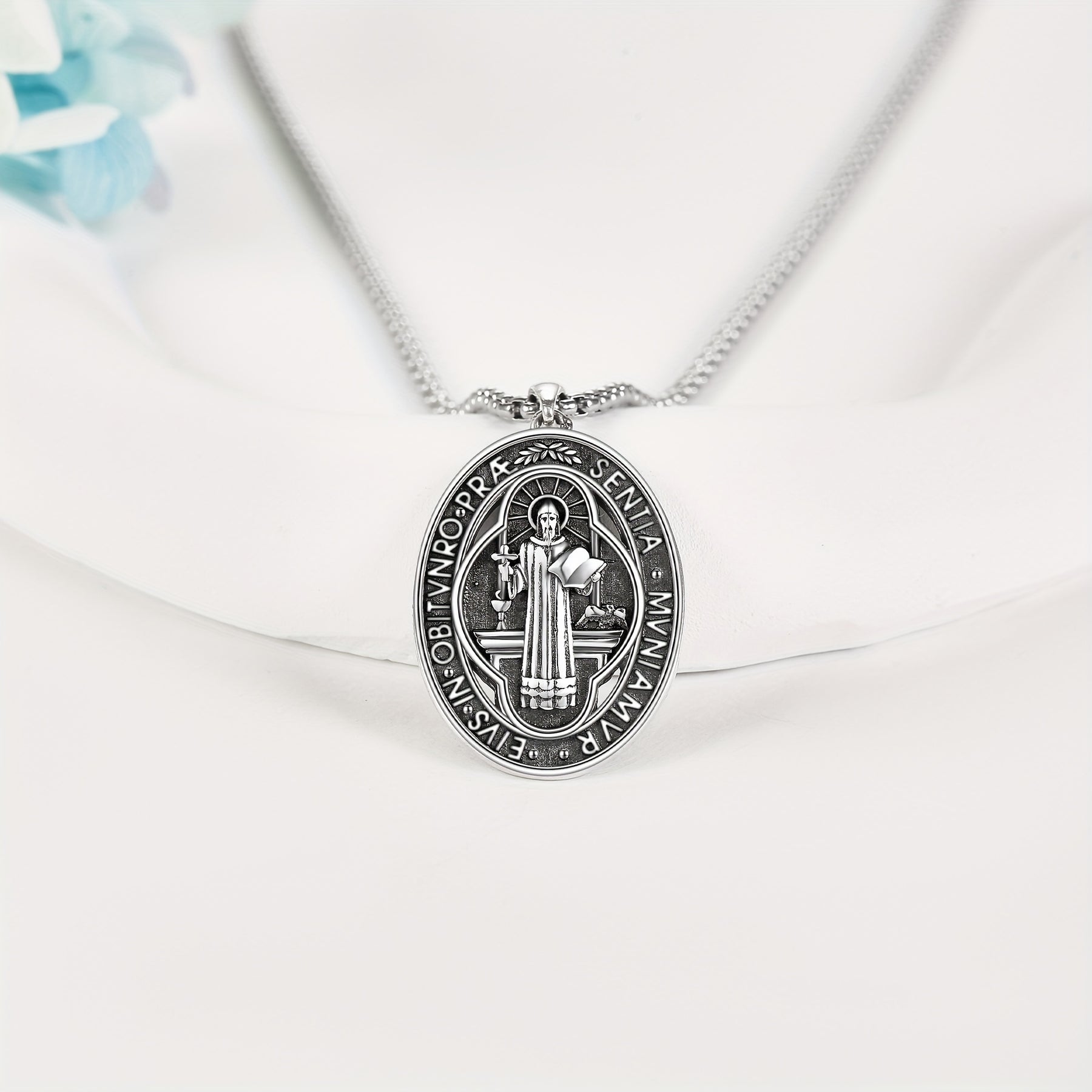 This St Benedict necklace is made of 925 sterling silver and features St Benedict medals. It is a perfect accessory for both men and women.