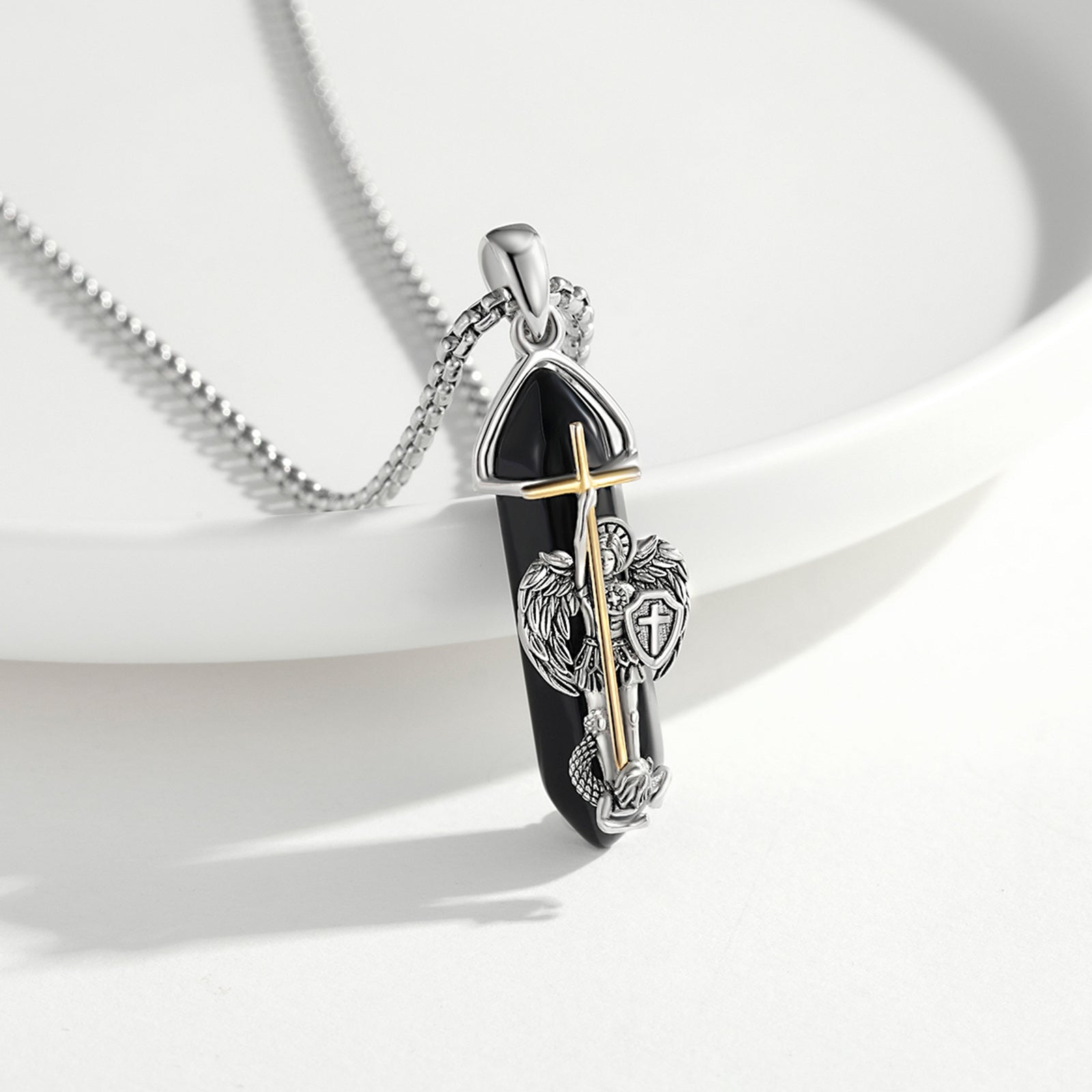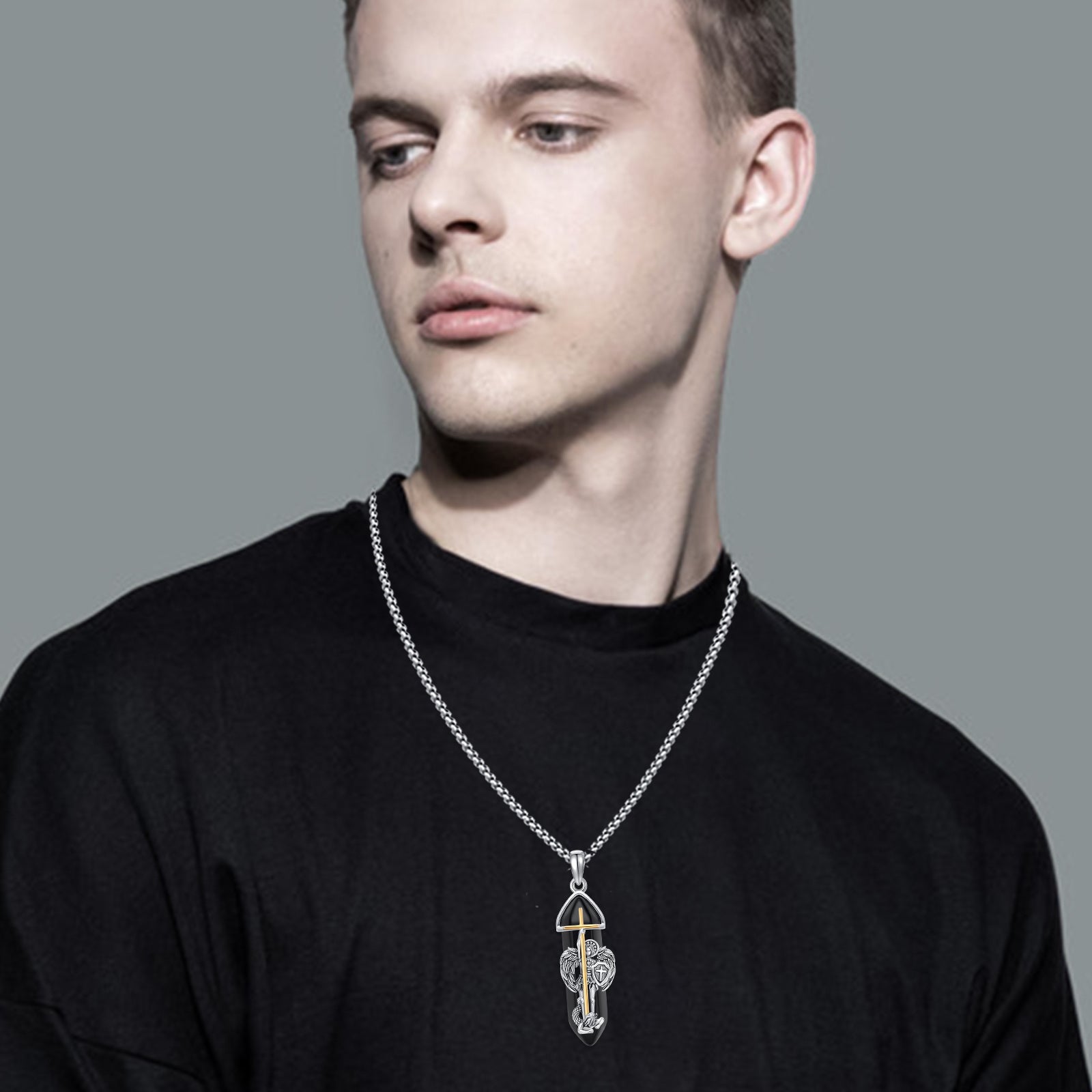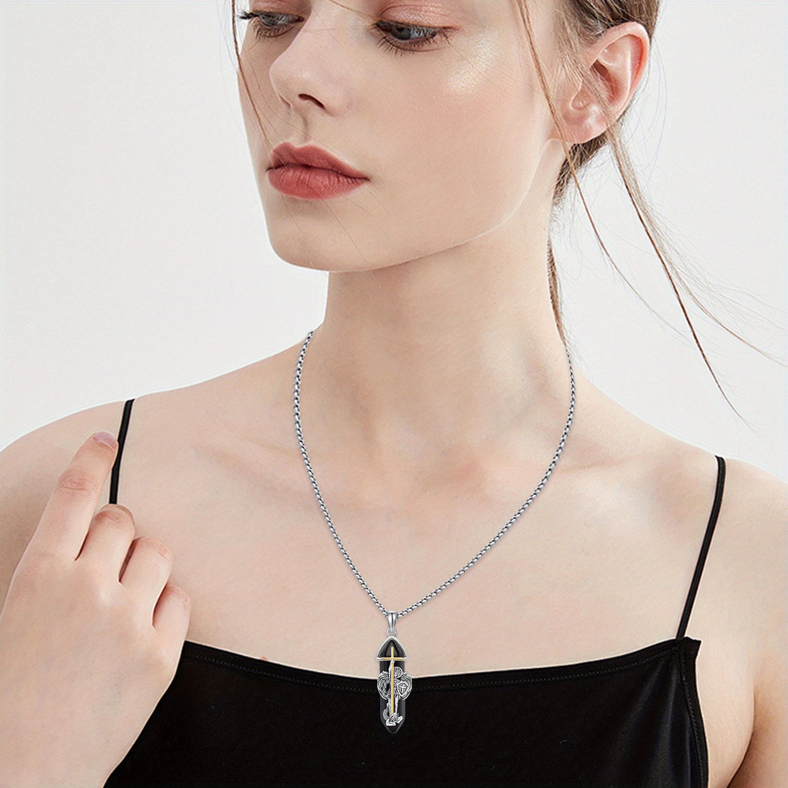 This stunning necklace features a healing stone and a religious cross pendant. Ideal for men and women seeking spiritual protection.