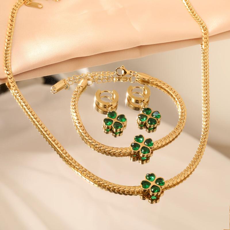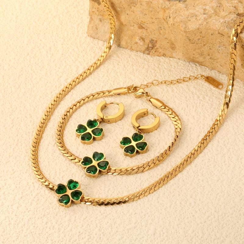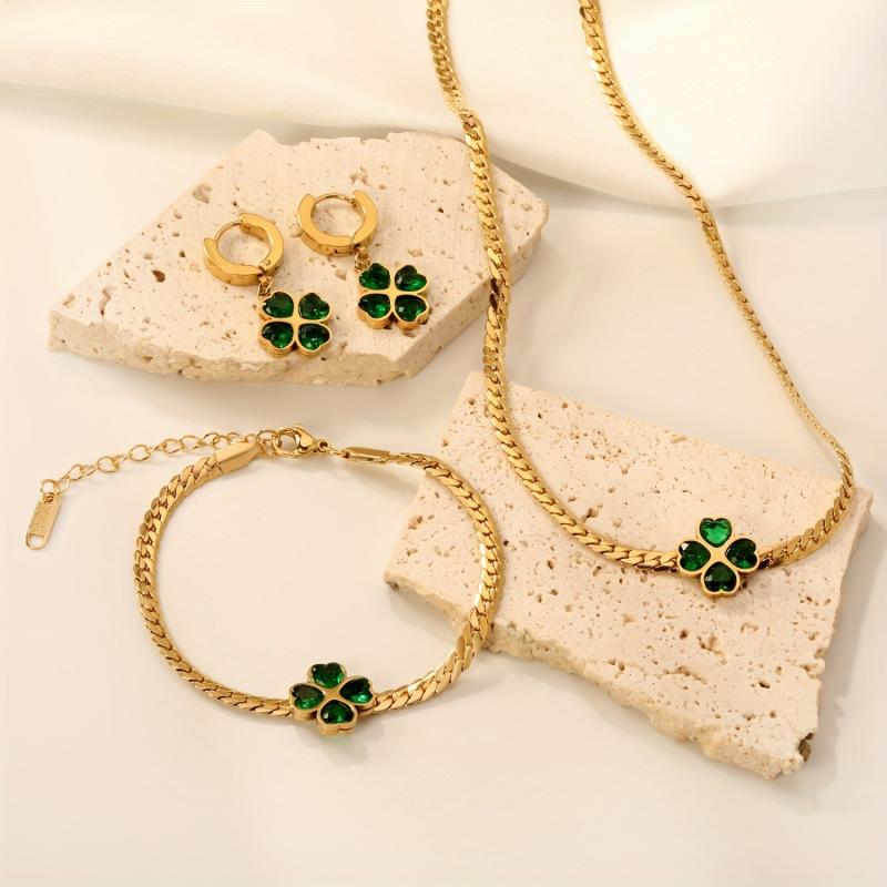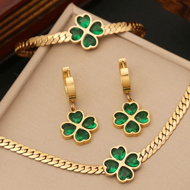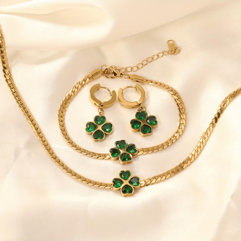 This 3-piece jewelry set includes a necklace, bracelet, and earrings featuring a green four leaf clover design with synthetic zirconia accents. Made of stainless steel for durability and style.