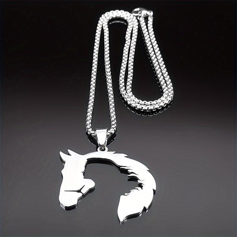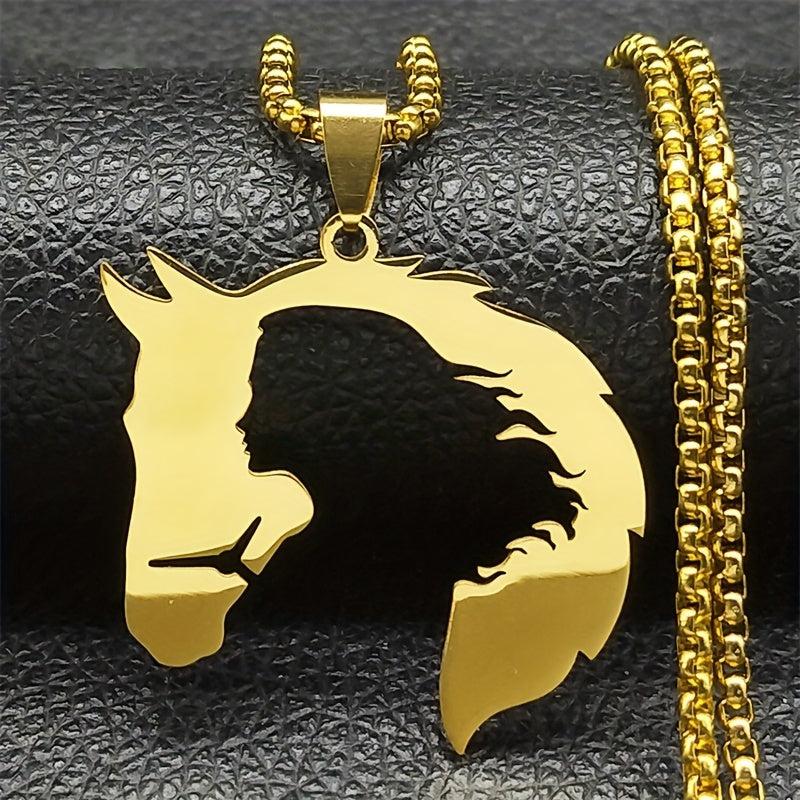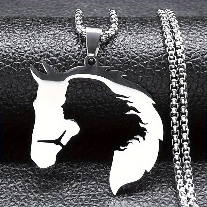 This silvery stainless steel necklace features a horse and girl silhouette design, ideal for daily wear and vacation.