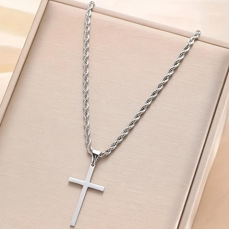 Fashionable and versatile stainless steel necklace featuring a golden twisted rope cross pendant. Perfect for hip hop couples.